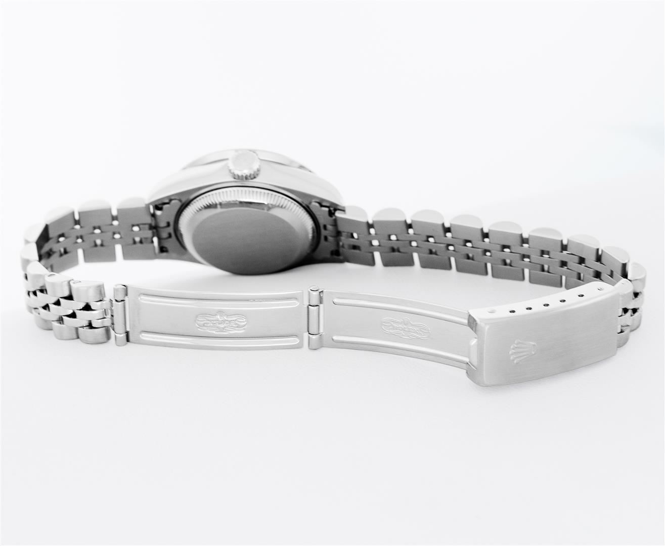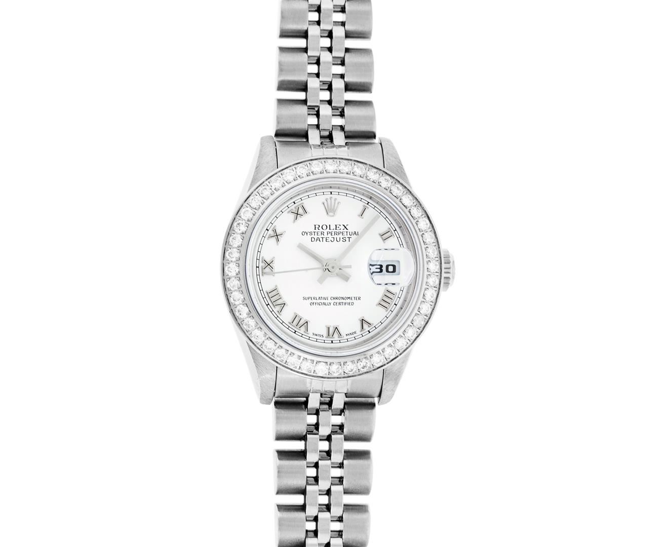 One Ladies Pre Owned Quickset Stainless Steel Rolex Datejust Polished Bright with Satin Finish, Serviced & Electronically Tested, Rolex Stainless Steel Case: 26mm. Rolex Stainless Steel Crown, Custom Bezel: New Stainless Steel Beadset Diamond Bezel, Stone Count: 32 Diamonds On Bezel, Diamond Color: G To H, Clarity: SI-VS. Custom Crystal: New Sapphire With Magnified Date Window. Custom Hands: New Hands. Rolex Movement: Quickset Automatic Winding Movement 2230. Rolex Dial: White Roman With Square Track. Date Window: 3 O'Clock Position Date Display, Model: Sapphire Quickset Datejust. Condition: G-6 Extra Fine. Rolex Bracelet: Stainless Steel Jubilee Band. Bright Polish & Satin Finish. 6.0 Inch Length, Adjustable. Standard Clasp, With Rolex Logo. This Watch Has Been Serviced Time Tested And Is In Excellent Condition It Is Free Of All Scratches And Dents.