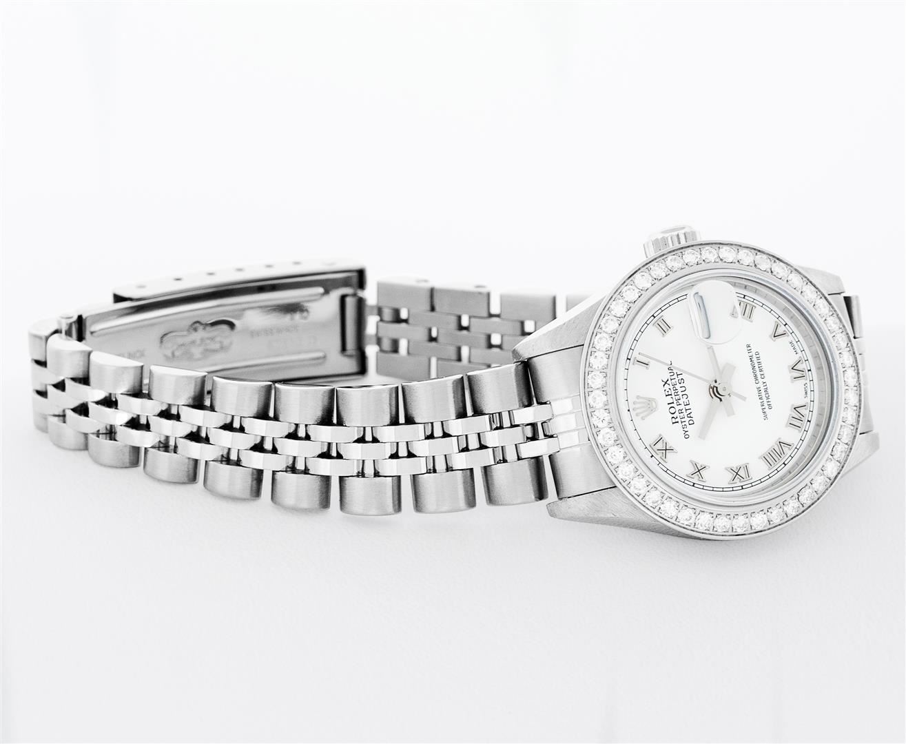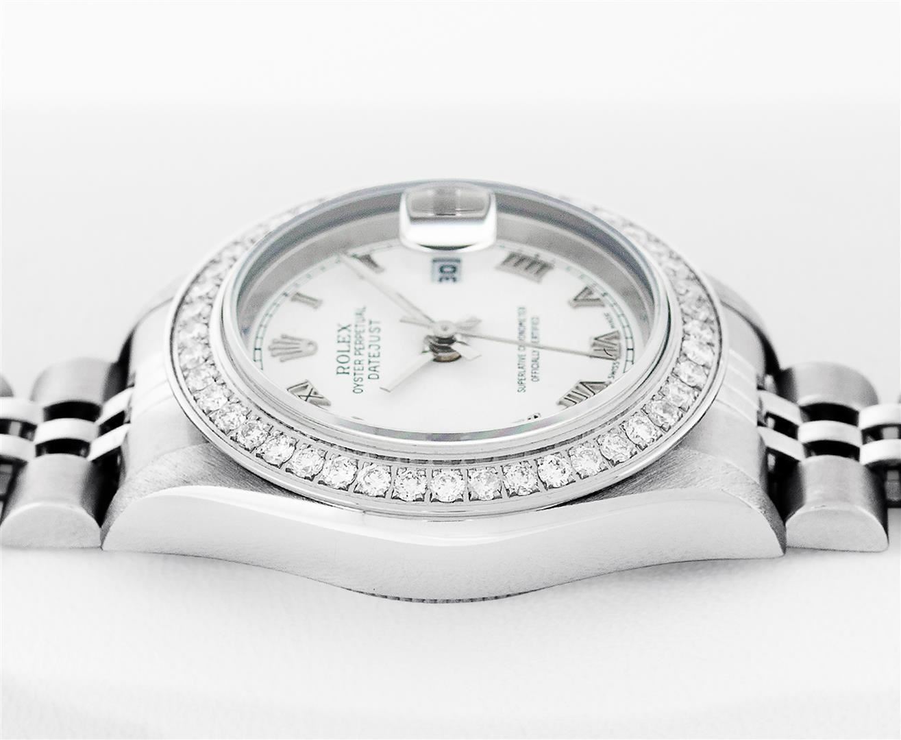 One Ladies Pre Owned Quickset Stainless Steel Rolex Datejust Polished Bright with Satin Finish, Serviced & Electronically Tested, Rolex Stainless Steel Case: 26mm. Rolex Stainless Steel Crown, Custom Bezel: New Stainless Steel Beadset Diamond Bezel, Stone Count: 32 Diamonds On Bezel, Diamond Color: G To H, Clarity: SI-VS. Custom Crystal: New Sapphire With Magnified Date Window. Custom Hands: New Hands. Rolex Movement: Quickset Automatic Winding Movement 2230. Rolex Dial: White Roman With Square Track. Date Window: 3 O'Clock Position Date Display, Model: Sapphire Quickset Datejust. Condition: G-6 Extra Fine. Rolex Bracelet: Stainless Steel Jubilee Band. Bright Polish & Satin Finish. 6.0 Inch Length, Adjustable. Standard Clasp, With Rolex Logo. This Watch Has Been Serviced Time Tested And Is In Excellent Condition It Is Free Of All Scratches And Dents.