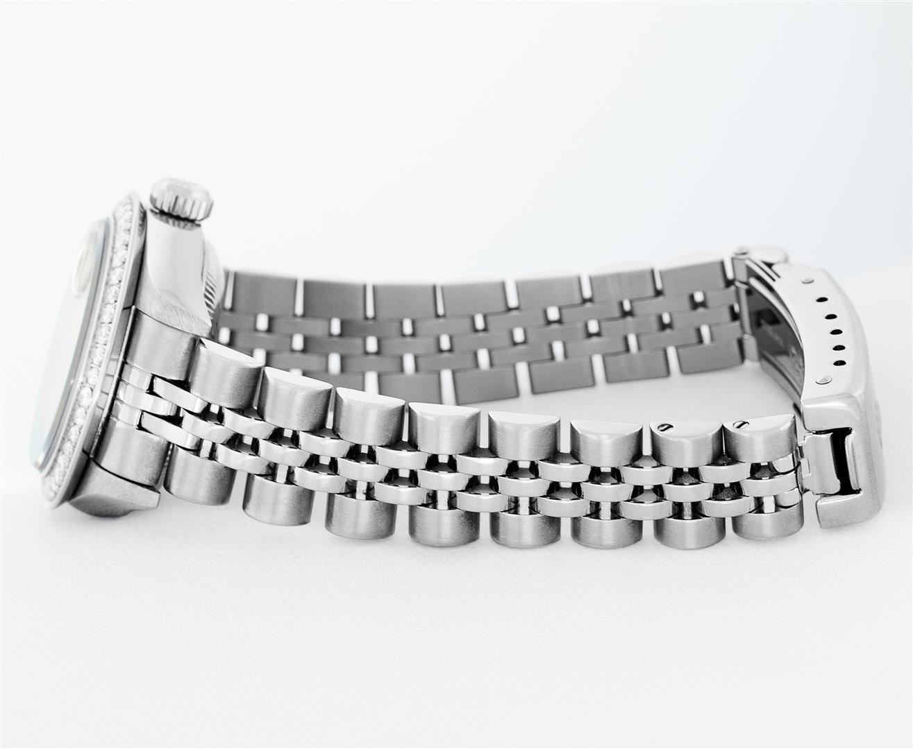 One Ladies Pre Owned Quickset Stainless Steel Rolex Datejust Polished Bright with Satin Finish, Serviced & Electronically Tested, Rolex Stainless Steel Case: 26mm. Rolex Stainless Steel Crown, Custom Bezel: New Stainless Steel Beadset Diamond Bezel, Stone Count: 32 Diamonds On Bezel, Diamond Color: G To H, Clarity: SI-VS. Custom Crystal: New Sapphire With Magnified Date Window. Custom Hands: New Hands. Rolex Movement: Quickset Automatic Winding Movement 2230. Rolex Dial: White Roman With Square Track. Date Window: 3 O'Clock Position Date Display, Model: Sapphire Quickset Datejust. Condition: G-6 Extra Fine. Rolex Bracelet: Stainless Steel Jubilee Band. Bright Polish & Satin Finish. 6.0 Inch Length, Adjustable. Standard Clasp, With Rolex Logo. This Watch Has Been Serviced Time Tested And Is In Excellent Condition It Is Free Of All Scratches And Dents.