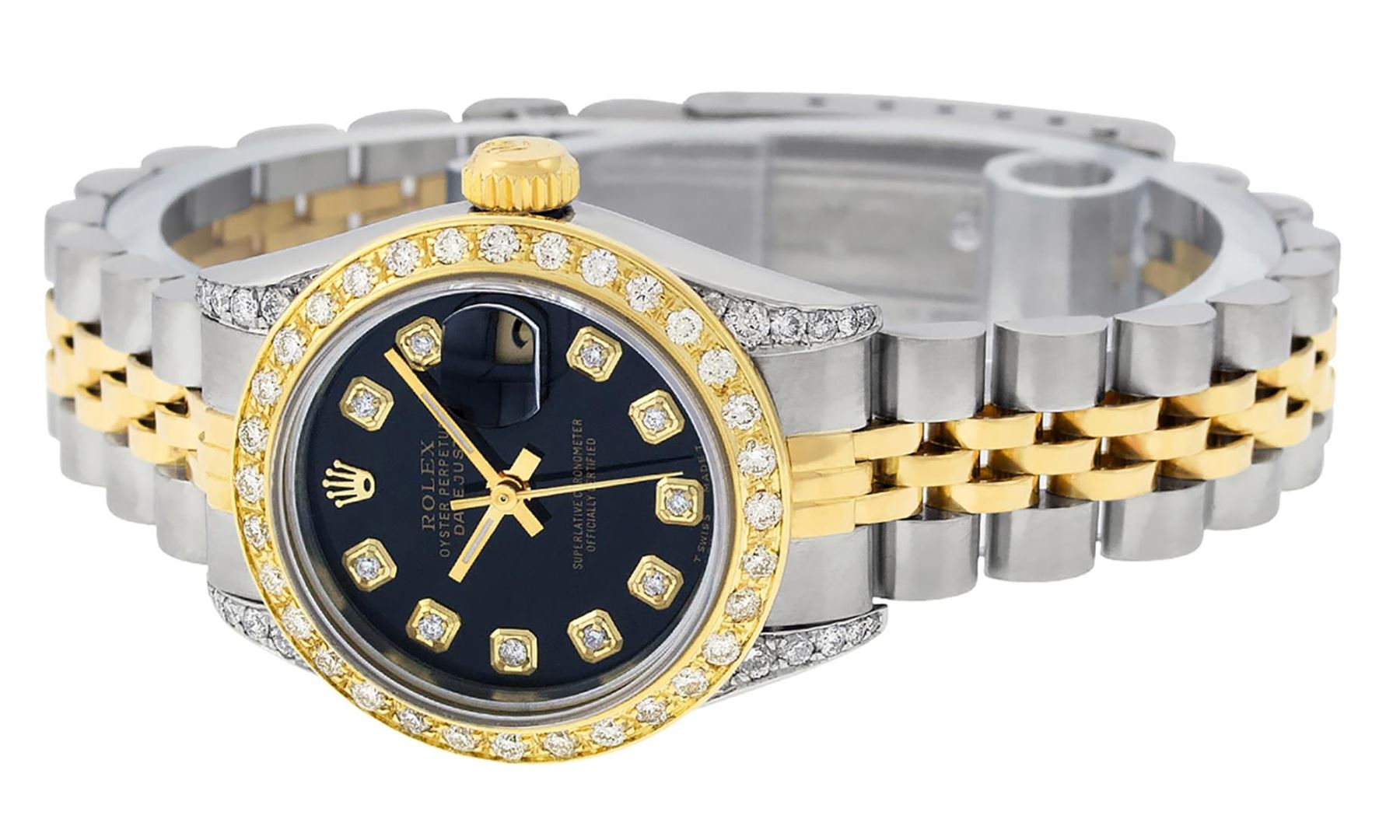 One Ladies Pre Owned Quickset 18K Yellow Gold And Stainless Steel Rolex Datejust Polished, Serviced And Electronically Tested, 18K Yellow Gold And Stainless Steel Case: 26mm, 18K Yellow Gold Crown, Custom Diamond Lugs: 24 Added Diamonds On Lugs. Custom Bezel: New 18K Yellow Gold Beadset Diamond Bezel, Diamond Count: 32 Diamonds On Bezel. Custom Crystal: New Sapphire With Date Window. Custom Hands: New Luminescent Hands. Rolex Movement: Automatic Winding Movement 2235. Custom Dial: Custom Black Dial With Added Diamond Hour Markers, Diamond Count: 10 Diamonds On Dial. Date Window: 3 O'Clock Position Date Display, Model: Quickset Datejust. Condition: G-6 Extra Fine. Rolex Bracelet: Two Tone 18K Yellow Gold And Stainless Steel Jubilee Band. Bright Polish. 6.0 Inch Length, Adjustable. Standard Clasp, With Rolex Logo. This Watch Has Been Serviced Time Tested And Is In Excellent Condition It Is Free Of All Scratches And Dents.