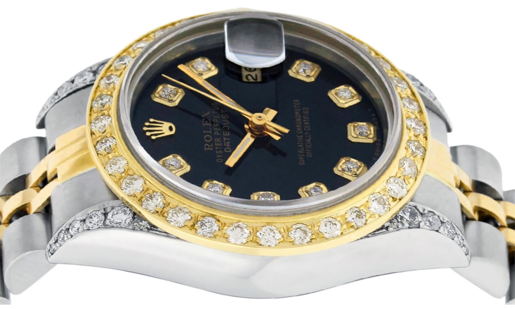 One Ladies Pre Owned Quickset 18K Yellow Gold And Stainless Steel Rolex Datejust Polished, Serviced And Electronically Tested, 18K Yellow Gold And Stainless Steel Case: 26mm, 18K Yellow Gold Crown, Custom Diamond Lugs: 24 Added Diamonds On Lugs. Custom Bezel: New 18K Yellow Gold Beadset Diamond Bezel, Diamond Count: 32 Diamonds On Bezel. Custom Crystal: New Sapphire With Date Window. Custom Hands: New Luminescent Hands. Rolex Movement: Automatic Winding Movement 2235. Custom Dial: Custom Black Dial With Added Diamond Hour Markers, Diamond Count: 10 Diamonds On Dial. Date Window: 3 O'Clock Position Date Display, Model: Quickset Datejust. Condition: G-6 Extra Fine. Rolex Bracelet: Two Tone 18K Yellow Gold And Stainless Steel Jubilee Band. Bright Polish. 6.0 Inch Length, Adjustable. Standard Clasp, With Rolex Logo. This Watch Has Been Serviced Time Tested And Is In Excellent Condition It Is Free Of All Scratches And Dents.