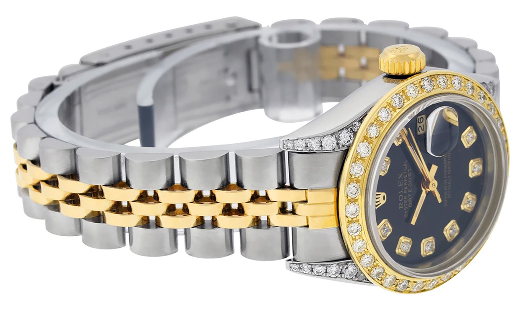 One Ladies Pre Owned Quickset 18K Yellow Gold And Stainless Steel Rolex Datejust Polished, Serviced And Electronically Tested, 18K Yellow Gold And Stainless Steel Case: 26mm, 18K Yellow Gold Crown, Custom Diamond Lugs: 24 Added Diamonds On Lugs. Custom Bezel: New 18K Yellow Gold Beadset Diamond Bezel, Diamond Count: 32 Diamonds On Bezel. Custom Crystal: New Sapphire With Date Window. Custom Hands: New Luminescent Hands. Rolex Movement: Automatic Winding Movement 2235. Custom Dial: Custom Black Dial With Added Diamond Hour Markers, Diamond Count: 10 Diamonds On Dial. Date Window: 3 O'Clock Position Date Display, Model: Quickset Datejust. Condition: G-6 Extra Fine. Rolex Bracelet: Two Tone 18K Yellow Gold And Stainless Steel Jubilee Band. Bright Polish. 6.0 Inch Length, Adjustable. Standard Clasp, With Rolex Logo. This Watch Has Been Serviced Time Tested And Is In Excellent Condition It Is Free Of All Scratches And Dents.