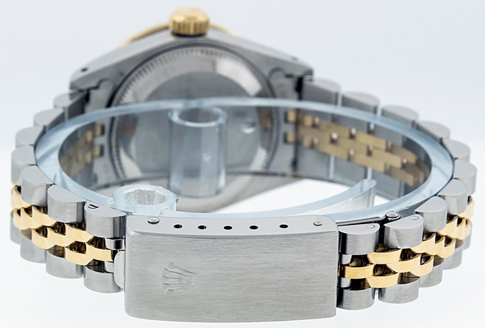 One Ladies Pre Owned Quickset Two Tone 18K Yellow Gold And Stainless Steel Rolex Datejust Polished, Serviced And Electronically Tested, Yellow Gold And Stainless Steel Case: 26mm, Yellow Gold Crown, Custom Bezel: New 18K 1ctw Yellow Gold Beadset Diamond Bezel, Diamond Count: 44 Diamonds, Total Weight 1.00 Carat. Custom Crystal: New Sapphire With Magnified Date Window. Custom Hands: New Luminescent Hands. Rolex Movement: Automatic Winding Movement 2135. Custom Dial: Custom Black Dial With Added Diamond Hour Markers, Diamond Count: 43 Single Cut Diamonds in Dial. Date Window: 3 O'Clock Position Date Display, Model: Quickset Datejust, Condition: G-6 Extra Fine. Rolex Bracelet: Two Tone Yellow Gold And Stainless Steel Jubilee Band. Bright Polish. 6.0 Inch Length, Adjustable. Standard Clasp, With Rolex Logo. This Watch Has Been Serviced Time Tested And Is In Excellent Condition It Is Free Of All Scratches And Dents.