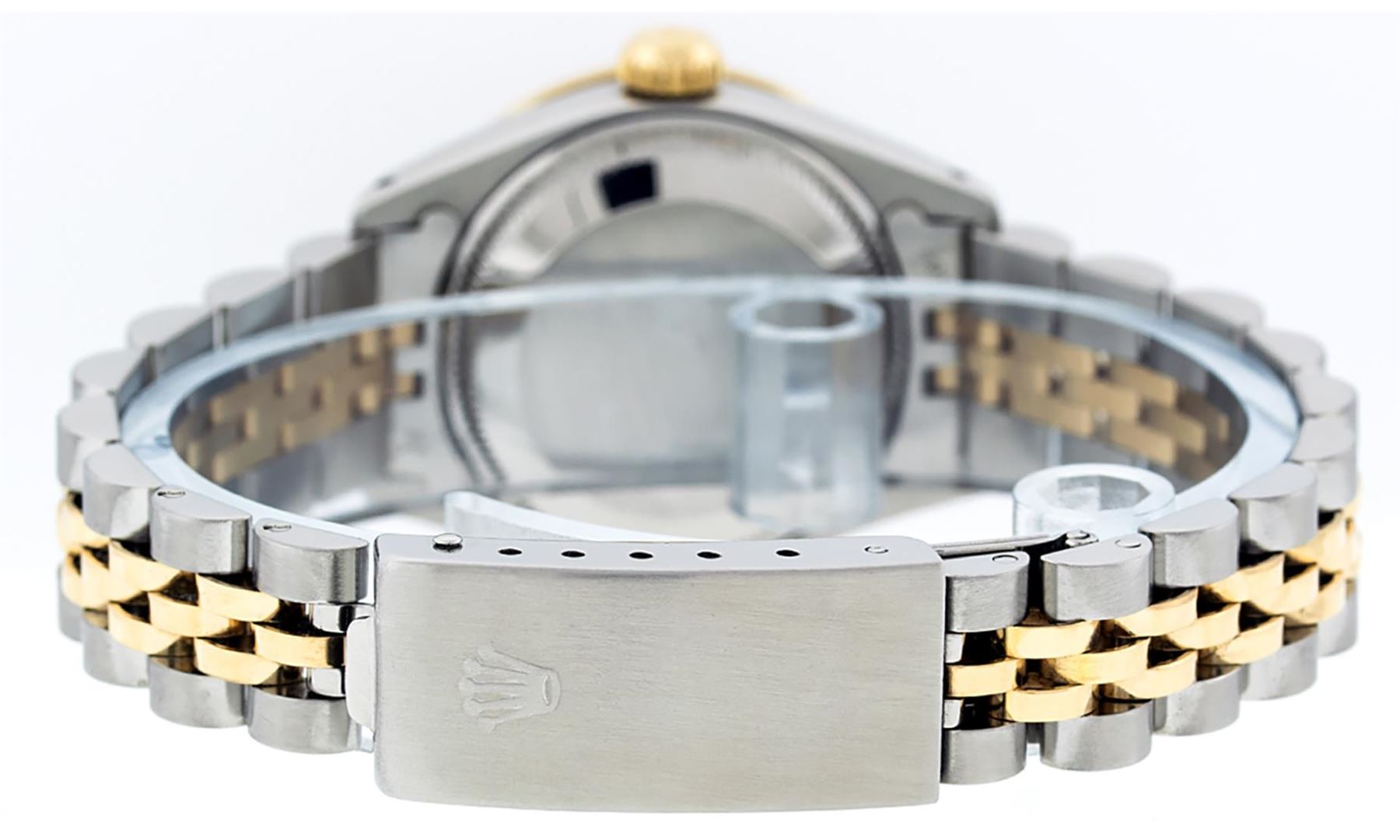 One Ladies Pre Owned Quickset Two Tone 18K Yellow Gold And Stainless Steel Rolex Datejust Polished, Serviced And Electronically Tested, Yellow Gold And Stainless Steel Case: 26mm, Yellow Gold Crown, Custom Bezel: New 18K Yellow Gold Beadset Diamond Bezel, Diamond Count: 32 Diamonds. Custom Crystal: New Sapphire With Magnified Date Window. Custom Hands: New Luminescent Hands. Rolex Movement: Automatic Winding Movement 2135. Custom Dial: Custom Champagne Dial With Added Diamonds, Diamond Count: 43 Diamonds. Date Window: 3 O'Clock Position Date Display, Model: Quickset Datejust. Condition: G-6 Extra Fine. Rolex Bracelet: Two Tone Yellow Gold And Stainless Steel Jubilee Band. Bright Polish. 6.0 Inch Length, Adjustable. Standard Clasp, With Rolex Logo. This Watch Has Been Serviced Time Tested And Is In Excellent Condition It Is Free Of All Scratches And Dents.