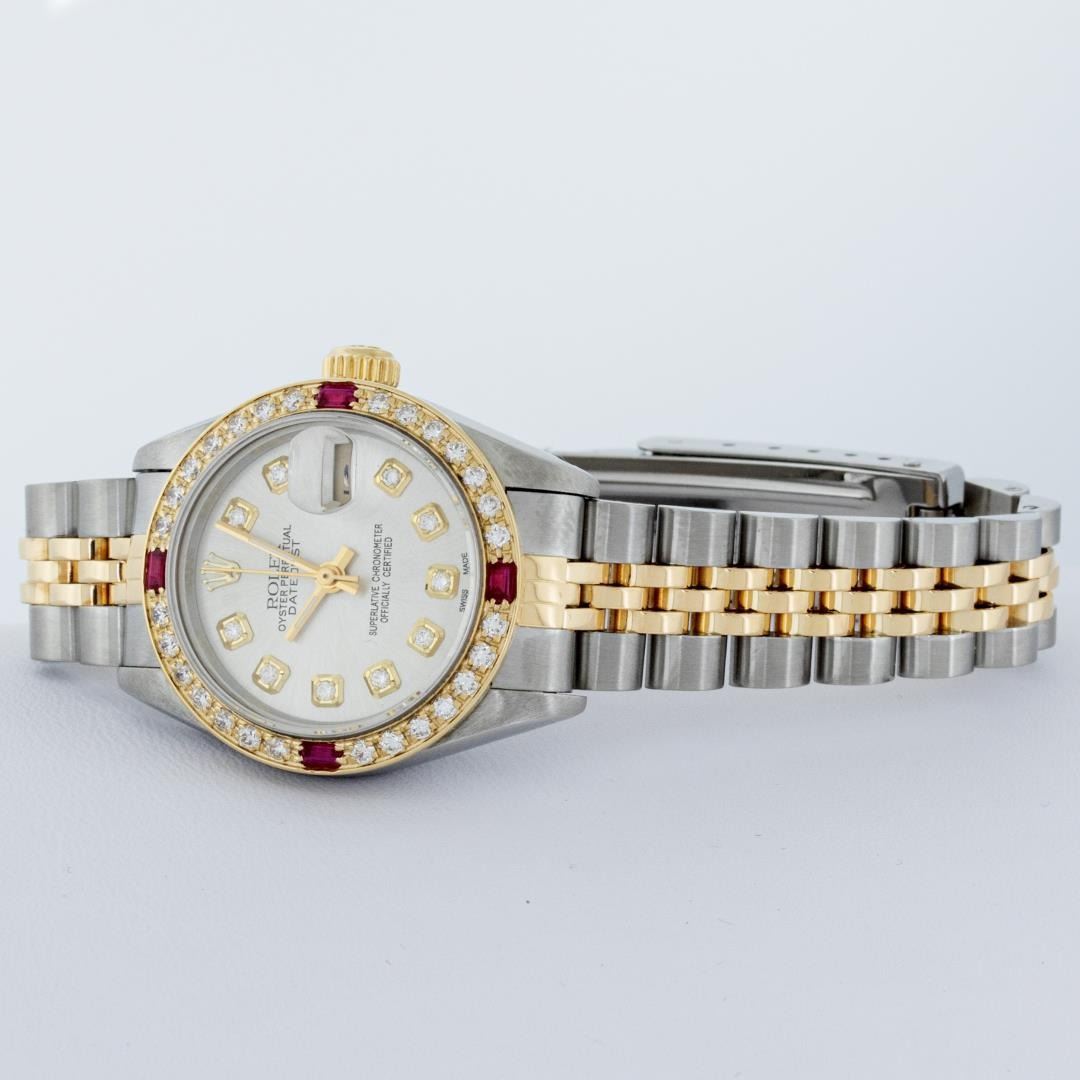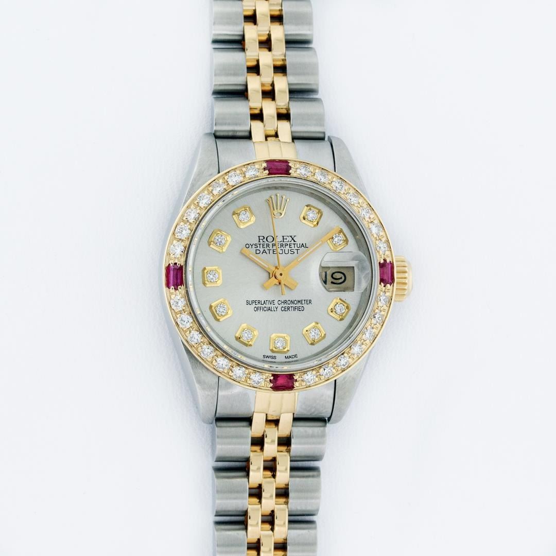 One Ladies Pre Owned Rolex Quickset Two Tone 18K Yellow Gold And Stainless Steel Datejust Polished, Serviced & Electronically Tested, Rolex Yellow Gold And Stainless Steel Case: 26mm, Rolex Yellow Gold Crown, Custom Bezel: New 18K Yellow Gold Ruby Beadset Diamond Bezel, Diamond + Gem Count: 28 Diamonds + 4 Rubies. Custom Crystal: New Sapphire With Magnified Date. Custom Hands: New Luminescent Hands. Rolex Movement: Automatic Winding Movement 2135. Custom Dial: Custom Silver Diamond With Added Diamond Hour Markers, Diamond Count: 10 Diamonds On Dial. Date Window: 3 O'Clock Position Date Display, Model: Quickset Datejust, Condition: G-6 Extra Fine. Rolex Bracelet: Two Tone Yellow Gold & Stainless Steel Jubilee. Bright Polish. 6.0 Inch Length, Adjustable. Standard Clasp, With Rolex Logo. This Watch Has Been Serviced Time Tested And Is In Excellent Condition It Is Free Of All Scratches And Dents.