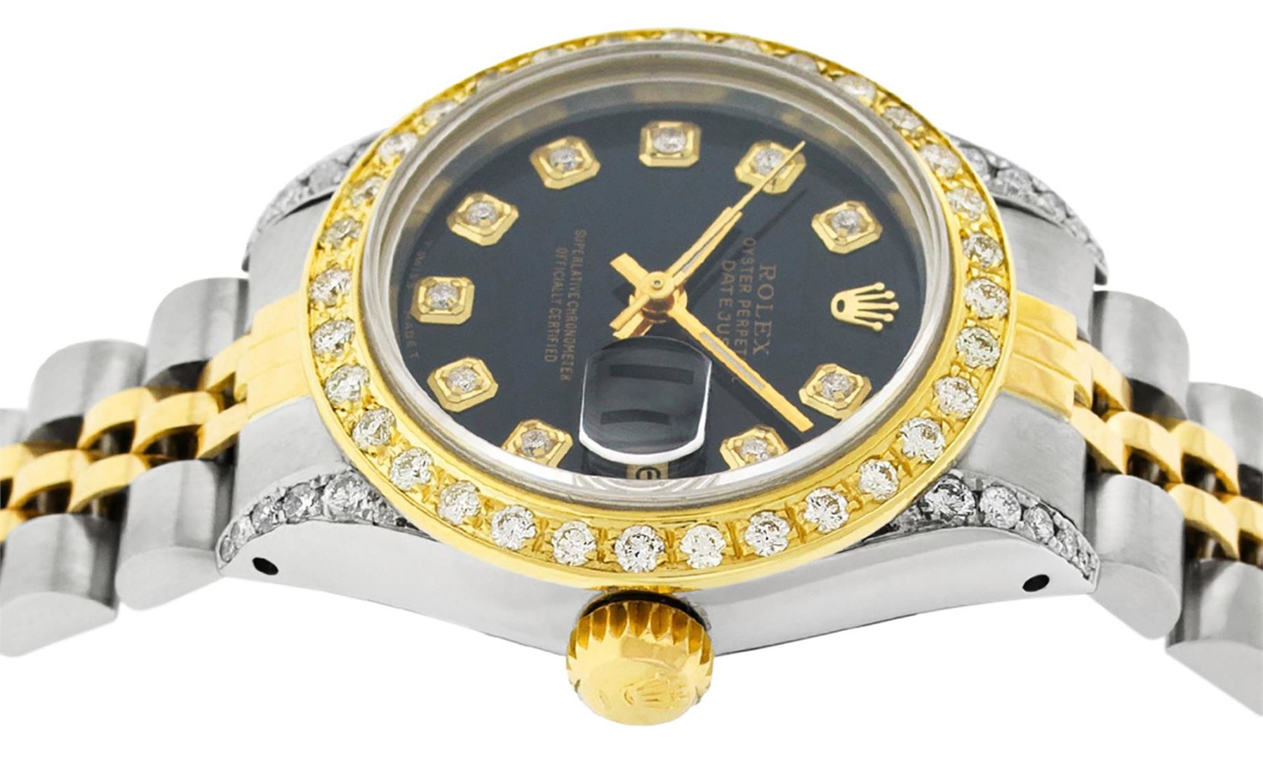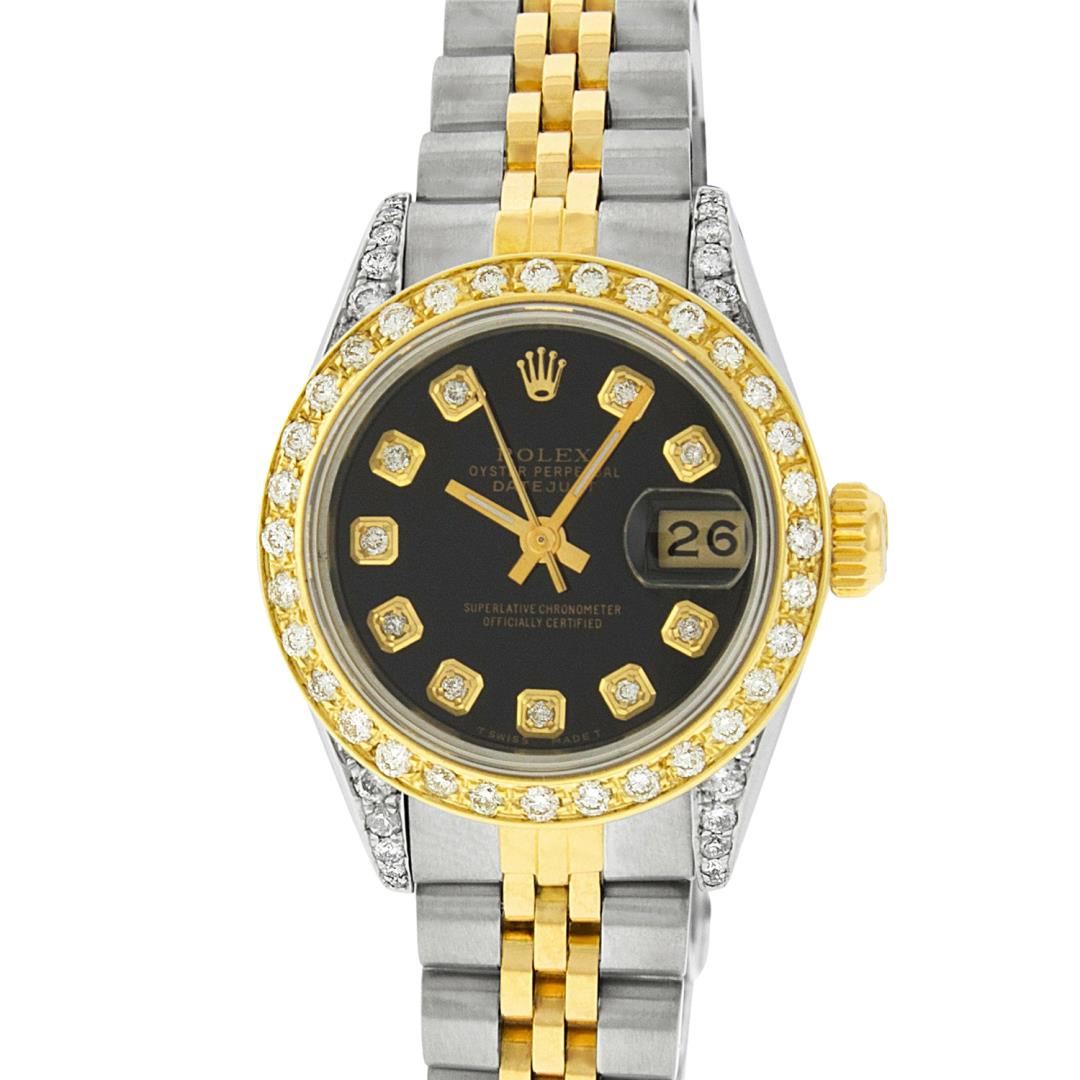 One Ladies Pre Owned Quickset Two Tone Yellow Gold And Stainless Steel Rolex Datejust Polished, Serviced And Electronically Tested, Yellow Gold And Stainless Steel Case: 26mm, Yellow Gold Crown, Custom Diamond Lugs: 24 Added Diamonds On Lugs. Custom Bezel: New 18K Yellow Gold Beadset Diamond Bezel, Diamond Count: 32 Diamonds. Custom Crystal: New Sapphire With Magnified Date Window. Custom Hands: New Luminescent Hands. Rolex Movement: Automatic Winding Movement 2135. Custom Dial: Custom Black Dial With Added Diamond Hour Markers, Diamond Count: 10 Diamonds. Date Window: 3 O'Clock Position Date Display, Model: Datejust. Condition: G-6 Extra Fine. Rolex Bracelet: Two Tone Yellow Gold And Stainless Steel Jubilee Band. Bright Polish. 6.0 Inch Length, Adjustable. Standard Clasp, With Rolex Logo. This Watch Has Been Serviced Time Tested And Is In Excellent Condition It Is Free Of All Scratches And Dents.