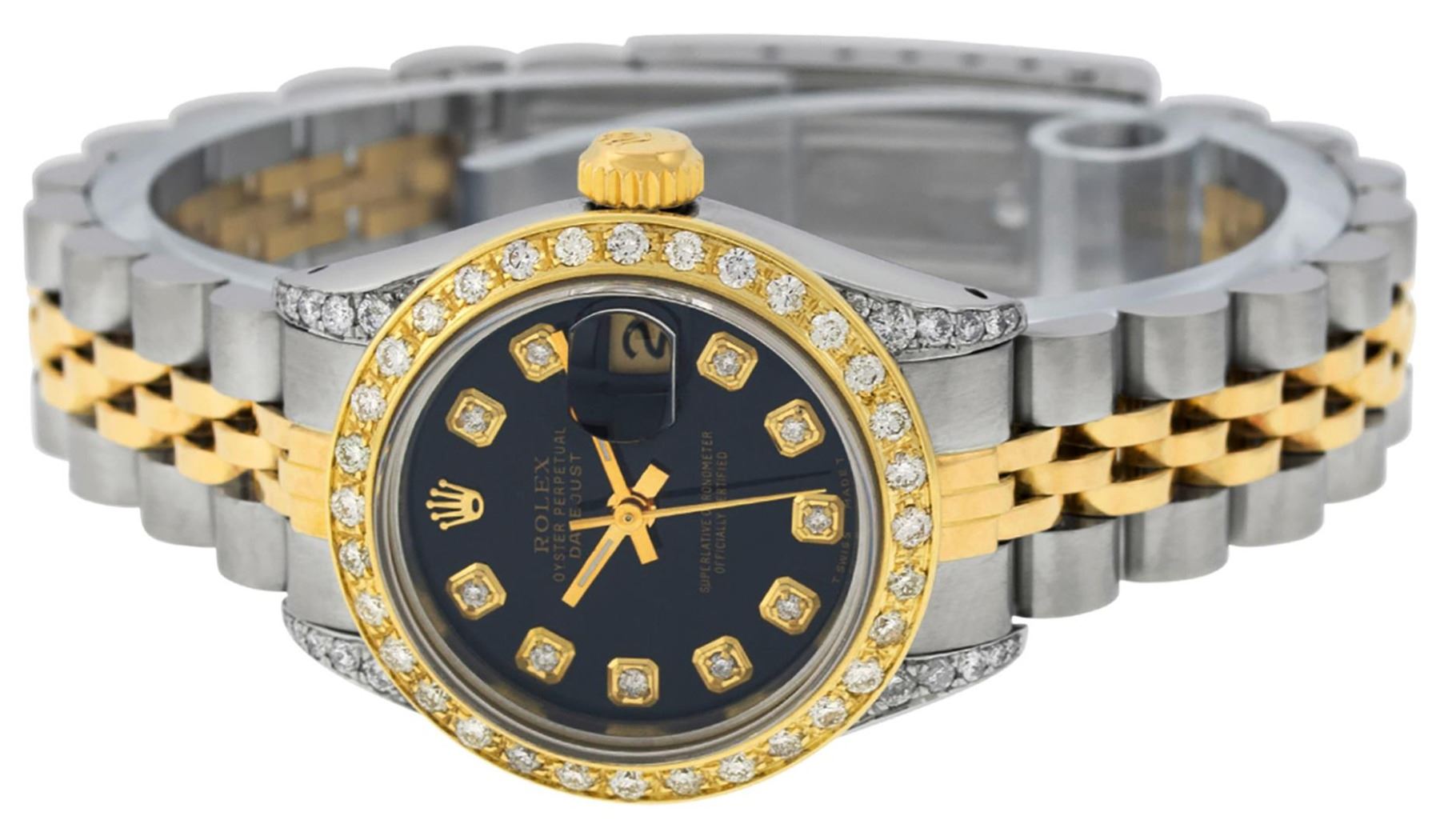 One Ladies Pre Owned Quickset Two Tone Yellow Gold And Stainless Steel Rolex Datejust Polished, Serviced And Electronically Tested, Yellow Gold And Stainless Steel Case: 26mm, Yellow Gold Crown, Custom Diamond Lugs: 24 Added Diamonds On Lugs. Custom Bezel: New 18K Yellow Gold Beadset Diamond Bezel, Diamond Count: 32 Diamonds. Custom Crystal: New Sapphire With Magnified Date Window. Custom Hands: New Luminescent Hands. Rolex Movement: Automatic Winding Movement 2135. Custom Dial: Custom Black Dial With Added Diamond Hour Markers, Diamond Count: 10 Diamonds. Date Window: 3 O'Clock Position Date Display, Model: Datejust. Condition: G-6 Extra Fine. Rolex Bracelet: Two Tone Yellow Gold And Stainless Steel Jubilee Band. Bright Polish. 6.0 Inch Length, Adjustable. Standard Clasp, With Rolex Logo. This Watch Has Been Serviced Time Tested And Is In Excellent Condition It Is Free Of All Scratches And Dents.