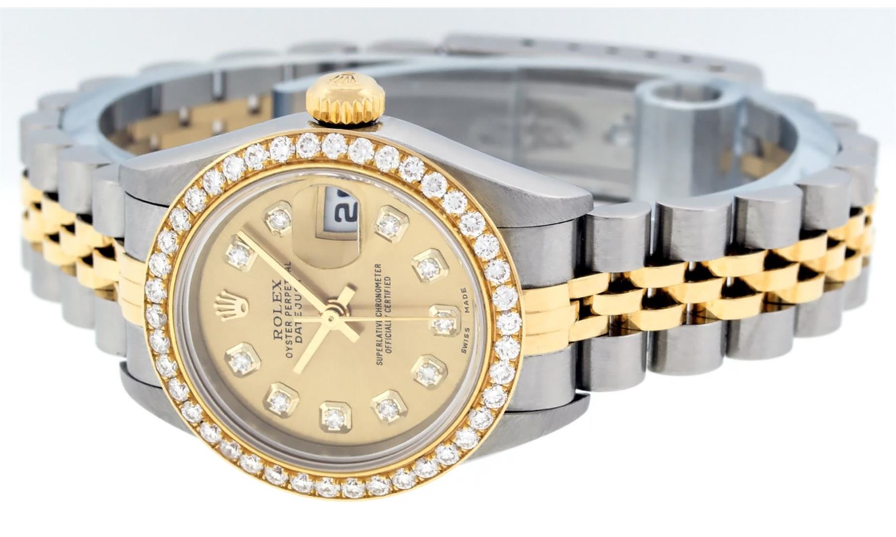 One Ladies Pre Owned Quickset 18K Yellow Gold And Stainless Steel Rolex Datejust Polished, Serviced And Electronically Tested, 18K Yellow Gold And Stainless Steel Case: 26mm, 18K Yellow Gold Crown, Custom Bezel: New 18K Yellow Gold Beadset Diamond Bezel, Diamond Count: 42 Diamonds On dial, Total Weight 1.00 Carat. Custom Crystal: New Sapphire With Date Window. Custom Hands: New Solid Hands. Rolex Movement: Automatic Winding Movement 2235. Custom Dial: Custom Champagne Dial With Added Diamonds, Stone Count: 10 Diamonds. Date Window: 3 O'Clock Position Date Display, Model: Quickset Datejust. Condition: G-6 Extra Fine. Rolex Bracelet: Two Tone 18K Yellow Gold And Stainless Steel Jubilee Band. Bright Polish. 6.0 Inch Length, Adjustable. Standard Clasp, With Rolex Logo. This Watch Has Been Serviced Time Tested And Is In Excellent Condition It Is Free Of All Scratches And Dents.