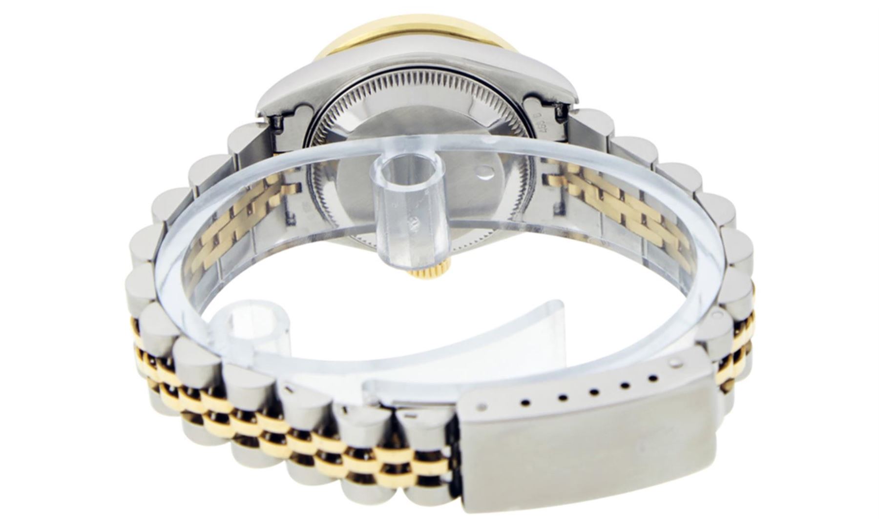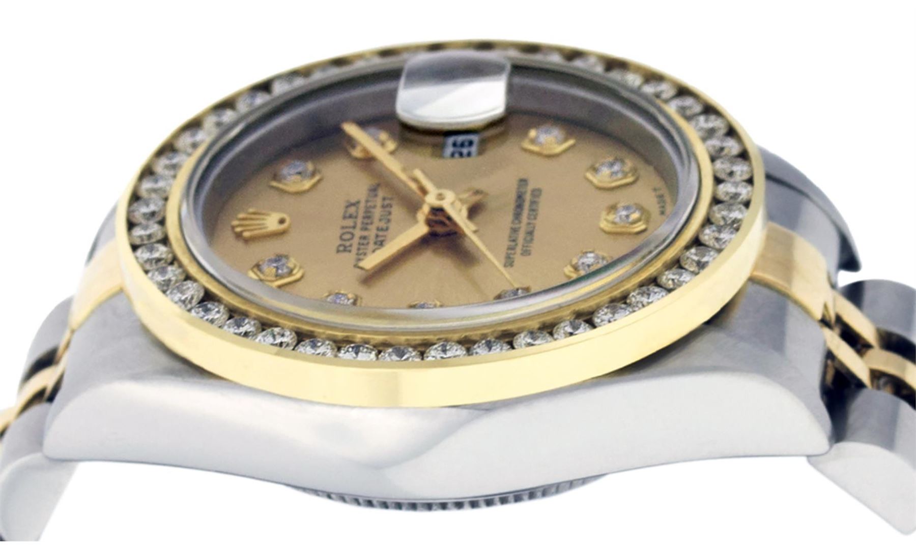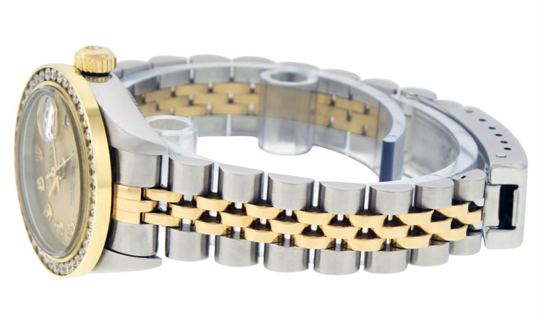 One Ladies Pre Owned 18K Yellow Gold And Stainless Steel Rolex Datejust Polished, Serviced And Electronically Tested, 18K Yellow Gold And Stainless Steel Case: 26mm, 18K Yellow Gold Crown, Custom Bezel: New 18K Yellow Gold Channel Set Diamond Bezel, Diamond Count: 44 Diamonds On Bezel, Total Weight 1.00 Carat. Custom Crystal: New Sapphire With Date Window. Custom Hands: New Solid Hands. Rolex Movement: Automatic Winding Movement 2235. Custom Dial: Custom Champagne Dial With Custom Added Diamonds, Stone Count: 10 Diamonds. Date Window: 3 O'Clock Position Date Display, Model: Datejust. Condition: G-6 Extra Fine. Rolex Bracelet: Two Tone 18K Yellow Gold And Stainless Steel Jubilee Band. Bright Polish. 6.0 Inch Length, Adjustable. Standard Clasp, With Rolex Logo. This Watch Has Been Serviced Time Tested And Is In Excellent Condition It Is Free Of All Scratches And Dents.