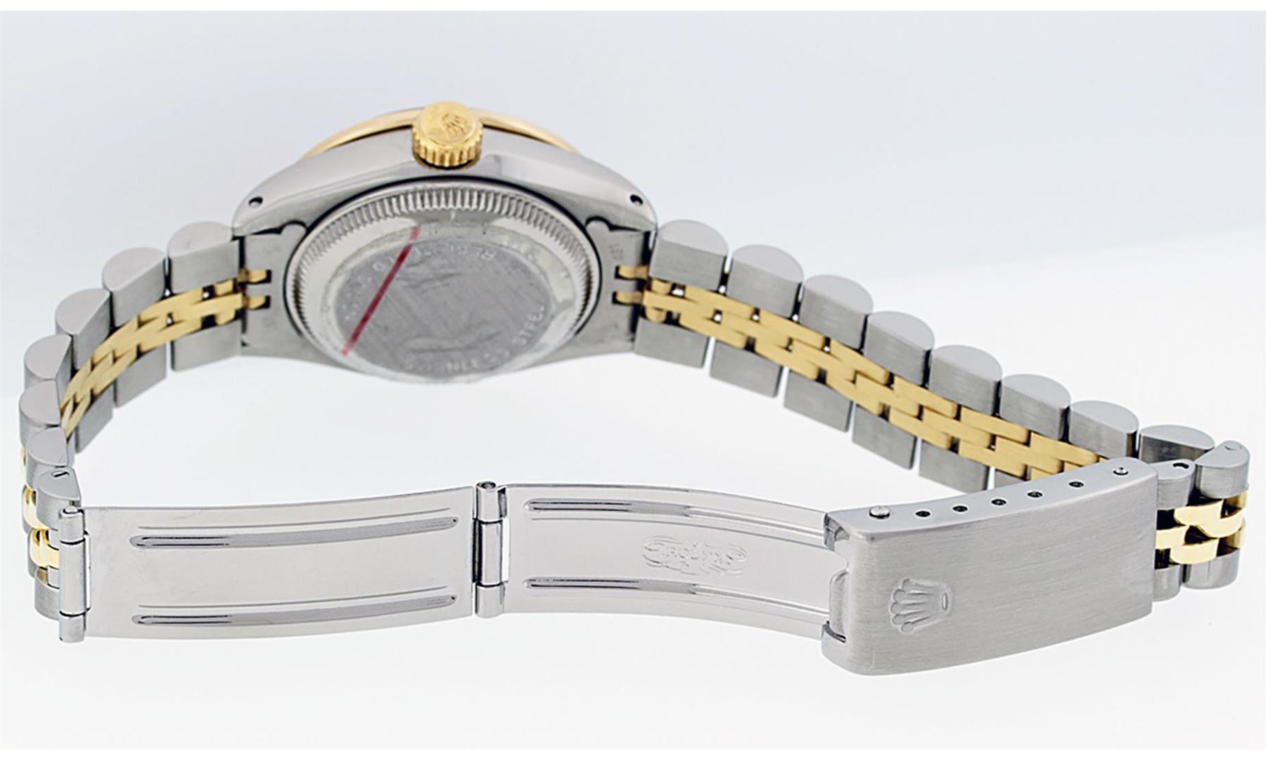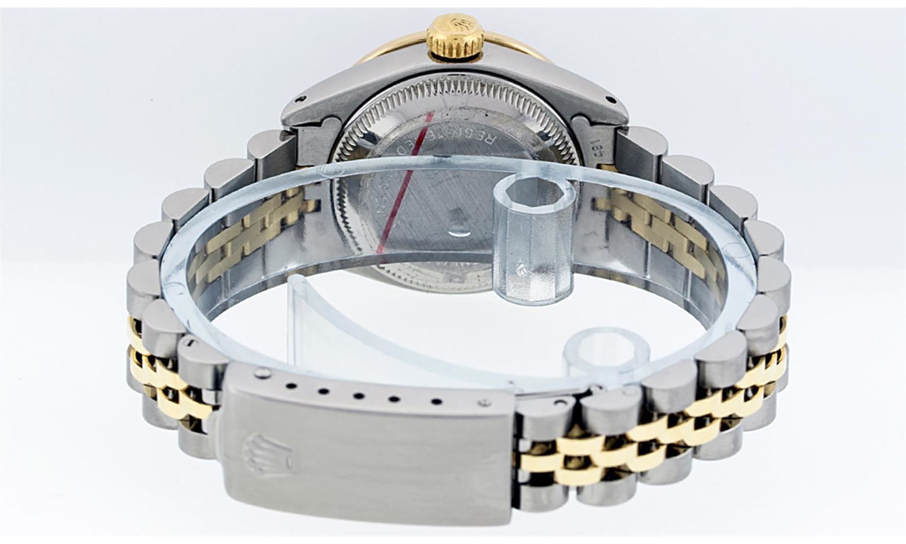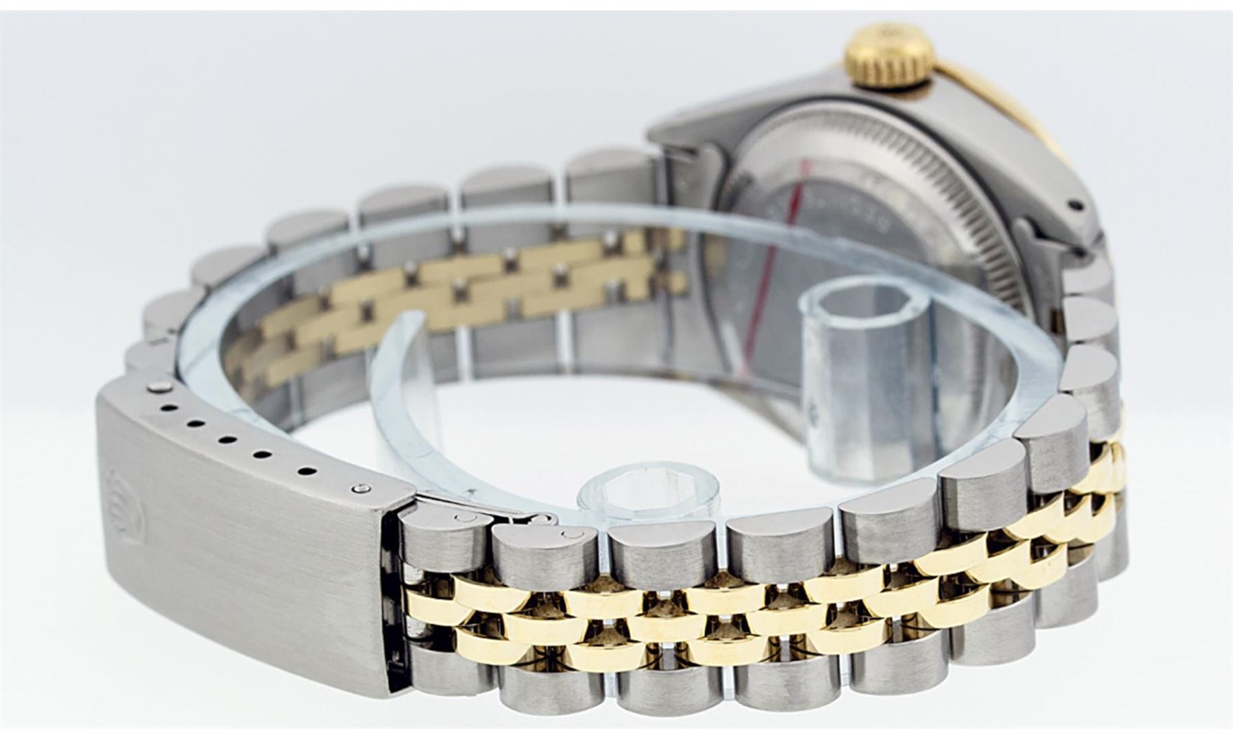 One Ladies Pre Owned Two Tone Yellow Gold And Stainless Steel Rolex Datejust Polished, Serviced And Electronically Tested, Yellow Gold And Stainless Steel Case: 26mm, Yellow Gold Crown, Custom Bezel: 18K Yellow Gold Beadset Diamond Bezel, Diamond Count: 32 Diamonds. Custom Crystal: New Sapphire With Magnified Date Window. Custom Hands: New Luminescent Hands. Rolex Movement: Automatic Winding Movement Caliber 2135. Custom Dial: Custom White Dial With Added Diamond Hour Markers, 10 Diamond On Dial. Date Window: 3 O'Clock Position Date Display, Model: Datejust. Condition: G-6 Extra Fine. Rolex Bracelet: Two Tone Yellow Gold And Stainless Steel Jubilee Band. Bright Polish. 6.0 Inch Length, Adjustable. Standard Clasp, With Rolex Logo. This Watch Has Been Serviced Time Tested And Is In Excellent Condition It Is Free Of All Scratches And Dents.
