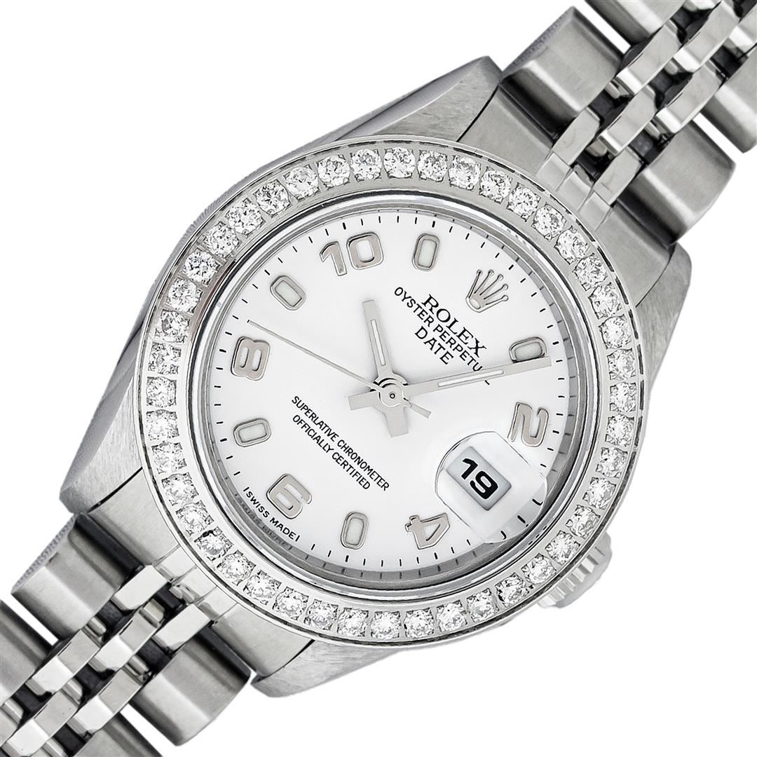 One Ladies Pre Owned Quickset Stainless Steel Rolex Datejust Polished Bright with Satin Finish, Serviced & Electronically Tested, Stainless Steel Case: 26mm, Rolex Stainless Steel Crown, Custom Bezel: New Stainless Steel Bead Set Diamond Bezel, Diamond Count: 40 Diamonds, Clarity: SI-VS, Color: G to H. Custom Crystal: New Sapphire With Magnified Date Window. Custom Hands: New Luminescent Hands. Rolex Movement: Automatic Winding Movement 2235. Rolex Dial: White With Arabic Hour Markers. Date Window: 3 O'Clock Position Date Display, Model: Datejust. Condition: G-6 Extra Fine. Rolex Bracelet: Stainless Steel Jubilee Band. Bright Polish & Satin Finish. 6.0 Inch Length, Adjustable. Standard Clasp, With Rolex Logo. This Watch Has Been Serviced Time Tested And Is In Excellent Condition It Is Free Of All Scratches And Dents.