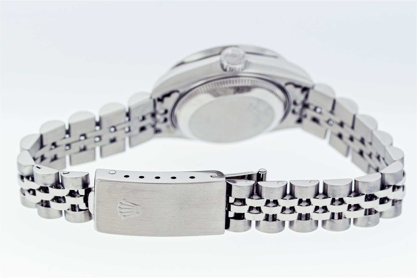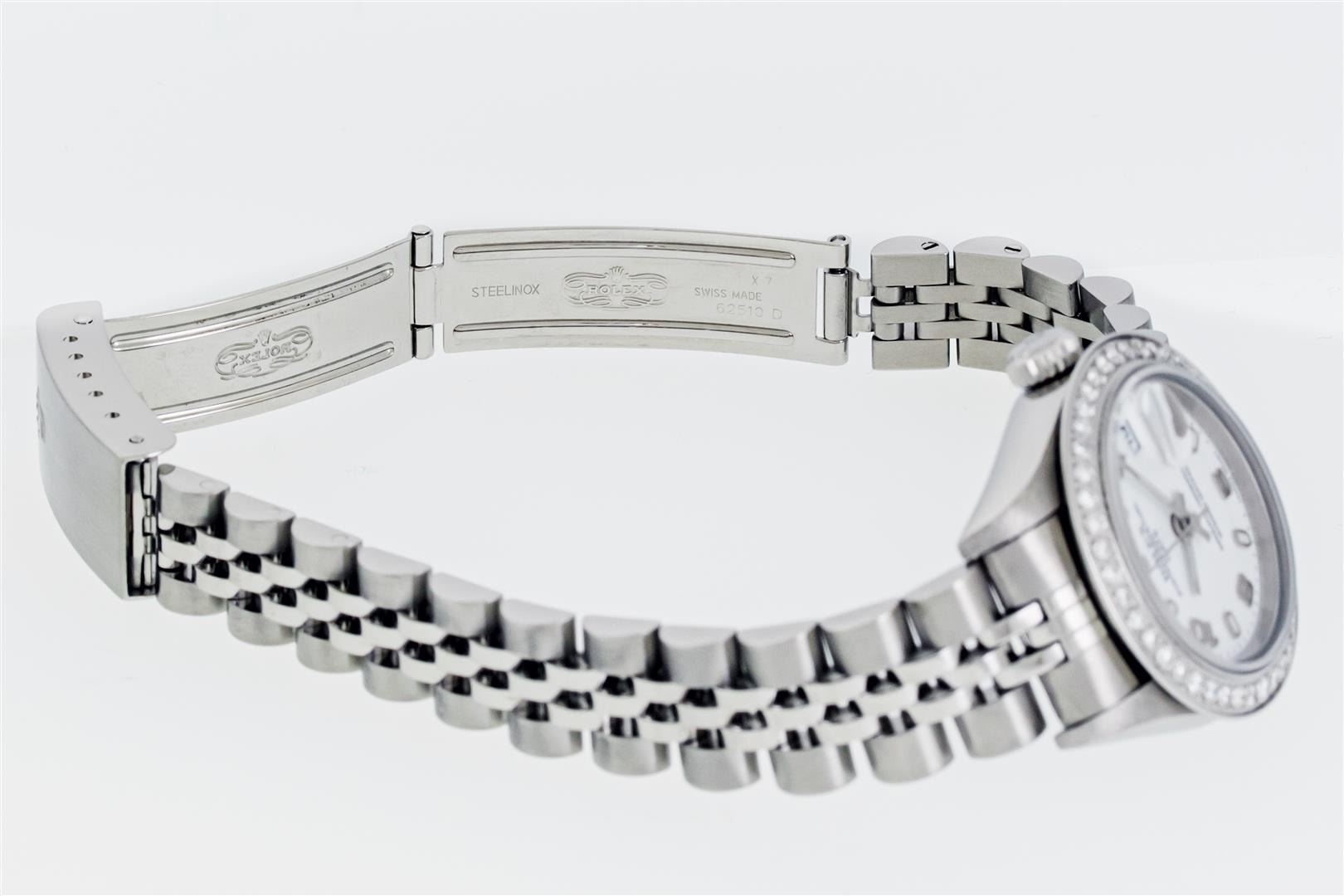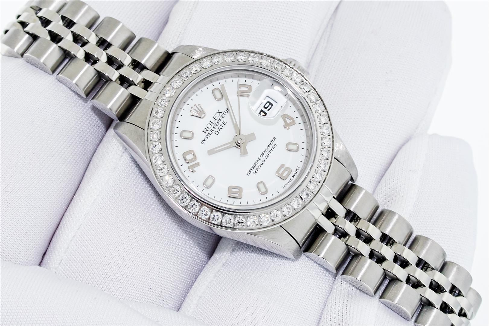 One Ladies Pre Owned Quickset Stainless Steel Rolex Datejust Polished Bright with Satin Finish, Serviced & Electronically Tested, Stainless Steel Case: 26mm, Rolex Stainless Steel Crown, Custom Bezel: New Stainless Steel Bead Set Diamond Bezel, Diamond Count: 40 Diamonds, Clarity: SI-VS, Color: G to H. Custom Crystal: New Sapphire With Magnified Date Window. Custom Hands: New Luminescent Hands. Rolex Movement: Automatic Winding Movement 2235. Rolex Dial: White With Arabic Hour Markers. Date Window: 3 O'Clock Position Date Display, Model: Datejust. Condition: G-6 Extra Fine. Rolex Bracelet: Stainless Steel Jubilee Band. Bright Polish & Satin Finish. 6.0 Inch Length, Adjustable. Standard Clasp, With Rolex Logo. This Watch Has Been Serviced Time Tested And Is In Excellent Condition It Is Free Of All Scratches And Dents.
