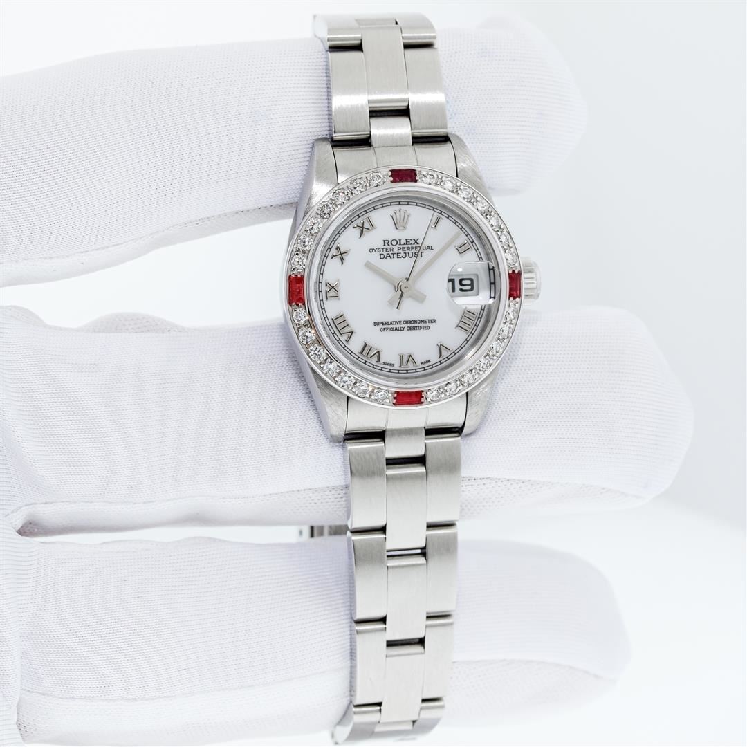 One Ladies Pre Owned Quickset Stainless Steel Rolex Datejust Polished Bright with Satin Finish, Serviced & Electronically Tested, Stainless Steel Case: 26mm, Rolex Stainless Steel Crown, Custom Bezel: New 18K White Gold Ruby Bead Set Diamond Bezel, Diamond + Gem Count: 28 Diamonds + 4 Rubies, Clarity: SI-VS, Color: G to H. Custom Crystal: New Sapphire With Magnified Date Window. Custom Hands: New Hands. Rolex Movement: Automatic Winding Movement 2235. Rolex Dial: White With Roman Hour Markers & Square Track. Date Window: 3 O'Clock Position Date Display, Model: Quickset Datejust. Condition: G-6 Extra Fine. Rolex Bracelet: Stainless Steel Oyster Band. Bright Polish & Satin Finish. 6.0 Inch Length, Adjustable. Standard Clasp, With Rolex Logo. This Watch Has Been Serviced Time Tested And Is In Excellent Condition It Is Free Of All Scratches And Dents.