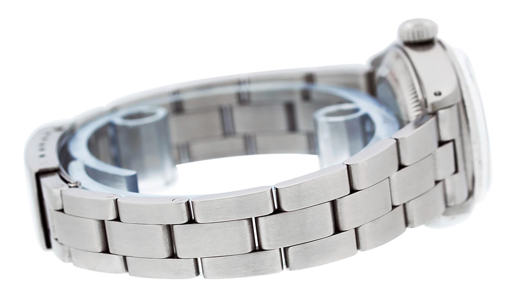 One Ladies Pre Owned Stainless Steel Rolex Datejust Polished Bright with Satin Finish, Serviced & Electronically Tested, Stainless Steel Case: 26mm, Stainless Steel Crown. Custom Bezel: New 18K White Gold Beadset & Sapphire Diamond Bezel, Diamond Count: 2