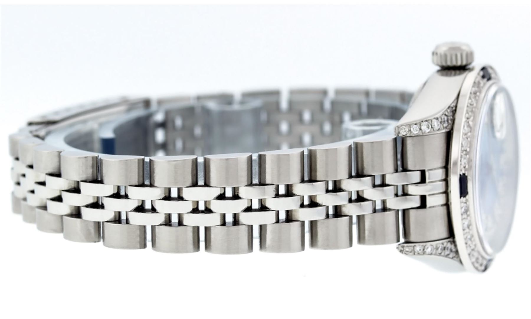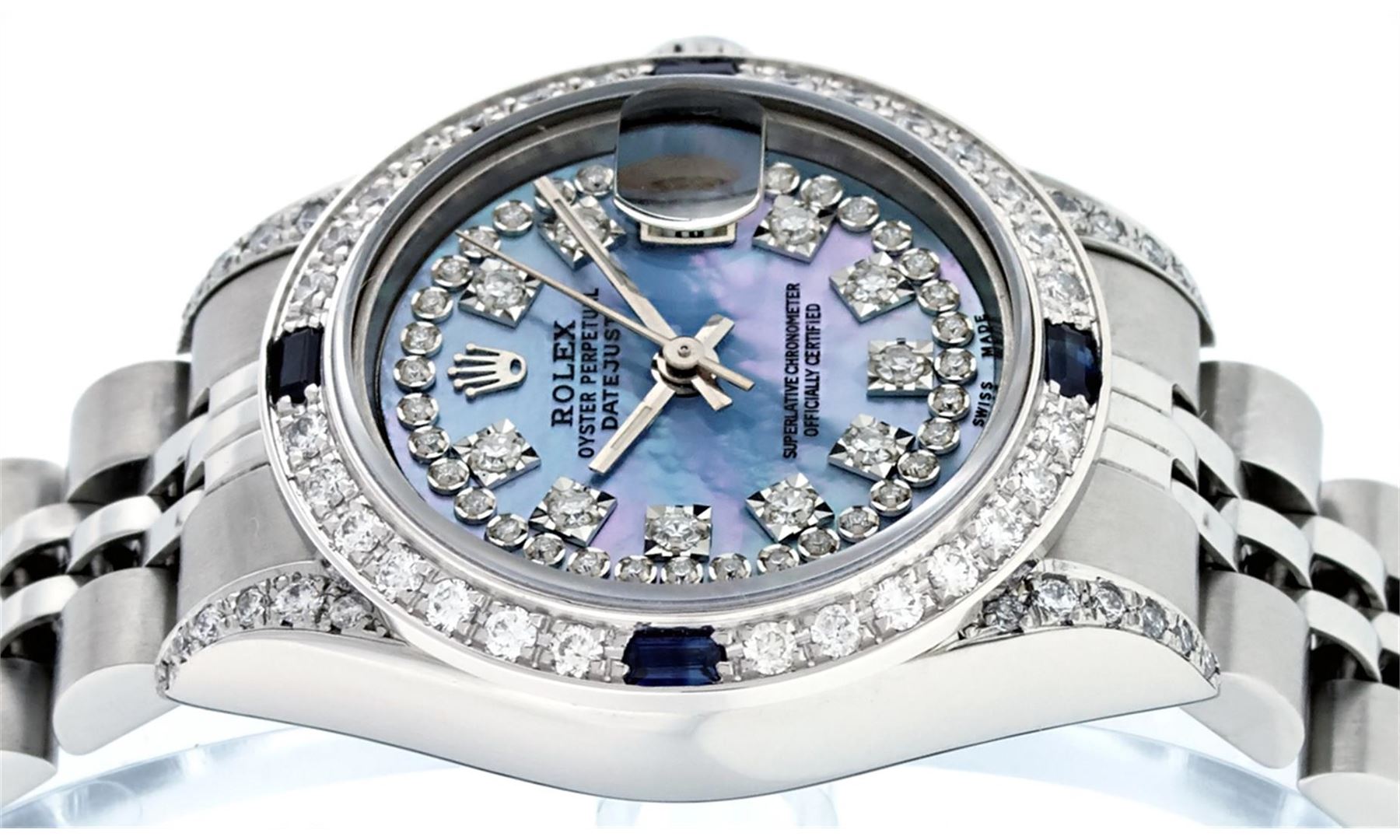 One Ladies Rolex Datejust Polished Bright with Satin Finish, Serviced & Electronically Tested, Stainless Steel Case:26mm, Stainless Steel Crown, Diamond Lugs: 16 Diamonds On Lugs, Clarity: SI-VS, Color: G to H. Custom Bezel: 18K White Gold Beadset Sapphire Bezel, Diamond Count: 28 Diamonds + 4 Sapphires, Total Weight 1.00 Carat, Clarity: SI-VS, Color: G to H. Custom Crystal: Synthetic Sapphire Cyclops Lens. Movement: Automatic Winding Movement Caliber 2235. Custom Dial: Refinished Blue Mother Of Pearl String Diamond Dial VS, 43 Diamonds in Dial G To H In Color, Clarity: VVS. Date Window: 3 O'Clock Position Date Display, Model: No Hole Datejust Quickset. Condition: G-6 Extra Fine. Bracelet: Stainless Steel Jubilee Band. Bright Polish & Satin Finish. 6.0 Inch Length, Adjustable. Standard Clasp, With Rolex Logo.