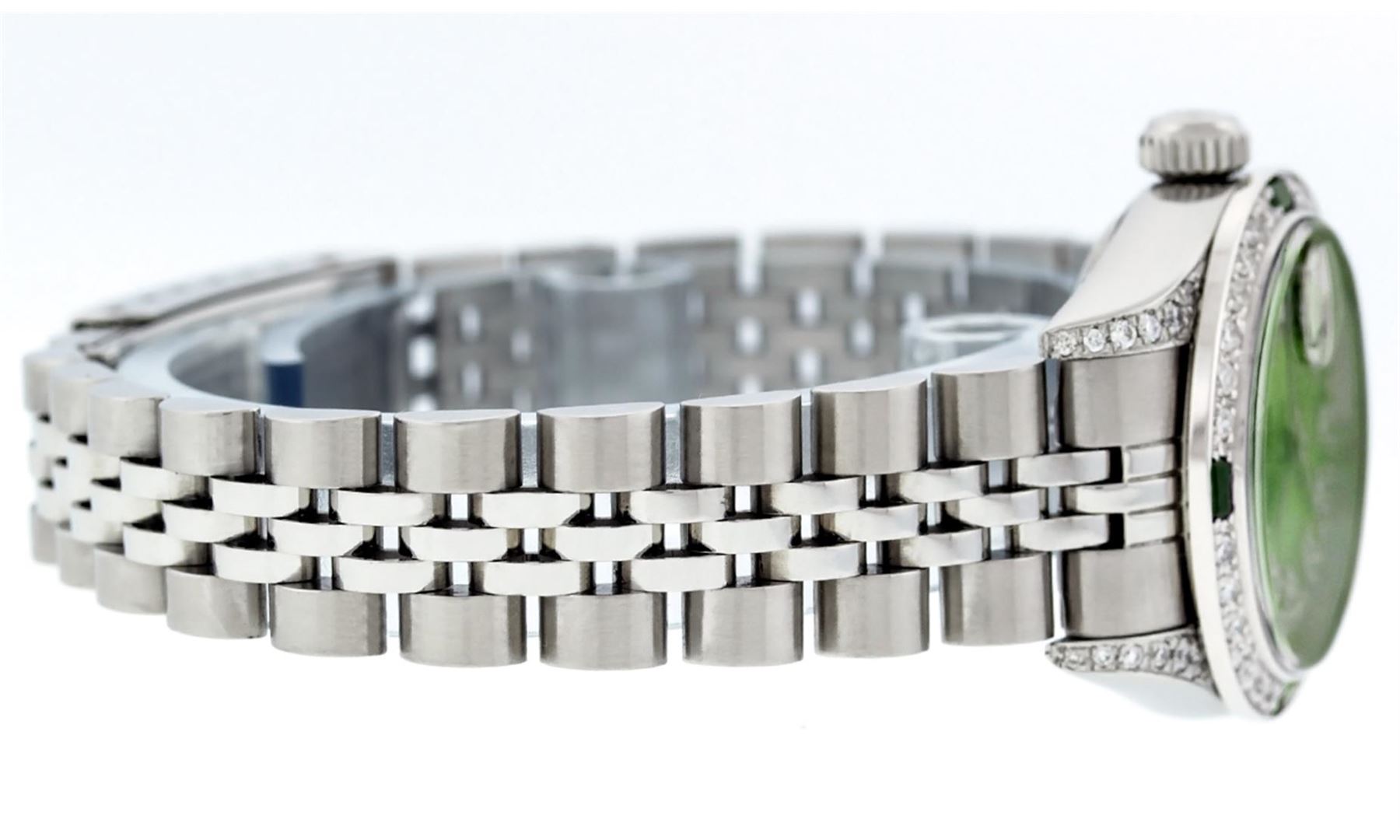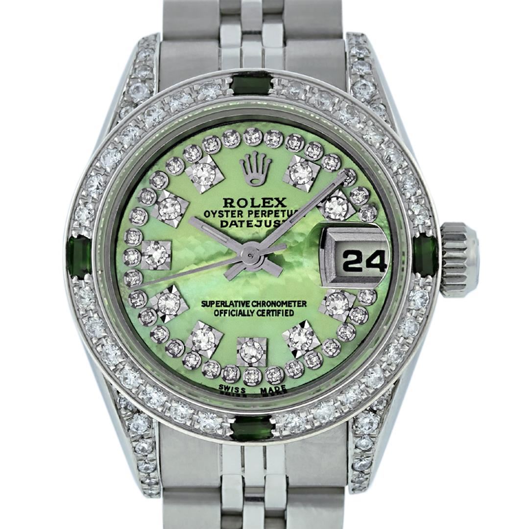 One Ladies Rolex Datejust Polished Bright with Satin Finish, Serviced & Electronically Tested, Stainless Steel Case:26mm, Stainless Steel Crown, Diamond Lugs: 16 Diamonds On Lugs, Clarity: SI-VS, Color: G to H. Custom Bezel: 18K White Gold Beadset Emerald Bezel, Diamond Count: 28 Diamonds + 4 Emeralds, Total Weight 1.00 Carat, Clarity: SI-VS, Color: G to H. Custom Crystal: Synthetic Sapphire Cyclops Lens. Movement: Automatic Winding Movement Caliber 2235. Custom Dial: Refinished Green Mother Of Pearl String Diamond Dial VS, 43 Diamonds in Dial G To H In Color, Clarity: VS. Date Window: 3 O'Clock Position Date Display, Model: No Hole Datejust Quickset. Condition: G-6 Extra Fine. Bracelet: Stainless Steel Jubilee Band. Bright Polish & Satin Finish. 6.0 Inch Length, Adjustable. Standard Clasp, With Rolex Logo.