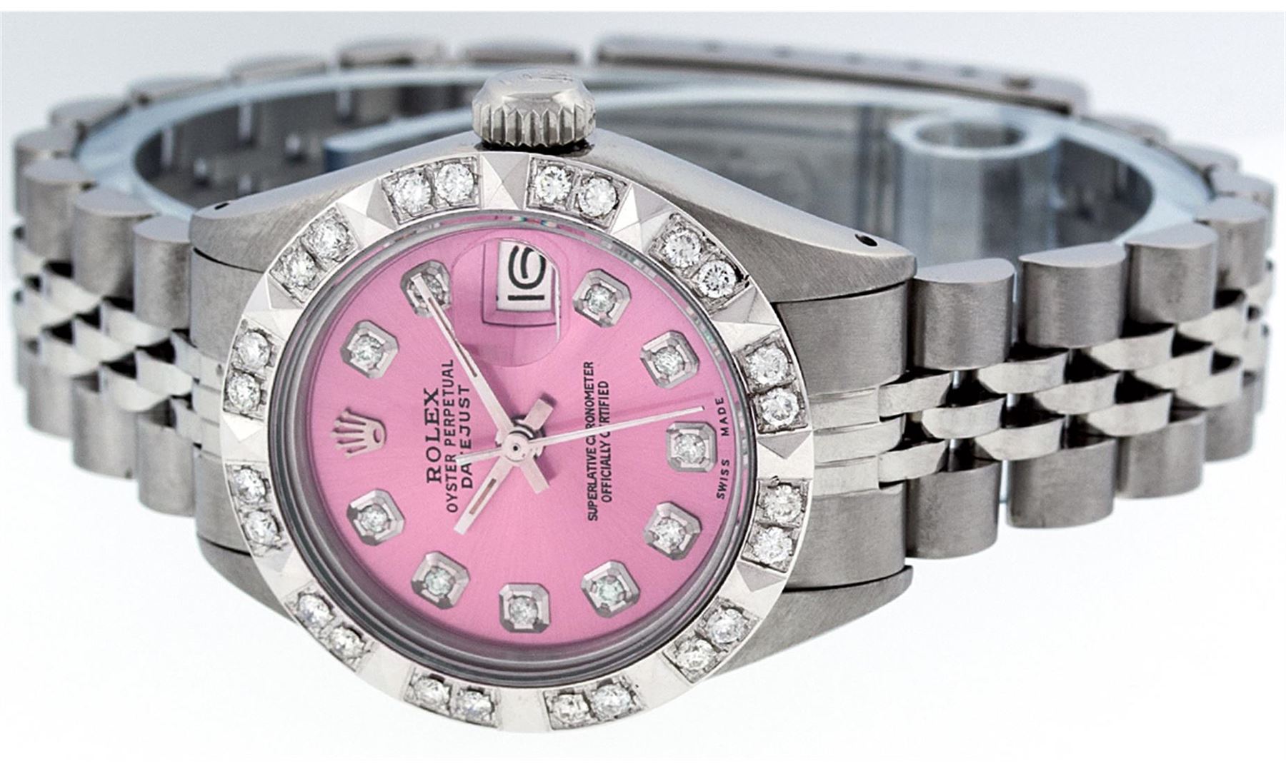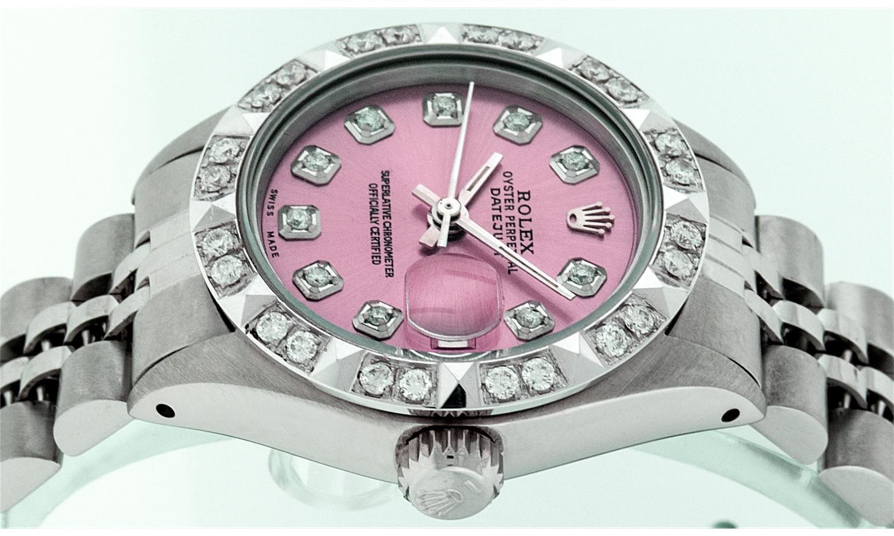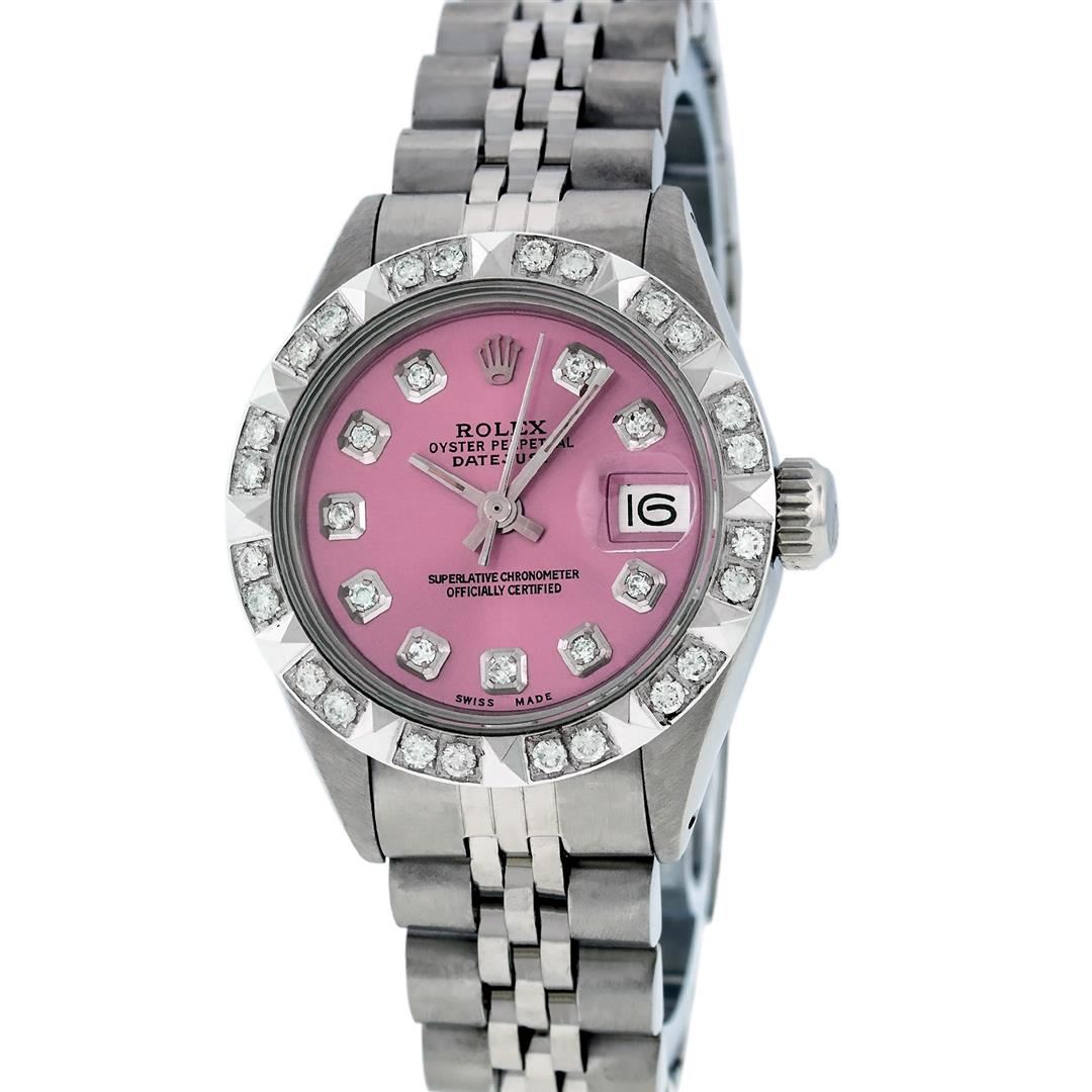 One Ladies Rolex Datejust Polished Bright with Satin Finish, Serviced & Electronically Tested, Stainless Steel Case:26mm, Stainless Steel Crown, Custom Bezel: 18K White Gold Pyramid Diamond Bezel, Diamond Count: 24 Diamonds In Dial. Total Weight .50 Carat, Clarity: SI-VS, Color: G to H. Custom Crystal: Synthetic Sapphire Cyclops Lens. Movement: Automatic Winding Movement Caliber 2030. Custom Dial: Ice Pink Diamond Dial. Diamond Count: 10 Diamonds In Dial. Clarity: SI-VS, Color:G to H. Date Window: 3 O'Clock Position Date Display, Model: Datejust. Condition: G-6 Extra Fine The Watch Is In Very Good Condition Free Of All Scratches And Dents. Bracelet:Stainless Steel Jubilee Band With Rolex Crown On Buckle. Bright Polish & Satin Finish. Band Length: 6.0 Inch Length, Adjustable. Standard Clasp, With Rolex Logo.