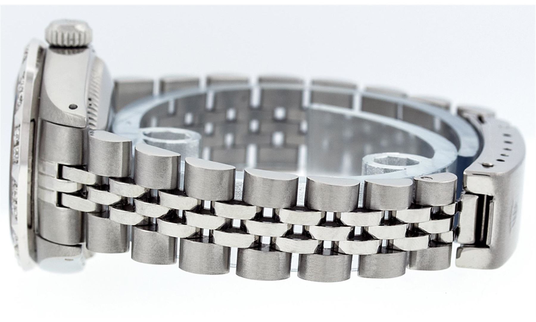 One Ladies Rolex Datejust Polished Bright with Satin Finish, Serviced & Electronically Tested, Stainless Steel Case:26mm, Stainless Steel Crown, Custom Bezel: 18K White Gold Pyramid Diamond Bezel, Diamond Count: 24 Diamonds In Dial. Total Weight .50 Carat, Clarity: SI-VS, Color: G to H. Custom Crystal: Synthetic Sapphire Cyclops Lens. Movement: Automatic Winding Movement Caliber 2030. Custom Dial: Ice Pink Diamond Dial. Diamond Count: 10 Diamonds In Dial. Clarity: SI-VS, Color:G to H. Date Window: 3 O'Clock Position Date Display, Model: Datejust. Condition: G-6 Extra Fine The Watch Is In Very Good Condition Free Of All Scratches And Dents. Bracelet:Stainless Steel Jubilee Band With Rolex Crown On Buckle. Bright Polish & Satin Finish. Band Length: 6.0 Inch Length, Adjustable. Standard Clasp, With Rolex Logo.
