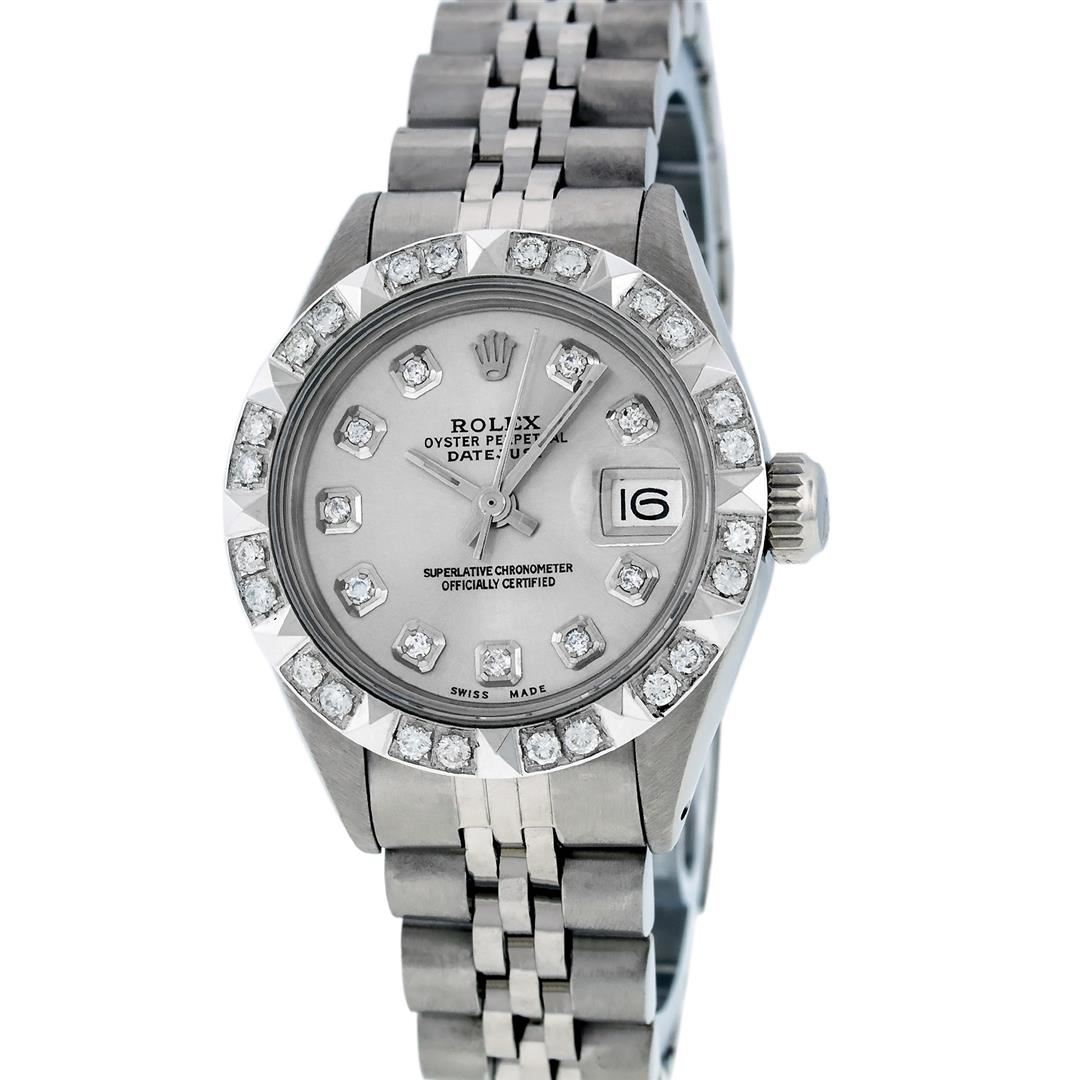One Ladies Rolex Datejust Polished Bright with Satin Finish, Serviced & Electronically Tested, Stainless Steel Case:26mm, Stainless Steel Crown, Custom Bezel: 18K White Gold Pyramid Diamond Bezel, Diamond Count: 24 Diamonds In Dial. Total Weight .50 Carat, Clarity: SI-VS, Color: G to H. Custom Crystal: Synthetic Sapphire Cyclops Lens. Movement: Automatic Winding Movement Caliber 2030. Custom Dial: Silver Diamond Dial. Diamond Count: 10 Diamonds In Dial. Clarity: SI-VS, Color:G to H. Date Window: 3 O'Clock Position Date Display, Model: Datejust. Condition: G-6 Extra Fine The Watch Is In Very Good Condition Free Of All Scratches And Dents. Bracelet:Stainless Steel Jubilee Band With Rolex Crown On Buckle. Bright Polish & Satin Finish. Band Length: 6.0 Inch Length, Adjustable. Standard Clasp, With Rolex Logo.