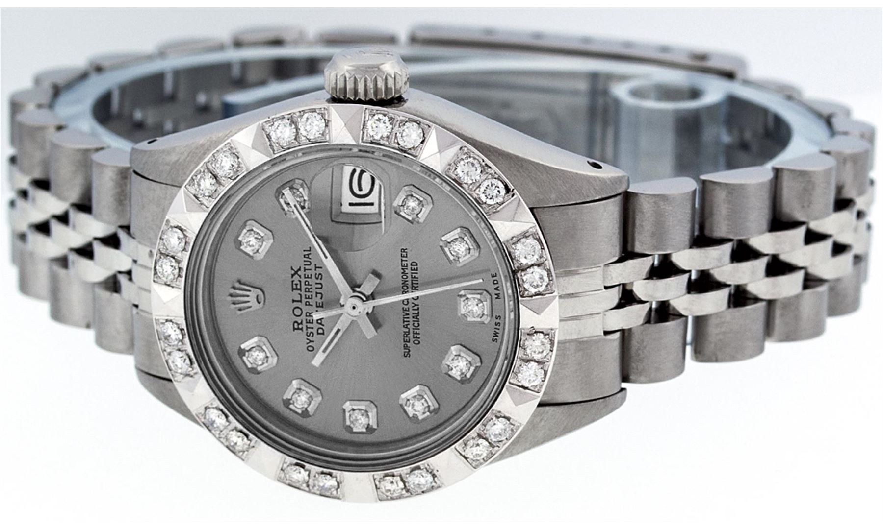 One Ladies Rolex Datejust Polished Bright with Satin Finish, Serviced & Electronically Tested, Stainless Steel Case:26mm, Stainless Steel Crown, Custom Bezel: 18K White Gold Pyramid Diamond Bezel, Diamond Count: 24 Diamonds In Dial. Total Weight .50 Carat, Clarity: SI-VS, Color: G to H. Custom Crystal: Synthetic Sapphire Cyclops Lens. Movement: Automatic Winding Movement Caliber 2030. Custom Dial: Slate Grey Diamond Dial. Diamond Count: 10 Diamonds In Dial. Clarity: SI-VS, Color:G to H. Date Window: 3 O'Clock Position Date Display, Model: Datejust. Condition: G-6 Extra Fine The Watch Is In Very Good Condition Free Of All Scratches And Dents. Bracelet:Stainless Steel Jubilee Band With Rolex Crown On Buckle. Bright Polish & Satin Finish. Band Length: 6.0 Inch Length, Adjustable. Standard Clasp, With Rolex Logo.