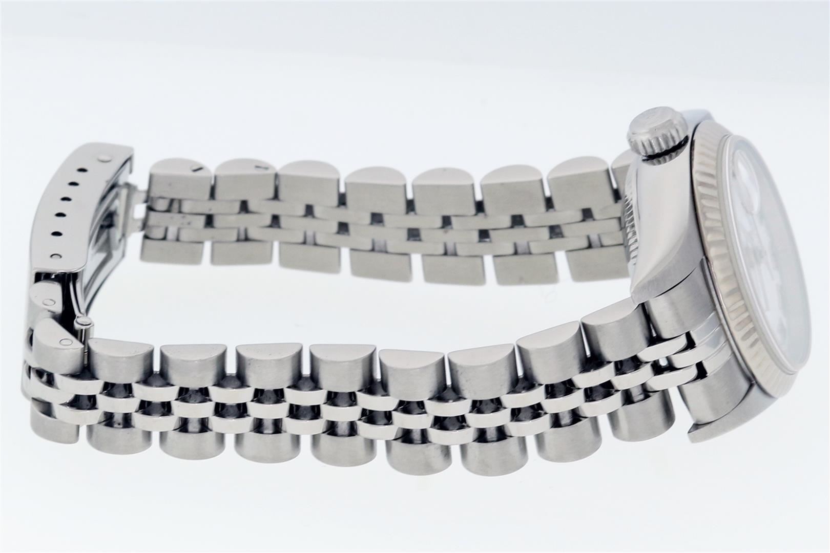 One Quickset Sapphire Pre Owned Ladies Stainless Steel Rolex Datejust Polished Bright with Satin Finish, Serviced & Electronically Tested, Rolex Stainless Steel Case: 26mm, Rolex Stainless Steel Crown, Rolex Bezel: 18K White Gold Fluted Bezel, Crystal: Sapphire With Date Window. Custom Hands: New Hands. Rolex Movement: Automatic Winding Movement 2235. Rolex Dial: White Roman With Square Track, Date Window: 3 O'Clock Position Date Display, Model: Quickset Datejust. Condition: G-6 Extra Fine. Rolex Bracelet: Stainless Steel Jubilee Band. Bright Polish & Satin Finish. 6.0 Inch Length, Adjustable. Standard Clasp, With Rolex Logo. This Watch Has Been Serviced Time Tested And Is In Excellent Condition It Is Free Of All Scratches And Dents. This Watch Comes With A Rolex Box, Rolex Booklets, And Rolex Wallet.