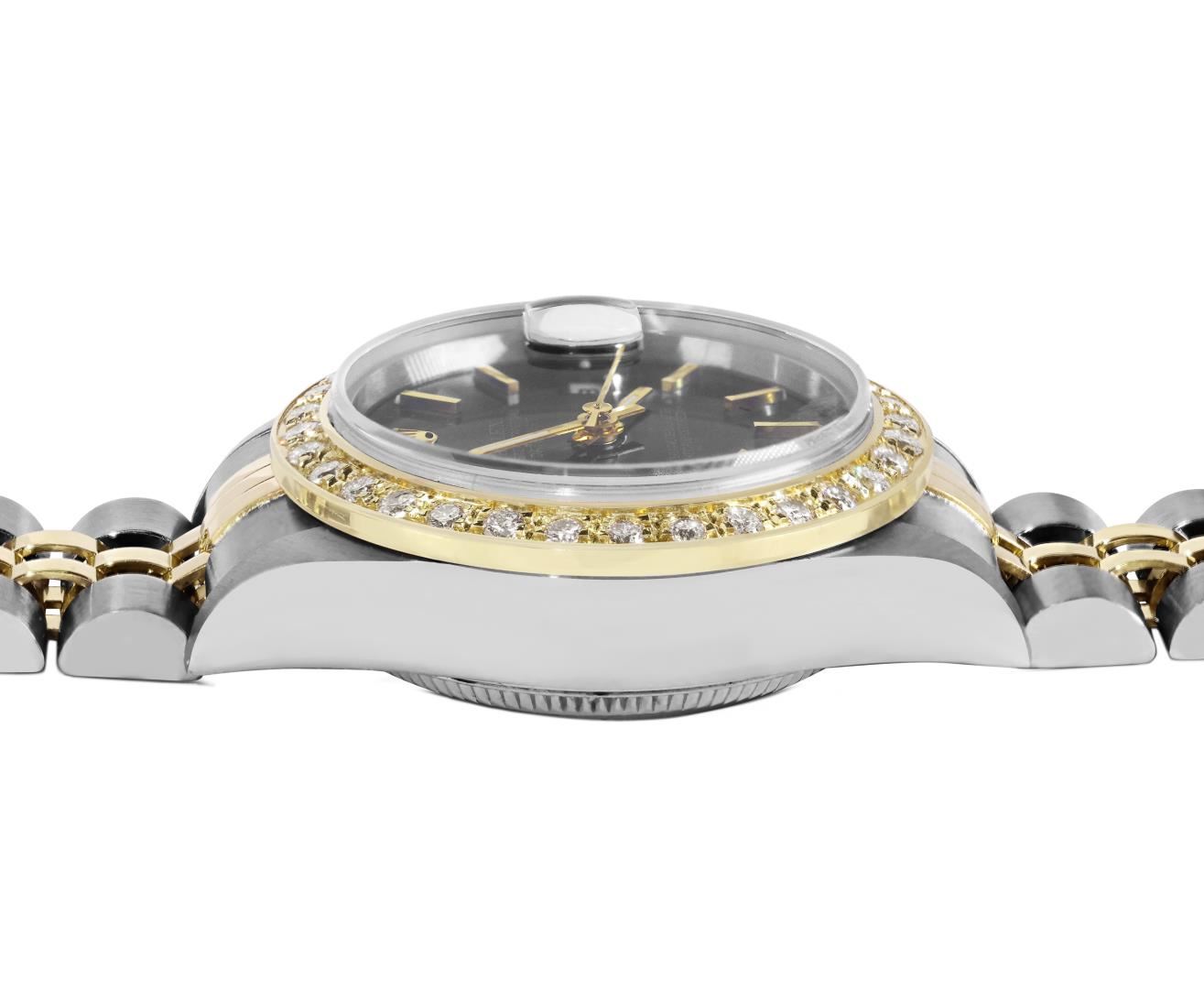 Rolex Ladies Pre Owned Sapphire Quickset 18K Yellow Gold and Stainless Steel Two Tone Datejust Polished Bright with Satin Finish, Serviced And Electronically Tested, Rolex Stainless Steel Case: 26mm, Rolex 18K Yellow Gold Crown, Custom Bezel: New Beadset Diamond Bezel, Diamond Count: 32 Diamonds On Bezel. Custom Crystal: New Sapphire With Magnified Date Window. Custom Hands: New Hands. Rolex Movement: Automatic Winding Movement 2235. Rolex Dial: Factory Black With Index Hour Markers And Dash Track. Date Window: 3 O'Clock Position Date Display, Model: Quickset Datejust, Condition: G-6 Extra Fine. Rolex Bracelet: 18K Yellow Gold And Stainless Steel Jubilee Band. Bright Polish & Satin Finish. 6.0 Inch Length, Adjustable. Standard Clasp, With Rolex Logo. This Watch Has Been Serviced Time Tested And Is In Excellent Condition It Is Free Of All Scratches And Dents. This Watch Comes With A Rolex Box.