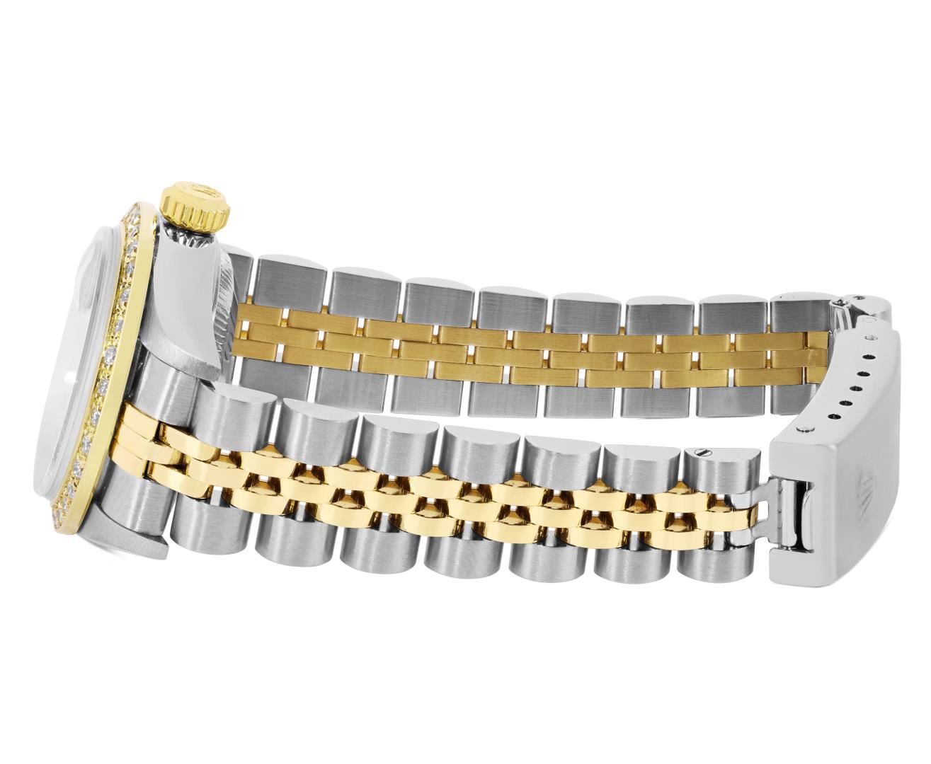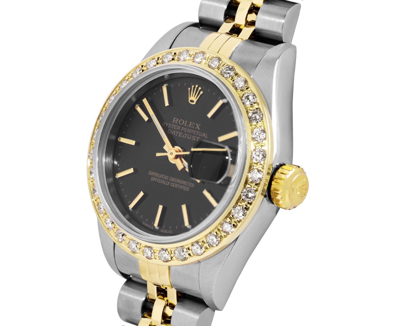 Rolex Ladies Pre Owned Sapphire Quickset 18K Yellow Gold and Stainless Steel Two Tone Datejust Polished Bright with Satin Finish, Serviced And Electronically Tested, Rolex Stainless Steel Case: 26mm, Rolex 18K Yellow Gold Crown, Custom Bezel: New Beadset Diamond Bezel, Diamond Count: 32 Diamonds On Bezel. Custom Crystal: New Sapphire With Magnified Date Window. Custom Hands: New Hands. Rolex Movement: Automatic Winding Movement 2235. Rolex Dial: Factory Black With Index Hour Markers And Dash Track. Date Window: 3 O'Clock Position Date Display, Model: Quickset Datejust, Condition: G-6 Extra Fine. Rolex Bracelet: 18K Yellow Gold And Stainless Steel Jubilee Band. Bright Polish & Satin Finish. 6.0 Inch Length, Adjustable. Standard Clasp, With Rolex Logo. This Watch Has Been Serviced Time Tested And Is In Excellent Condition It Is Free Of All Scratches And Dents. This Watch Comes With A Rolex Box.