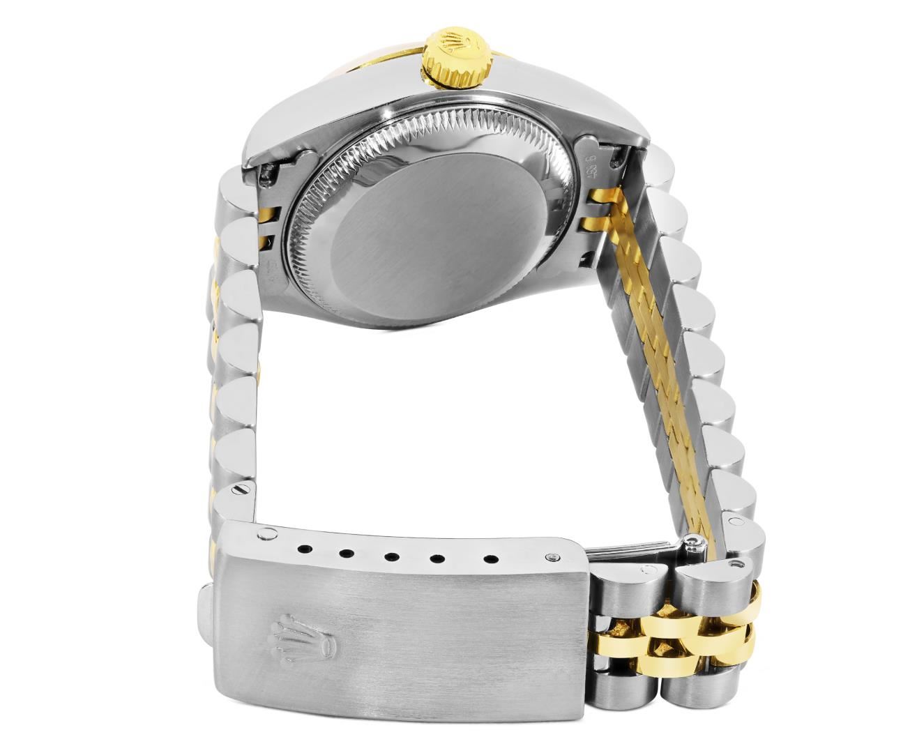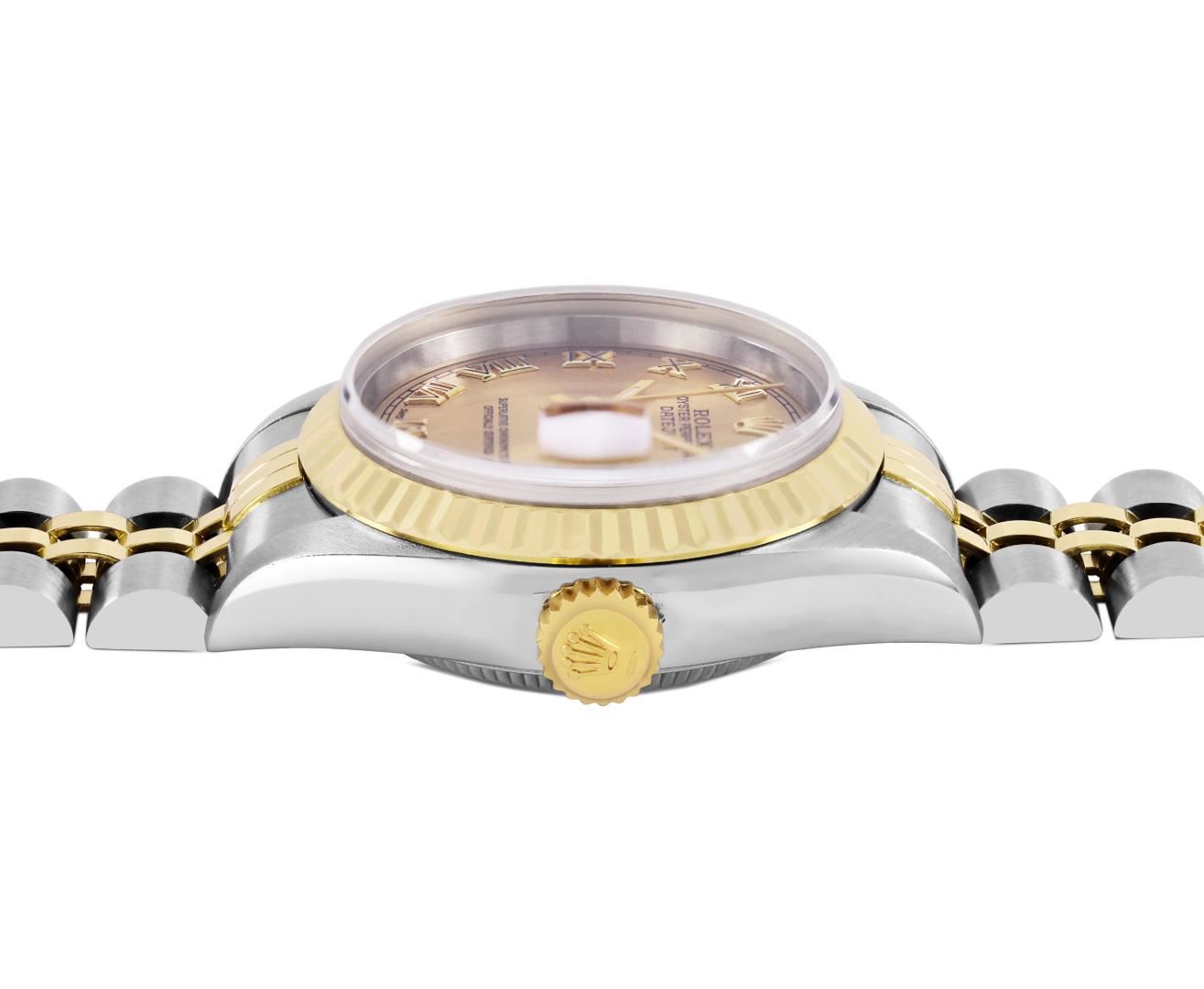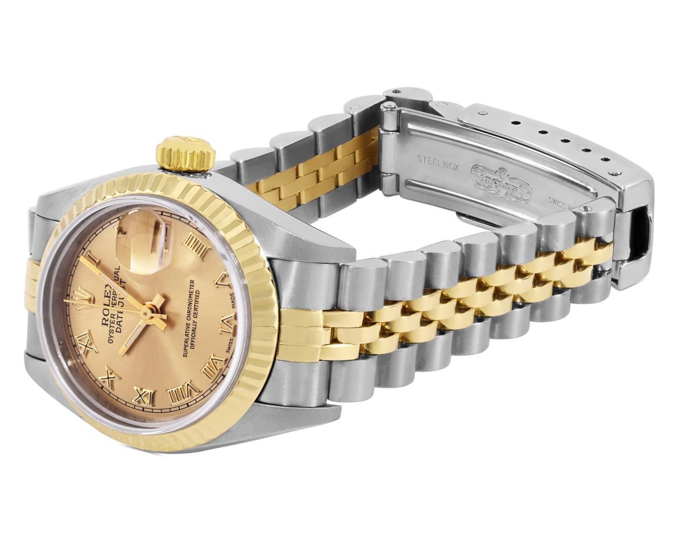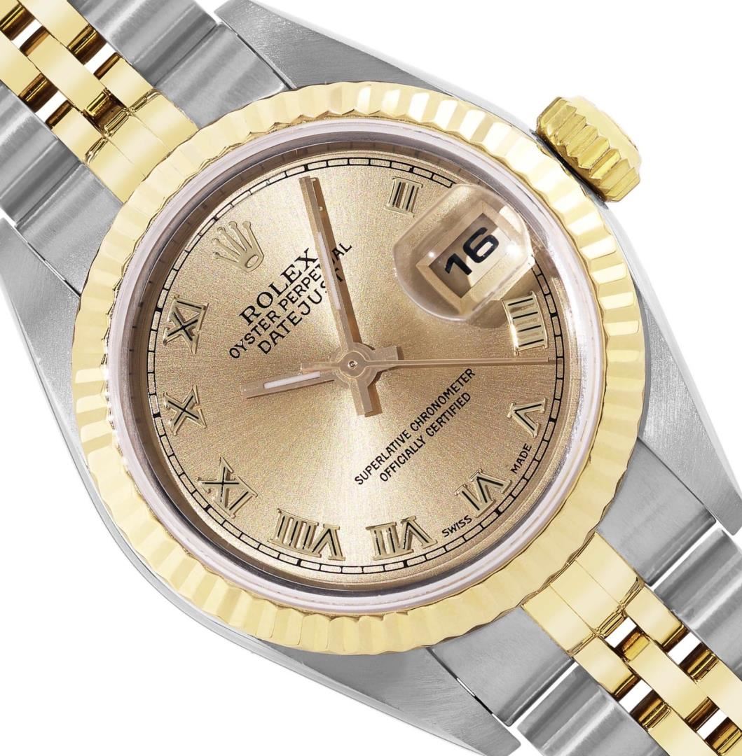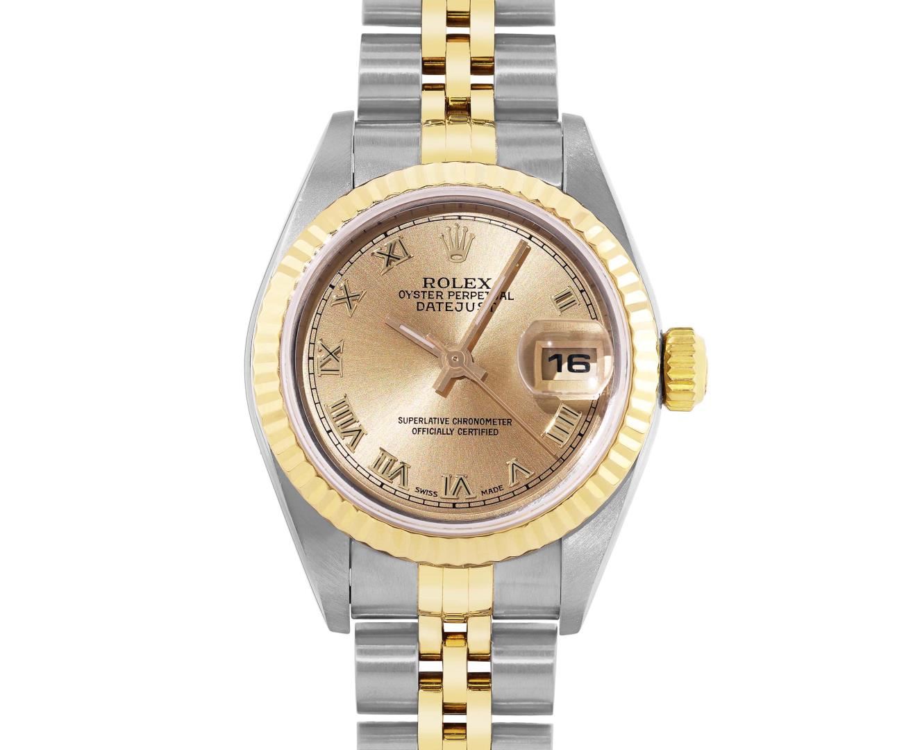 One Ladies Pre Owned Quickset 2T 18K Yellow Gold And Stainless Steel Sapphire Quickset Rolex Datejust Polished Bright with Satin Finish, Serviced And Electronically Tested, Rolex Stainless Steel Case: 26mm, Rolex 18K Yellow Gold Crown, Rolex Bezel: 18K Yellow Gold Fluted Bezel. Crystal: Sapphire With Magnified Date Window. Hands: Luminescent Hands. Rolex Movement: Automatic Winding Movement 2235. Rolex Dial: Champagne Roman With Square Track. Date Window: 3 O'Clock Position Date Display, Model: Sapphire Quickset Datejust. Condition: G-6 Extra Fine. Rolex Bracelet: 18K Yellow Gold & Stainless Steel Jubilee Band. Bright Polish And Satin Finish. 6.0 Inch Length, Adjustable. Standard Clap, With Rolex Logo. This Watch Has Been Serviced Time Tested And Is In Excellent Condition It Is Free Of All Scratches And Dents.