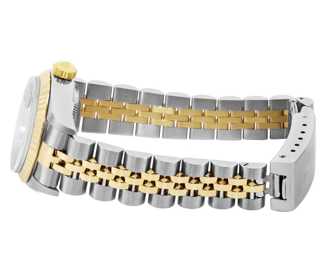 One Ladies Pre Owned Quickset 2T 18K Yellow Gold And Stainless Steel Sapphire Quickset Rolex Datejust Polished Bright with Satin Finish, Serviced And Electronically Tested, Rolex Stainless Steel Case: 26mm, Rolex 18K Yellow Gold Crown, Rolex Bezel: 18K Yellow Gold Fluted Bezel. Crystal: Sapphire With Magnified Date Window. Hands: Luminescent Hands. Rolex Movement: Automatic Winding Movement 2235. Rolex Dial: Champagne Roman With Square Track. Date Window: 3 O'Clock Position Date Display, Model: Sapphire Quickset Datejust. Condition: G-6 Extra Fine. Rolex Bracelet: 18K Yellow Gold & Stainless Steel Jubilee Band. Bright Polish And Satin Finish. 6.0 Inch Length, Adjustable. Standard Clap, With Rolex Logo. This Watch Has Been Serviced Time Tested And Is In Excellent Condition It Is Free Of All Scratches And Dents.