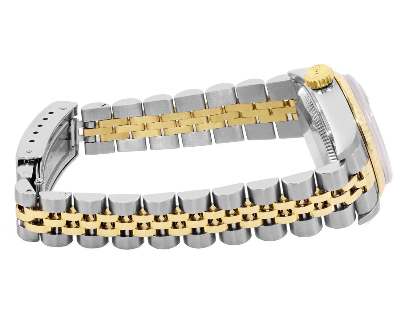 One Ladies Pre Owned Quickset 2T 18K Yellow Gold And Stainless Steel Sapphire Quickset Rolex Datejust Polished Bright with Satin Finish, Serviced And Electronically Tested, Rolex Stainless Steel Case: 26mm, Rolex 18K Yellow Gold Crown, Rolex Bezel: 18K Yellow Gold Fluted Bezel. Crystal: Sapphire With Magnified Date Window. Hands: Luminescent Hands. Rolex Movement: Automatic Winding Movement 2235. Rolex Dial: Champagne Roman With Square Track. Date Window: 3 O'Clock Position Date Display, Model: Sapphire Quickset Datejust. Condition: G-6 Extra Fine. Rolex Bracelet: 18K Yellow Gold & Stainless Steel Jubilee Band. Bright Polish And Satin Finish. 6.0 Inch Length, Adjustable. Standard Clap, With Rolex Logo. This Watch Has Been Serviced Time Tested And Is In Excellent Condition It Is Free Of All Scratches And Dents.