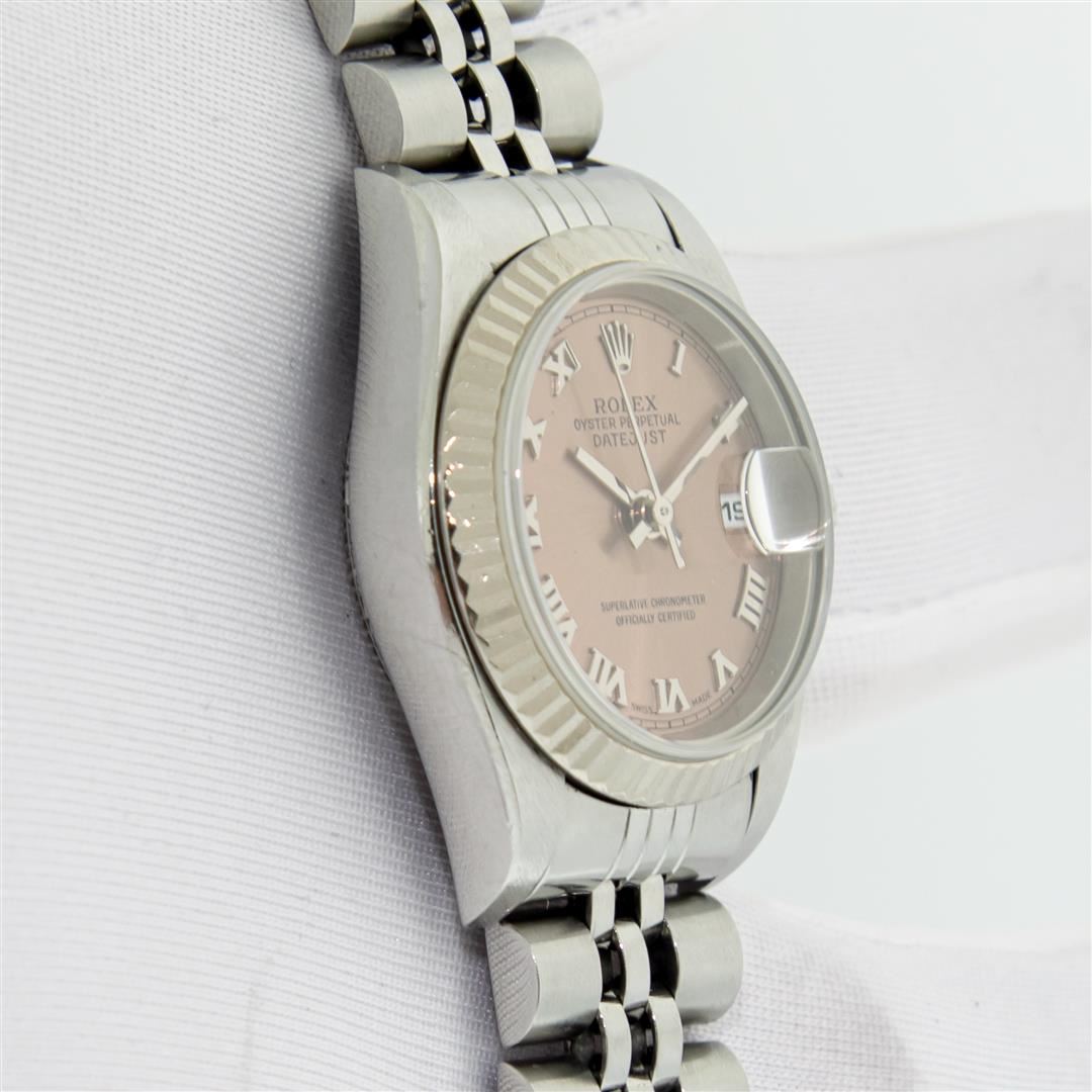 One Quickset Pre Owned Ladies Stainless Steel Rolex Datejust Polished Bright with Satin Finish, Serviced & Electronically Tested, Rolex Stainless Steel Case: 26mm, Rolex Stainless Steel Crown, Rolex Bezel: 18K White Gold Fluted Bezel, Crystal: Sapphire With Date Window. Custom Hands: New Luminescent Hands. Rolex Movement: Automatic Winding Movement 2235. Rolex Dial: Salmon Roman With Square Track, Date Window: 3 O'Clock Position Date Display, Model: Quickset Datejust. Condition: G-6 Extra Fine. Rolex Bracelet: Stainless Steel Jubilee Band. Bright Polish & Satin Finish. 6.0 Inch Length, Adjustable. Standard Clasp, With Rolex Logo. This Watch Has Been Serviced Time Tested And Is In Excellent Condition It Is Free Of All Scratches And Dents.