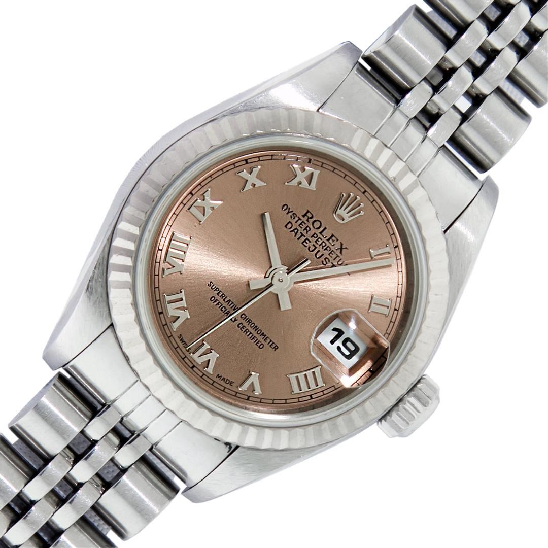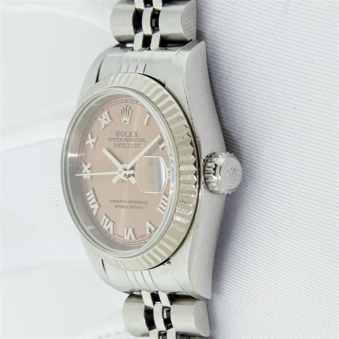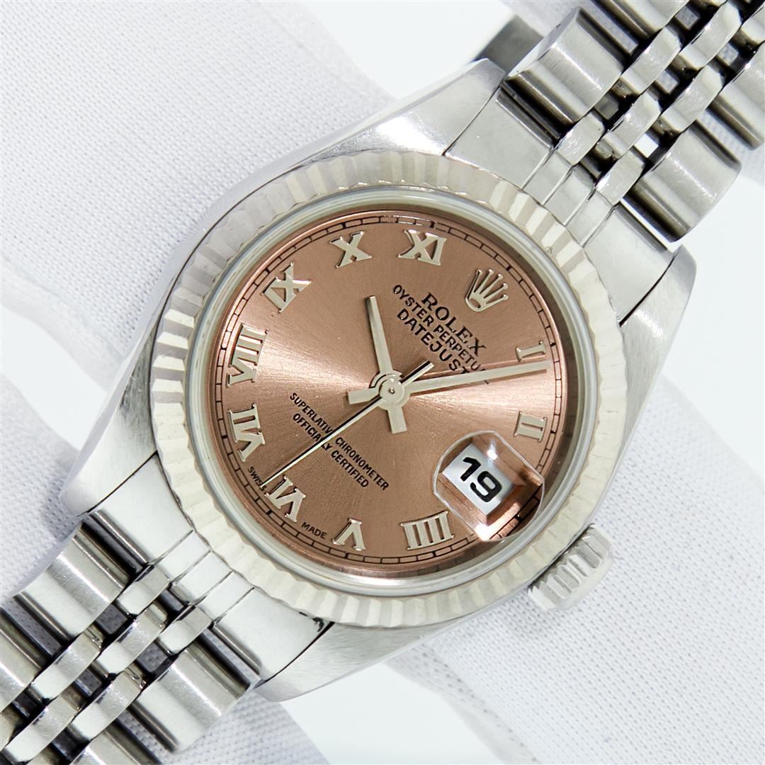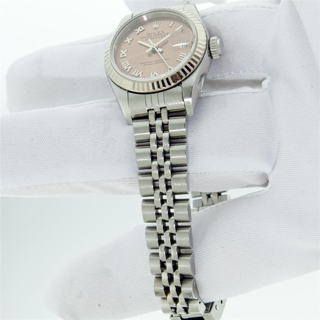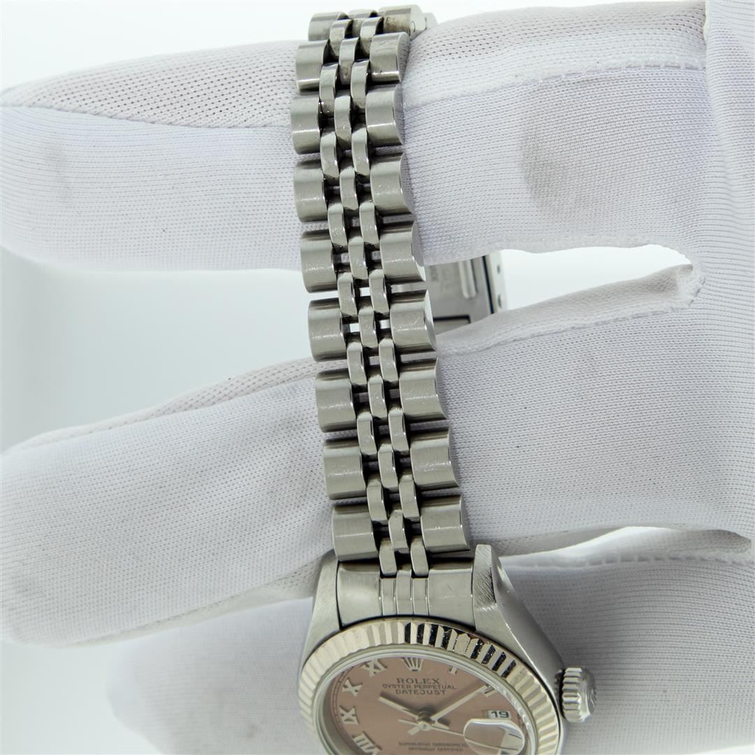 One Quickset Pre Owned Ladies Stainless Steel Rolex Datejust Polished Bright with Satin Finish, Serviced & Electronically Tested, Rolex Stainless Steel Case: 26mm, Rolex Stainless Steel Crown, Rolex Bezel: 18K White Gold Fluted Bezel, Crystal: Sapphire With Date Window. Custom Hands: New Luminescent Hands. Rolex Movement: Automatic Winding Movement 2235. Rolex Dial: Salmon Roman With Square Track, Date Window: 3 O'Clock Position Date Display, Model: Quickset Datejust. Condition: G-6 Extra Fine. Rolex Bracelet: Stainless Steel Jubilee Band. Bright Polish & Satin Finish. 6.0 Inch Length, Adjustable. Standard Clasp, With Rolex Logo. This Watch Has Been Serviced Time Tested And Is In Excellent Condition It Is Free Of All Scratches And Dents.
