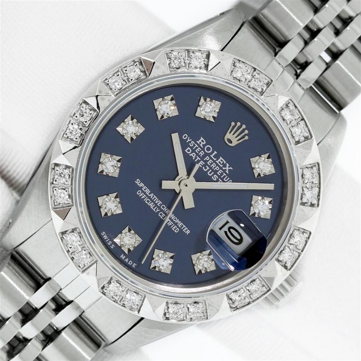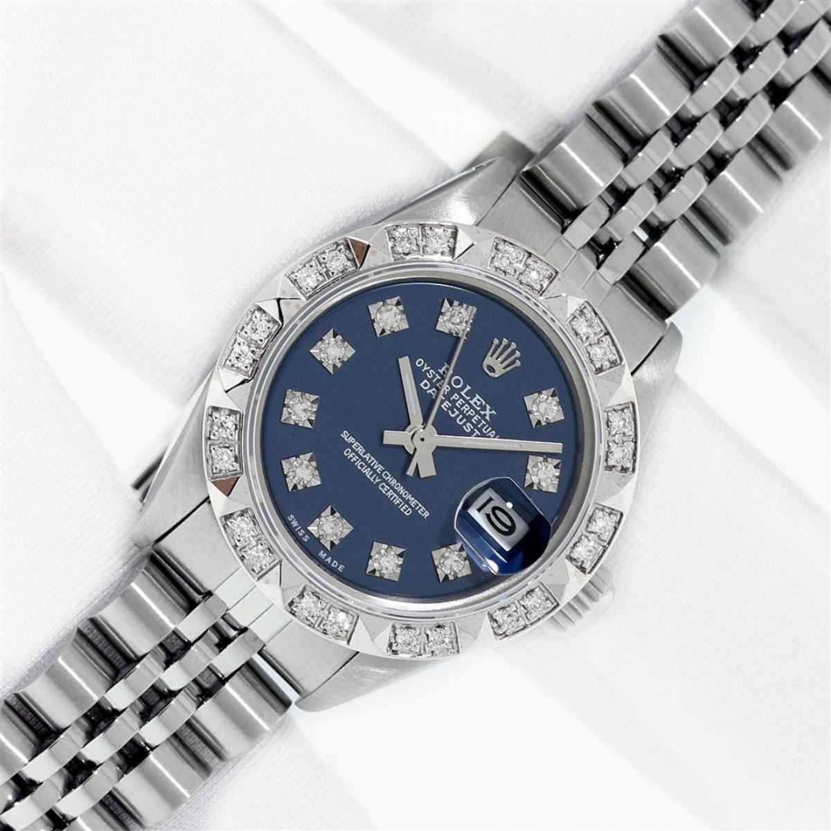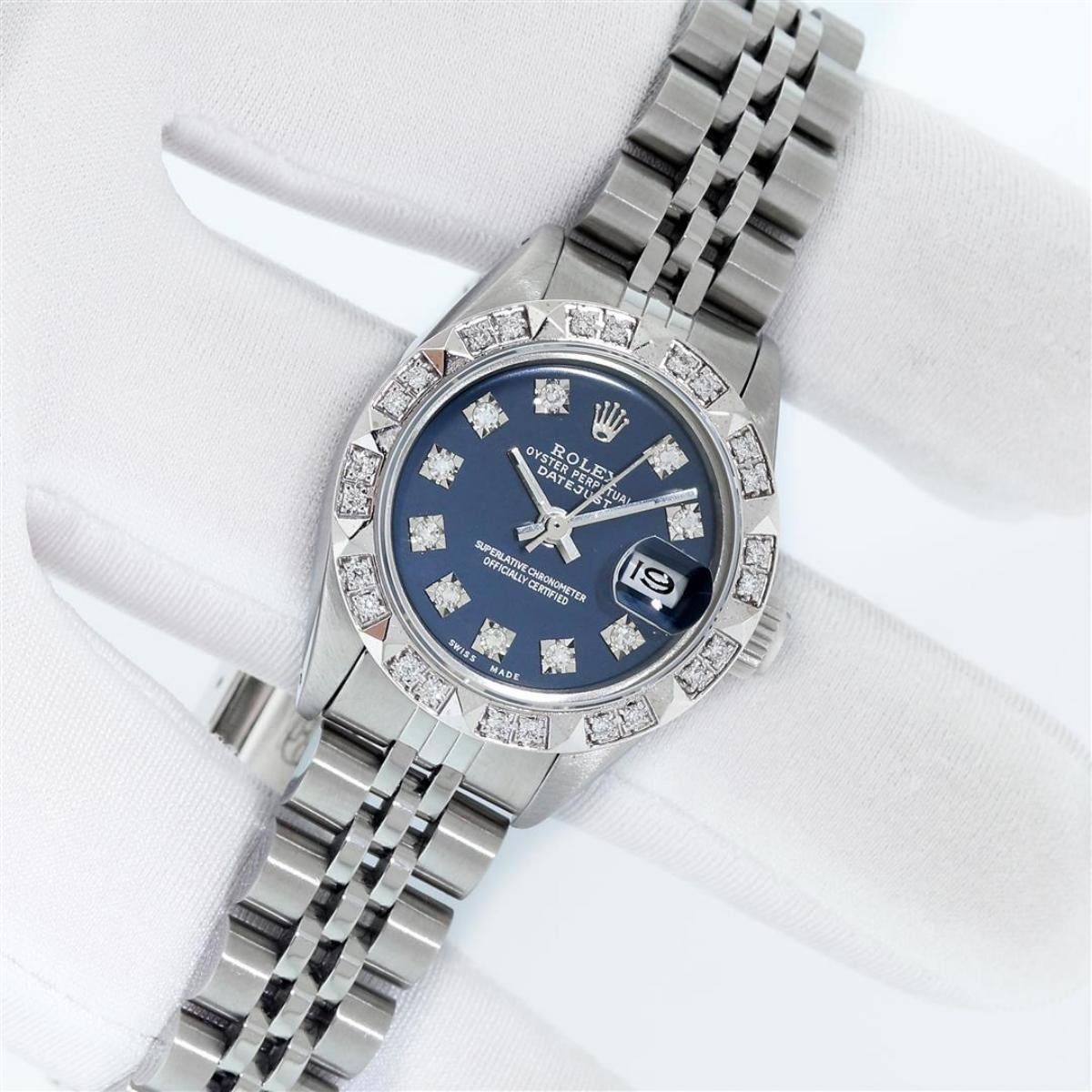 One Ladies Stainless Steel Rolex Datejust Polished Bright with Satin Finish, Serviced & Electronically Tested, Stainless Steel Case: 26mm, Stainless Steel Crown, Custom Bezel: New 18K White Gold Pyramid Diamond Bezel, Diamond Count: 24 Diamonds In Dial. Total Weight .50 Carat, Clarity: SI-VS, Color: G to H. Custom Crystal: New Scratch Resistant Synthetic Sapphire Cyclops Lens. Custom Hands: New Luminescent Hands. Movement: Automatic Winding Movement. Custom Dial: Blue Diamond Dial. Diamond Count: 10 Diamonds In Dial. Clarity: SI-VS, Color: G to H. Date Window: 3 O'Clock Position Date Display, Model: Datejust. Condition: G-6 Extra Fine. Bracelet: Stainless Steel Jubilee Band With Rolex Crown On Buckle. Bright Polish & Satin Finish. Band Length: 6.0 Inch Length, Adjustable. Standard Clasp, With Rolex Logo. This Watch Has Been Serviced Time Tested And Is In Excellent Condition It Is Free Of All Scratches And Dents. This Watch Comes With A Rolex Box.