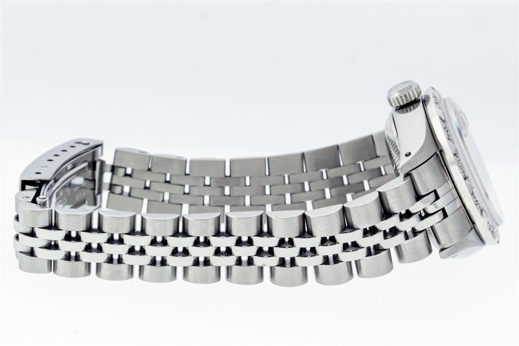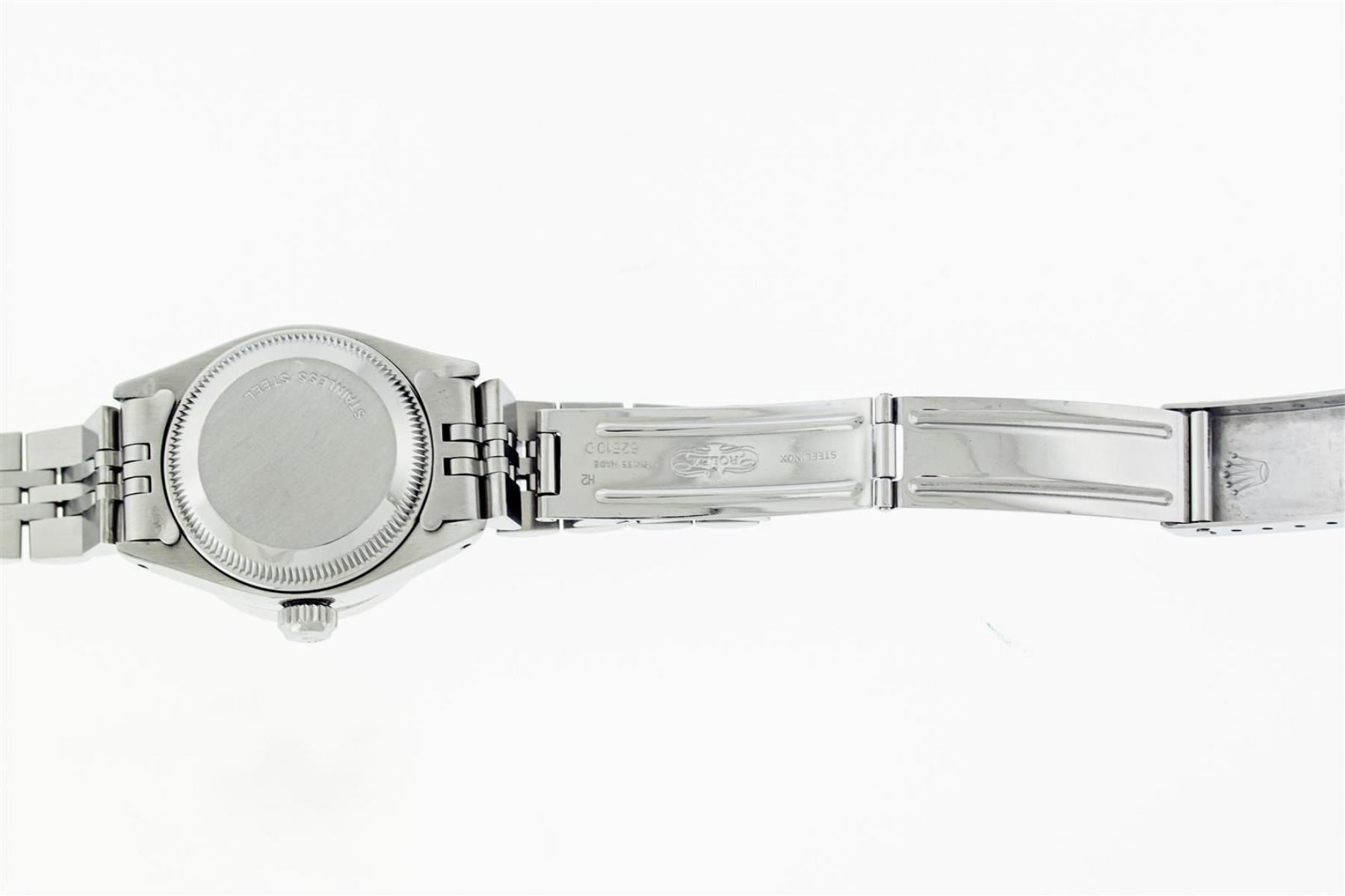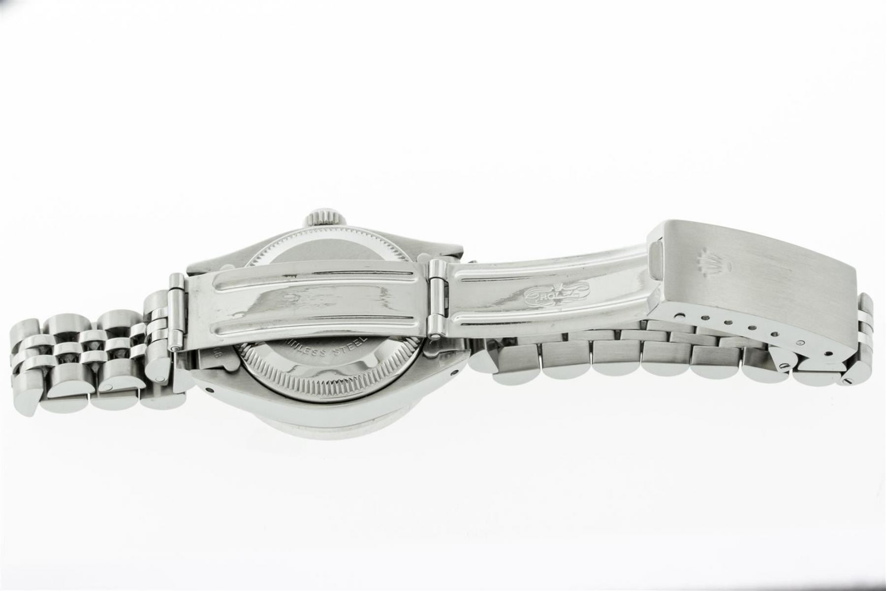 One Ladies Stainless Steel Rolex Datejust Polished Bright with Satin Finish, Serviced & Electronically Tested, Stainless Steel Case: 26mm, Stainless Steel Crown, Custom Bezel: New 18K White Gold Pyramid Diamond Bezel, Diamond Count: 24 Diamonds In Dial. Total Weight .50 Carat, Clarity: SI-VS, Color: G to H. Custom Crystal: New Scratch Resistant Synthetic Sapphire Cyclops Lens. Custom Hands: New Luminescent Hands. Movement: Automatic Winding Movement. Custom Dial: Blue Diamond Dial. Diamond Count: 10 Diamonds In Dial. Clarity: SI-VS, Color: G to H. Date Window: 3 O'Clock Position Date Display, Model: Datejust. Condition: G-6 Extra Fine. Bracelet: Stainless Steel Jubilee Band With Rolex Crown On Buckle. Bright Polish & Satin Finish. Band Length: 6.0 Inch Length, Adjustable. Standard Clasp, With Rolex Logo. This Watch Has Been Serviced Time Tested And Is In Excellent Condition It Is Free Of All Scratches And Dents. This Watch Comes With A Rolex Box.