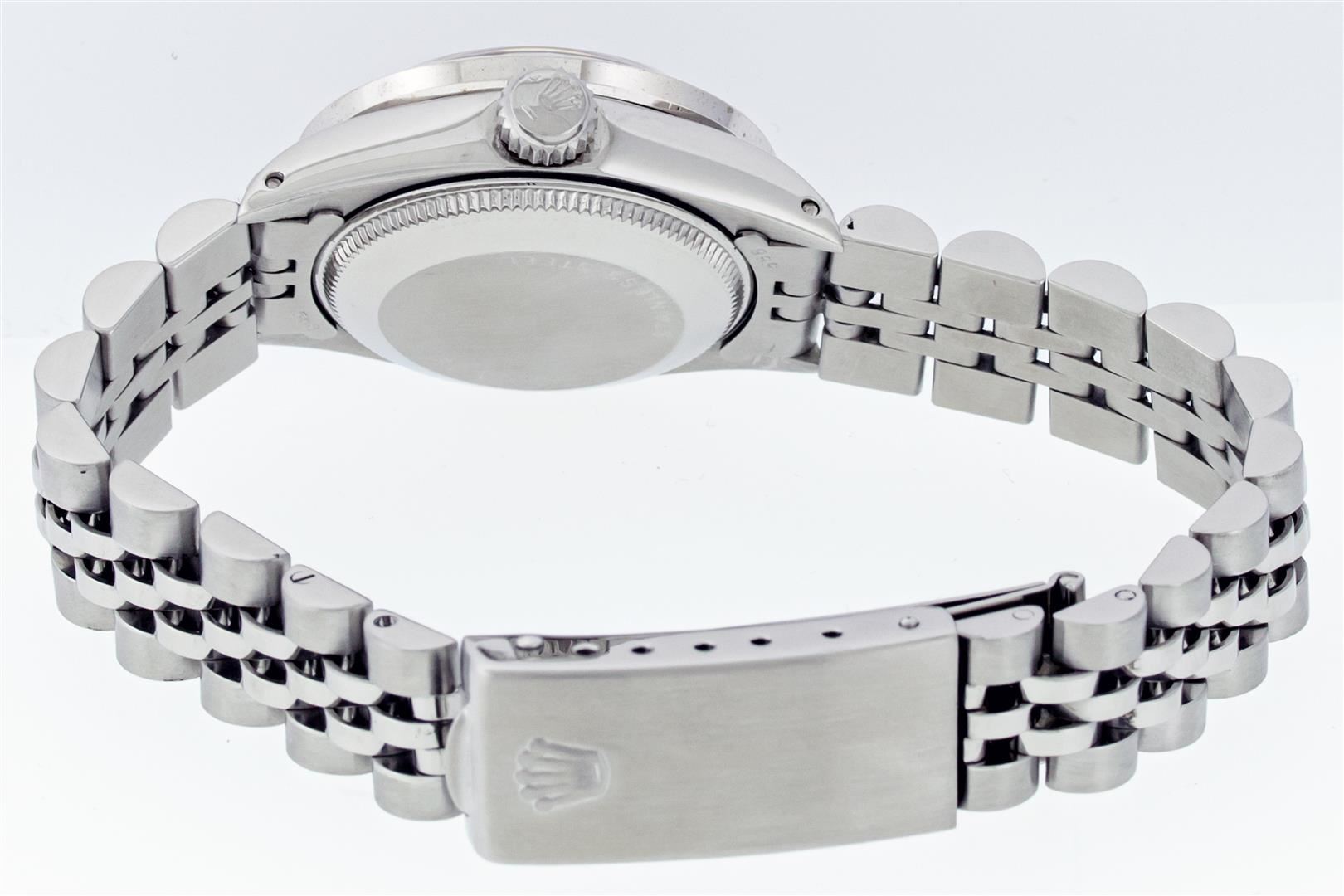 One Ladies Stainless Steel Rolex Datejust Polished Bright with Satin Finish, Serviced & Electronically Tested, Stainless Steel Case: 26mm, Stainless Steel Crown, Custom Bezel: New 18K White Gold Pyramid Diamond Bezel, Diamond Count: 24 Diamonds In Dial. Total Weight .50 Carat, Clarity: SI-VS, Color: G to H. Custom Crystal: New Scratch Resistant Synthetic Sapphire Cyclops Lens. Custom Hands: New Luminescent Hands. Movement: Automatic Winding Movement. Dial: Salmon Roman Dial. Date Window: 3 O'Clock Position Date Display, Model: Datejust. Condition: G-6 Extra Fine. Bracelet: Stainless Steel Jubilee Band With Rolex Crown On Buckle. Bright Polish & Satin Finish. Band Length: 6.0 Inch Length, Adjustable. Standard Clasp, With Rolex Logo. This Watch Has Been Serviced Time Tested And Is In Excellent Condition It Is Free Of All Scratches And Dents. This Watch Comes With A Rolex Box.