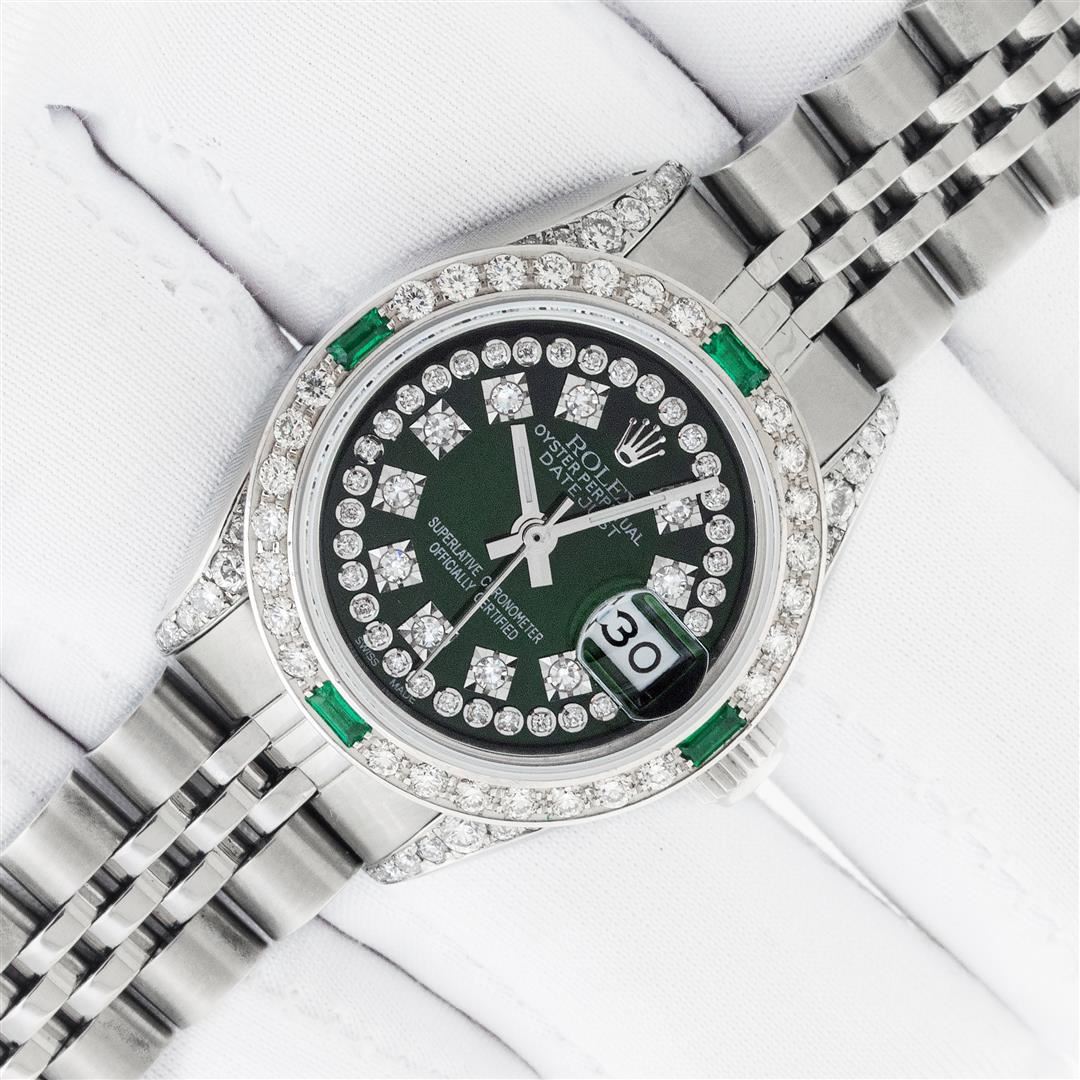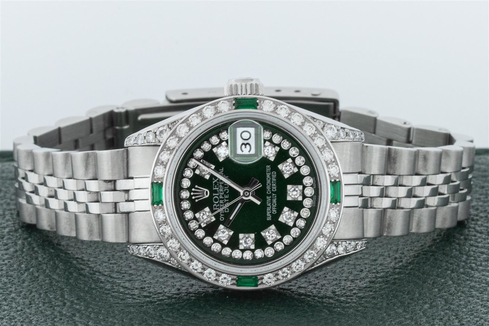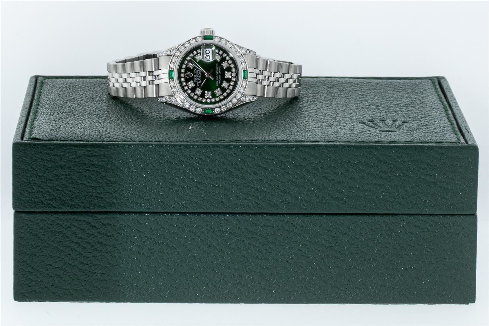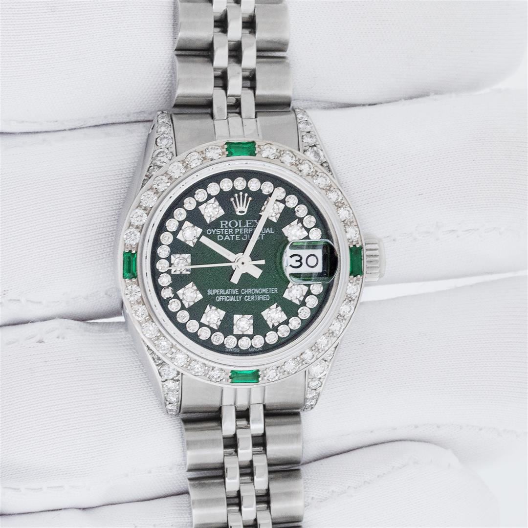 One Ladies Stainless Steel Rolex Datejust Polished Bright with Satin Finish, Serviced & Electronically Tested, Stainless Steel Case: 26mm, Stainless Steel Crown, Diamond Lugs: 24 Diamonds On Lugs, Clarity: SI-VS, Color: G to H. Custom Bezel: New 18K White Gold Diamond + Emerald Beadset Diamond Bezel, Stone Count: 28 Diamonds + 4 Emeralds, Total Weight .70 Carat, Clarity: SI-VS, Color: G to H. Custom Crystal: New Synthetic Sapphire Cyclops Lens. Custom Hands: New Luminescent Hands. Movement: Automatic Winding Movement. Custom Dial: Refinished Green String Diamond Dial, 43 Diamonds in Dial G To H In Color, Clarity: VS. Date Window: 3 O'Clock Position Date Display, Model: Datejust. Condition: G-6 Extra Fine. Bracelet: Stainless Steel Jubilee. Bright Polish & Satin Finish. 6.0 Inch Length, Adjustable. Standard Clasp, With Rolex Logo. This Watch Has Been Serviced Time Tested And Is In Excellent Condition It Is Free Of All Scratches And Dents. This Watch Comes With A Rolex Box.
