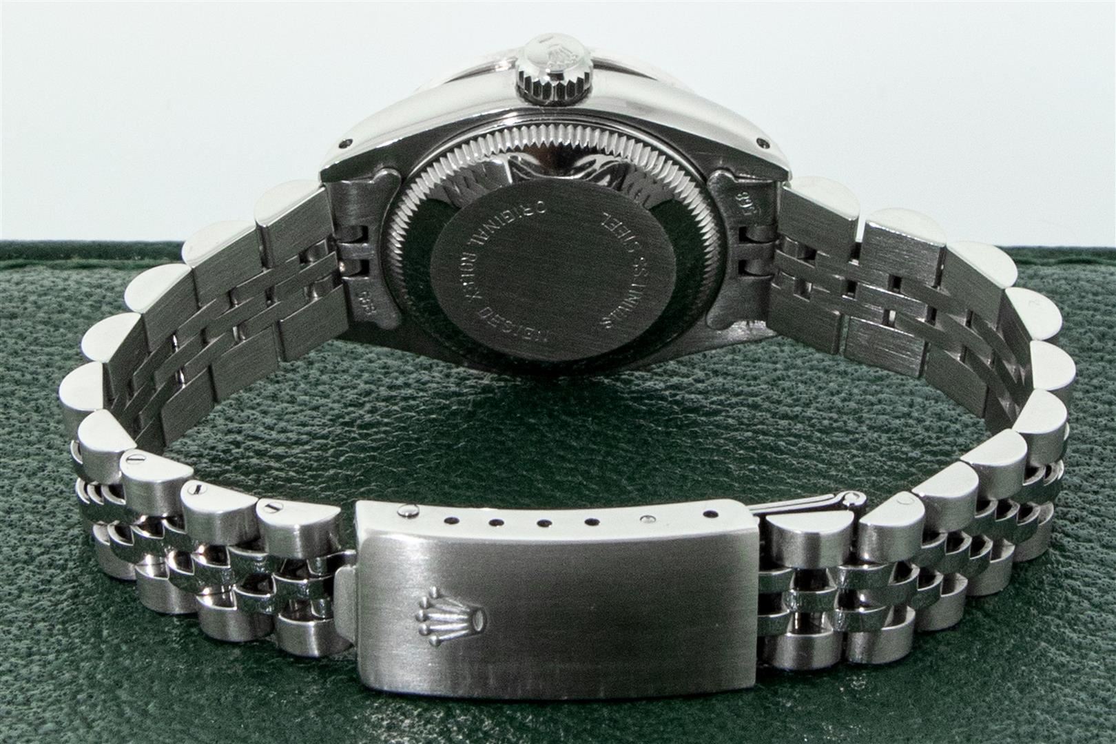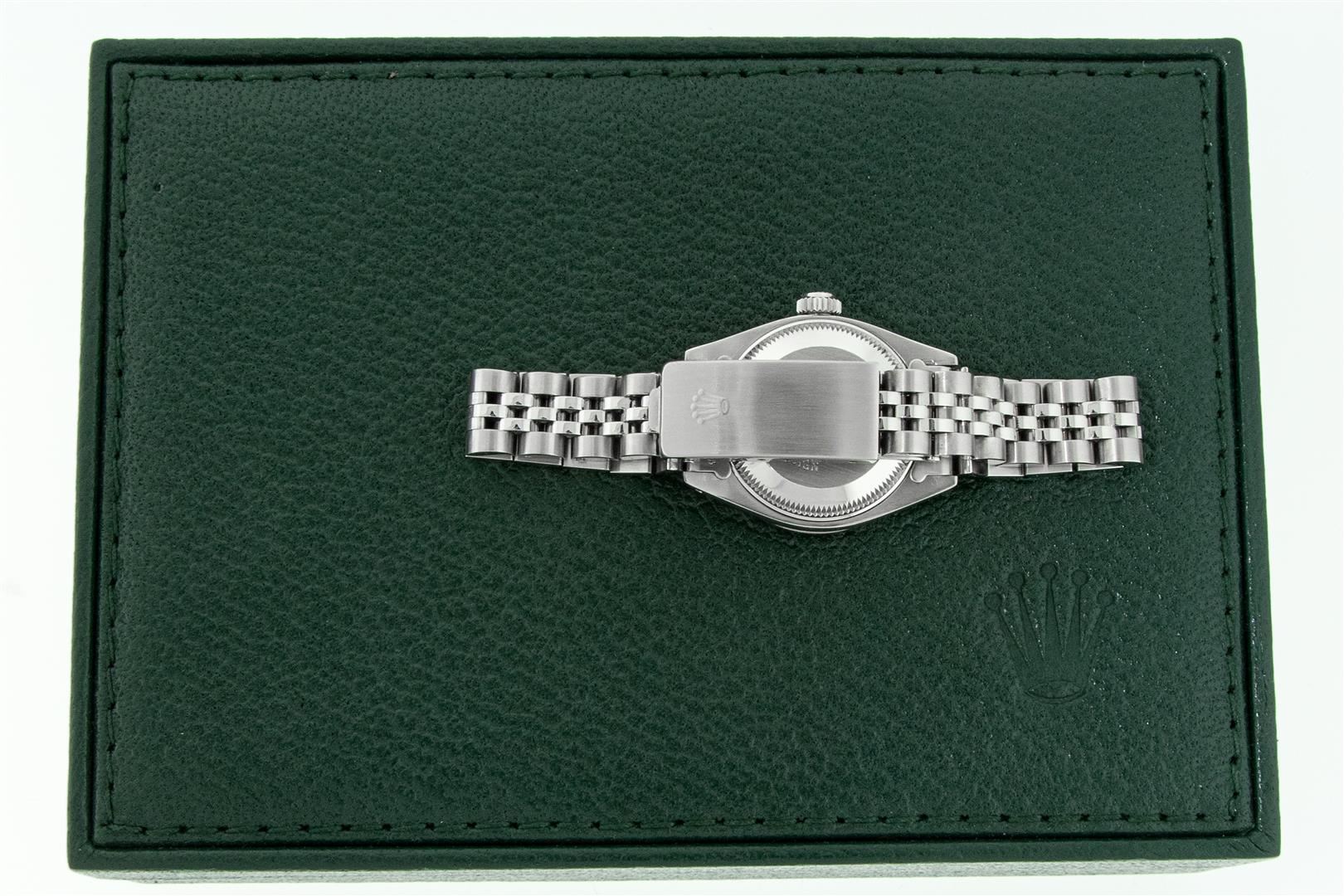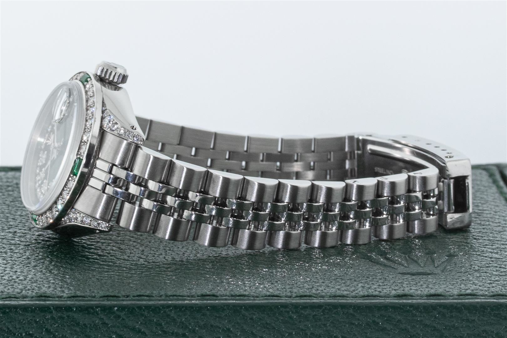 One Ladies Stainless Steel Rolex Datejust Polished Bright with Satin Finish, Serviced & Electronically Tested, Stainless Steel Case: 26mm, Stainless Steel Crown, Diamond Lugs: 24 Diamonds On Lugs, Clarity: SI-VS, Color: G to H. Custom Bezel: New 18K White Gold Diamond + Emerald Beadset Diamond Bezel, Stone Count: 28 Diamonds + 4 Emeralds, Total Weight .70 Carat, Clarity: SI-VS, Color: G to H. Custom Crystal: New Synthetic Sapphire Cyclops Lens. Custom Hands: New Luminescent Hands. Movement: Automatic Winding Movement. Custom Dial: Refinished Green String Diamond Dial, 43 Diamonds in Dial G To H In Color, Clarity: VS. Date Window: 3 O'Clock Position Date Display, Model: Datejust. Condition: G-6 Extra Fine. Bracelet: Stainless Steel Jubilee. Bright Polish & Satin Finish. 6.0 Inch Length, Adjustable. Standard Clasp, With Rolex Logo. This Watch Has Been Serviced Time Tested And Is In Excellent Condition It Is Free Of All Scratches And Dents. This Watch Comes With A Rolex Box.