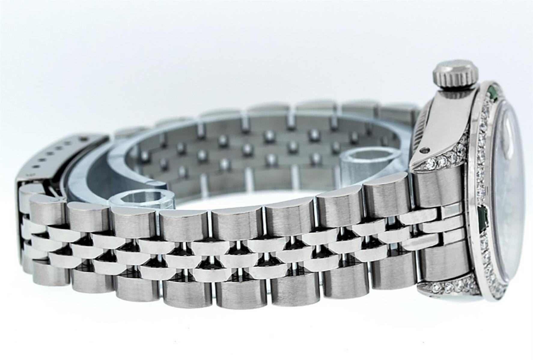 One Ladies Stainless Steel Rolex Datejust Polished Bright with Satin Finish, Serviced & Electronically Tested, Stainless Steel Case: 26mm, Stainless Steel Crown, Diamond Lugs: 24 Diamonds On Lugs, Clarity: SI-VS, Color: G to H. Custom Bezel: New 18K White Gold Diamond + Emerald Beadset Diamond Bezel, Stone Count: 28 Diamonds + 4 Emeralds, Total Weight .70 Carat, Clarity: SI-VS, Color: G to H. Custom Crystal: New Synthetic Sapphire Cyclops Lens. Custom Hands: New Luminescent Hands. Movement: Automatic Winding Movement. Custom Dial: Refinished Green String Diamond Dial, 43 Diamonds in Dial G To H In Color, Clarity: VS. Date Window: 3 O'Clock Position Date Display, Model: Datejust. Condition: G-6 Extra Fine. Bracelet: Stainless Steel Jubilee. Bright Polish & Satin Finish. 6.0 Inch Length, Adjustable. Standard Clasp, With Rolex Logo. This Watch Has Been Serviced Time Tested And Is In Excellent Condition It Is Free Of All Scratches And Dents.