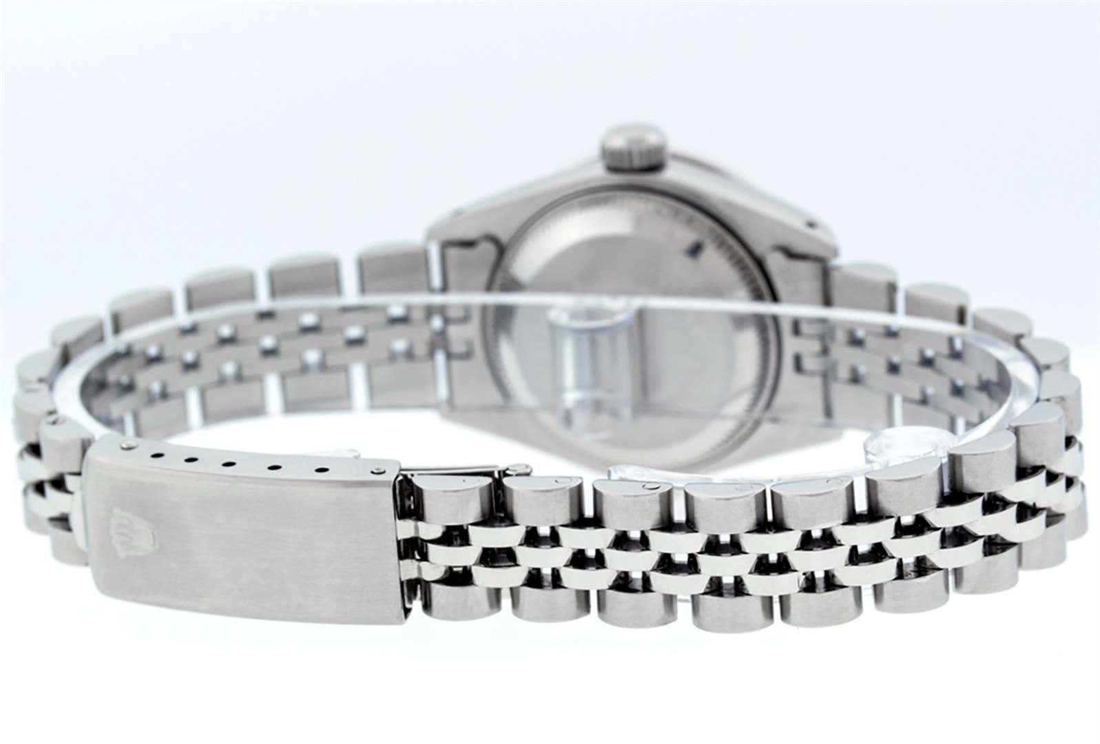 One Ladies Stainless Steel Rolex Datejust Polished Bright with Satin Finish, Serviced & Electronically Tested, Stainless Steel Case: 26mm, Stainless Steel Crown, Custom Diamond Lugs: 24 Diamonds On Lugs, Clarity: SI-VS, Color: G to H. Custom Bezel: New 18K White Gold Diamond Beadset Diamond Bezel, Stone Count: 32 Diamonds, Total Weight .70 Carat, Clarity: SI-VS, Color: G to H. Custom Crystal: New Scratch Resistant Synthetic Sapphire Cyclops Lens. Custom Hands: New Luminescent Hands. Movement: Automatic Winding Movement. Custom Dial: Refinished Green String Diamond Dial, 43 Diamonds in Dial G To H In Color, Clarity: VS. Date Window: 3 O'Clock Position Date Display, Model: Datejust. Condition: G-6 Extra Fine. Bracelet: Stainless Steel Jubilee Band. Bright Polish & Satin Finish. 6.0 Inch Length, Adjustable. Standard Clasp, With Rolex Logo. This Watch Has Been Serviced Time Tested And Is In Excellent Condition It Is Free Of All Scratches And Dents.