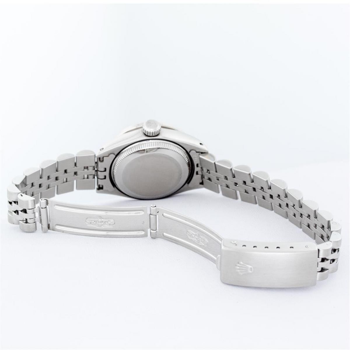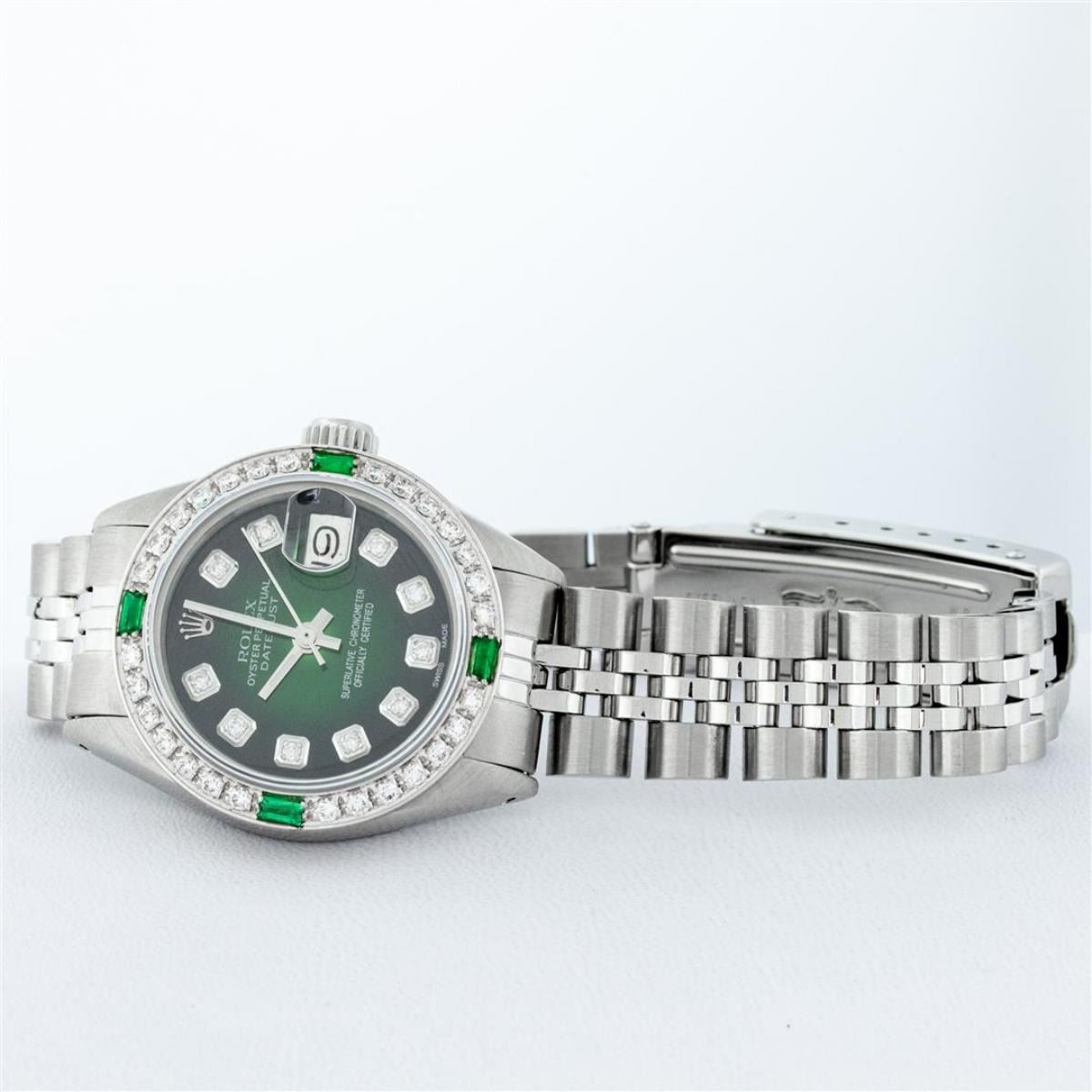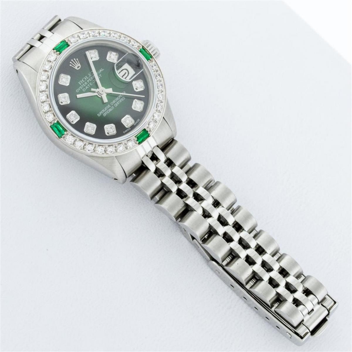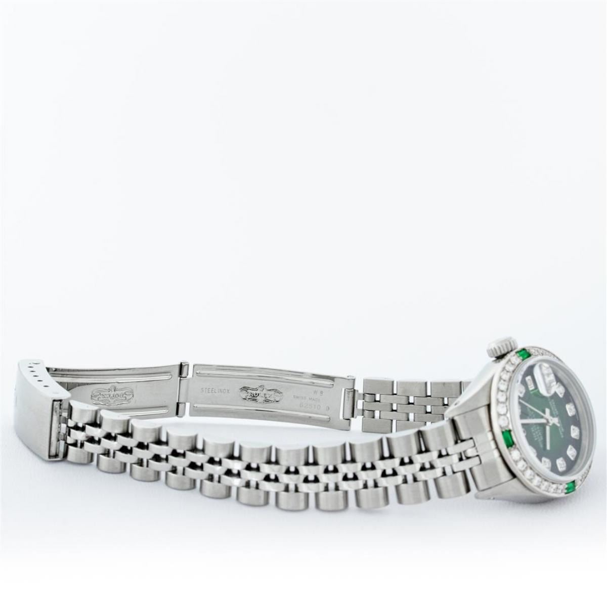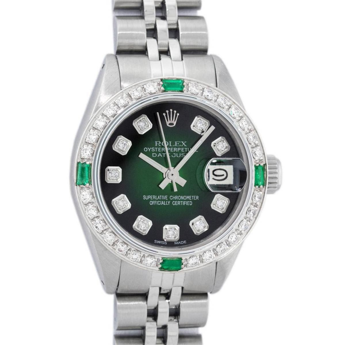 One Ladies Stainless Steel Rolex Datejust Polished Bright with Satin Finish, Serviced & Electronically Tested, Stainless Steel Case: 26mm, Stainless Steel Crown, Custom Bezel: New 18K White Gold Synthetic Emerald Beadset Diamond Bezel, Diamond + Gem Count: 28 Diamonds + 4 Synthetic Emeralds Total Weight .70 Carat, Clarity: SI-VS, Color: G to H. Custom Crystal: New Synthetic Sapphire Cyclops Lens. Custom Hands: New Luminescent Hands. Movement: Automatic Winding Movement. Custom Dial: Refinished Green Vignette With Diamond Hour Markers. Diamond Count: 10 Diamonds In Dial, Clarity: SI-VS, Color: G to H. Date Window: 3 O'Clock Position Date Display, Model: Datejust. Condition: G-6 Extra Fine. Bracelet: Stainless Steel Jubilee. Bright Polish & Satin Finish. 6.0 Inch Length, Adjustable. Standard Clasp, With Rolex Logo. This Watch Has Been Serviced Time Tested And Is In Excellent Condition It Is Free Of All Scratches And Dents.