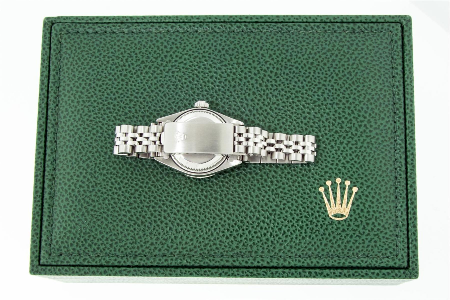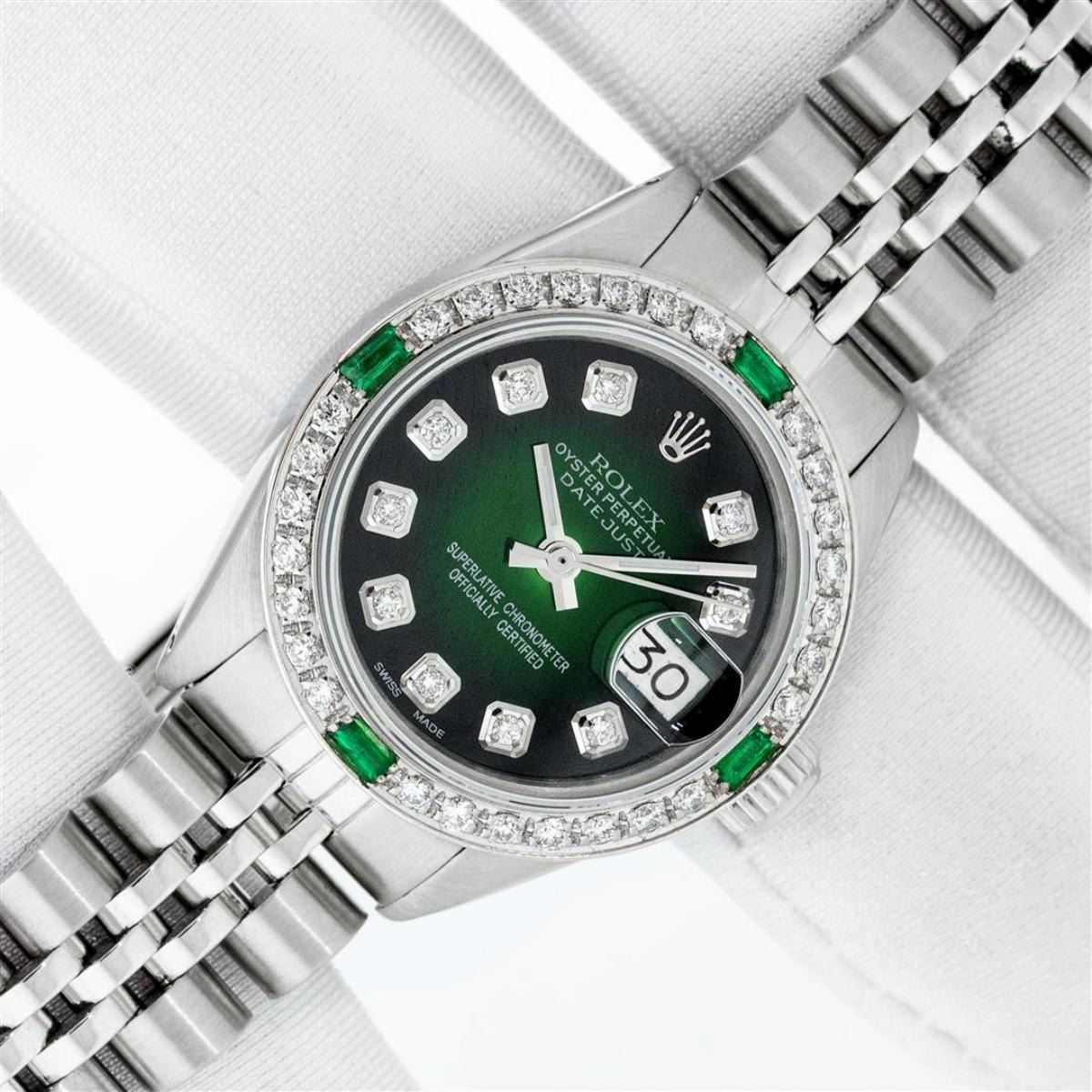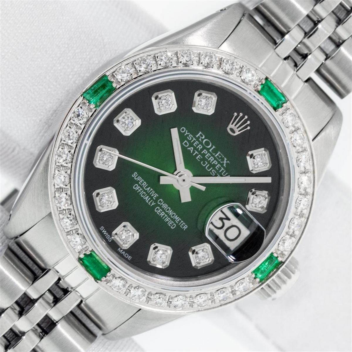 One Ladies Stainless Steel Rolex Datejust Polished Bright with Satin Finish, Serviced & Electronically Tested, Stainless Steel Case: 26mm, Stainless Steel Crown, Custom Bezel: New 18K White Gold Emerald Beadset Diamond Bezel, Diamond + Gem Count: 28 Diamonds + 4 Emeralds Total Weight .70 Carat, Clarity: SI-VS, Color: G to H. Custom Crystal: New Synthetic Sapphire Cyclops Lens. Custom Hands: New Luminescent Hands. Movement: Automatic Winding Movement. Custom Dial: Refinished Green Vignette With Diamond Hour Markers. Diamond Count: 10 Diamonds In Dial, Clarity: SI-VS, Color: G to H. Date Window: 3 O'Clock Position Date Display, Model: Datejust. Condition: G-6 Extra Fine. Bracelet: Stainless Steel Jubilee. Bright Polish & Satin Finish. 6.0 Inch Length, Adjustable. Standard Clasp, With Rolex Logo. This Watch Has Been Serviced Time Tested And Is In Excellent Condition It Is Free Of All Scratches And Dents. This Watch Comes With A Rolex Box.