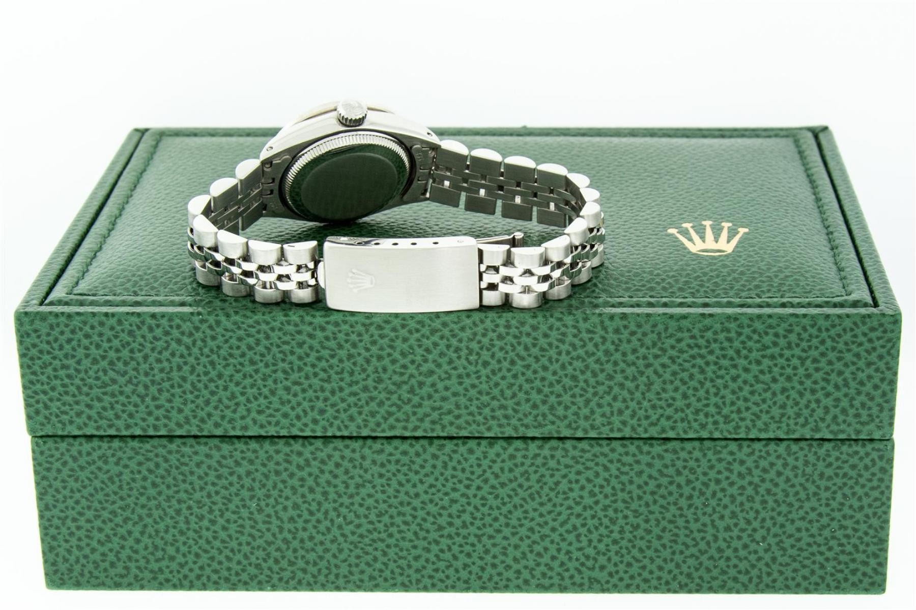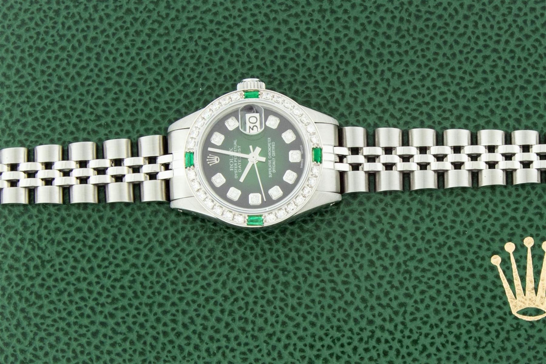 One Ladies Stainless Steel Rolex Datejust Polished Bright with Satin Finish, Serviced & Electronically Tested, Stainless Steel Case: 26mm, Stainless Steel Crown, Custom Bezel: New 18K White Gold Emerald Beadset Diamond Bezel, Diamond + Gem Count: 28 Diamonds + 4 Emeralds Total Weight .70 Carat, Clarity: SI-VS, Color: G to H. Custom Crystal: New Synthetic Sapphire Cyclops Lens. Custom Hands: New Luminescent Hands. Movement: Automatic Winding Movement. Custom Dial: Refinished Green Vignette With Diamond Hour Markers. Diamond Count: 10 Diamonds In Dial, Clarity: SI-VS, Color: G to H. Date Window: 3 O'Clock Position Date Display, Model: Datejust. Condition: G-6 Extra Fine. Bracelet: Stainless Steel Jubilee. Bright Polish & Satin Finish. 6.0 Inch Length, Adjustable. Standard Clasp, With Rolex Logo. This Watch Has Been Serviced Time Tested And Is In Excellent Condition It Is Free Of All Scratches And Dents. This Watch Comes With A Rolex Box.