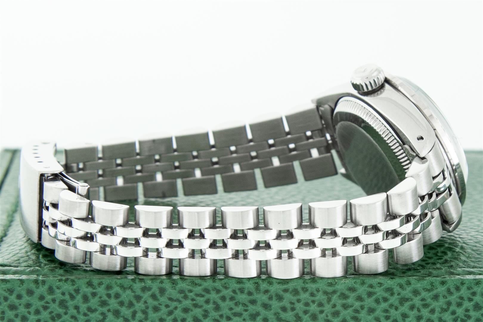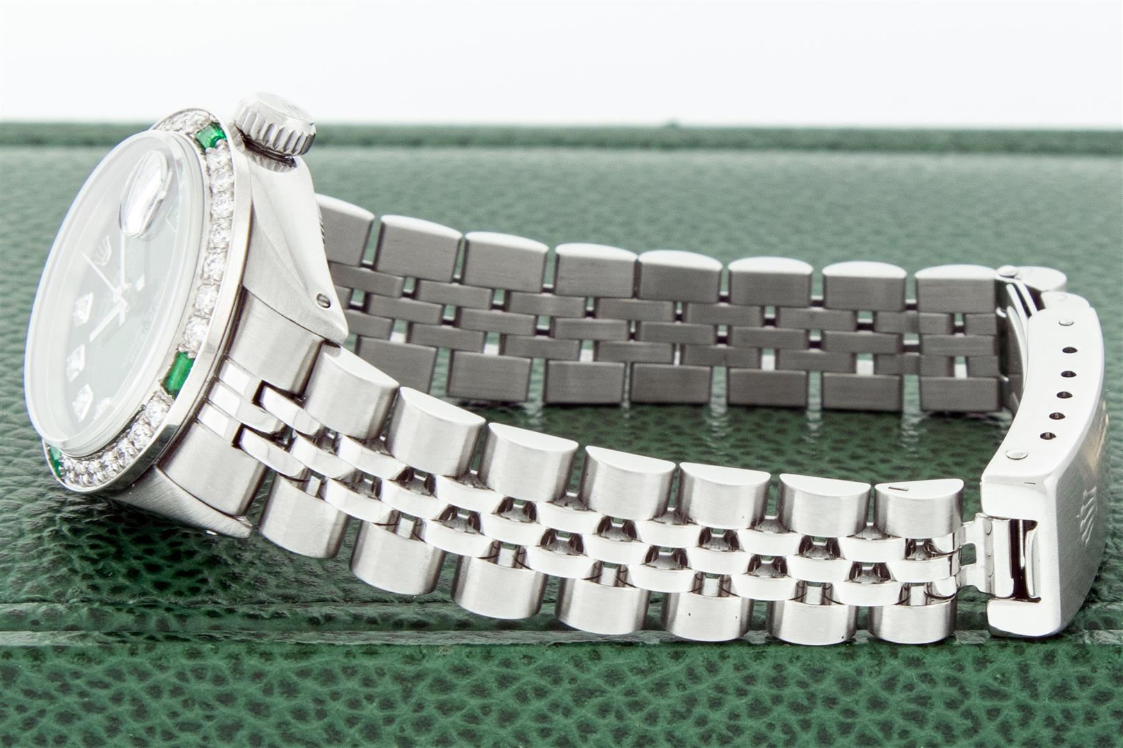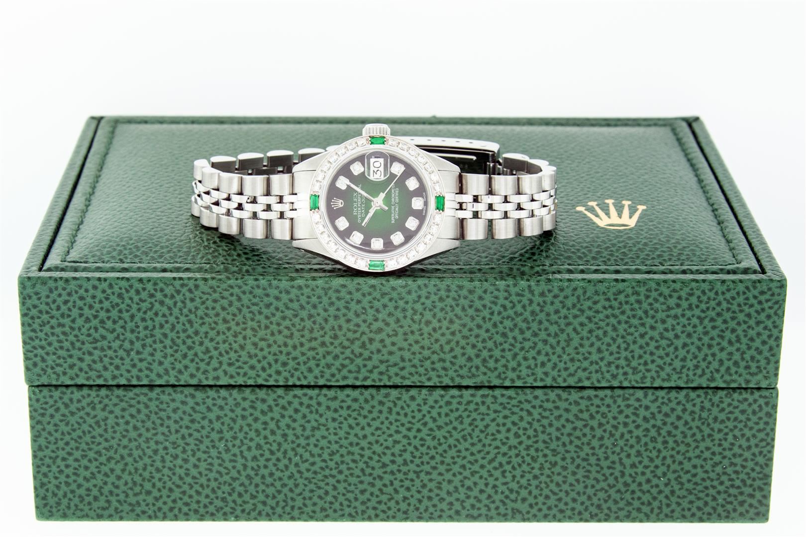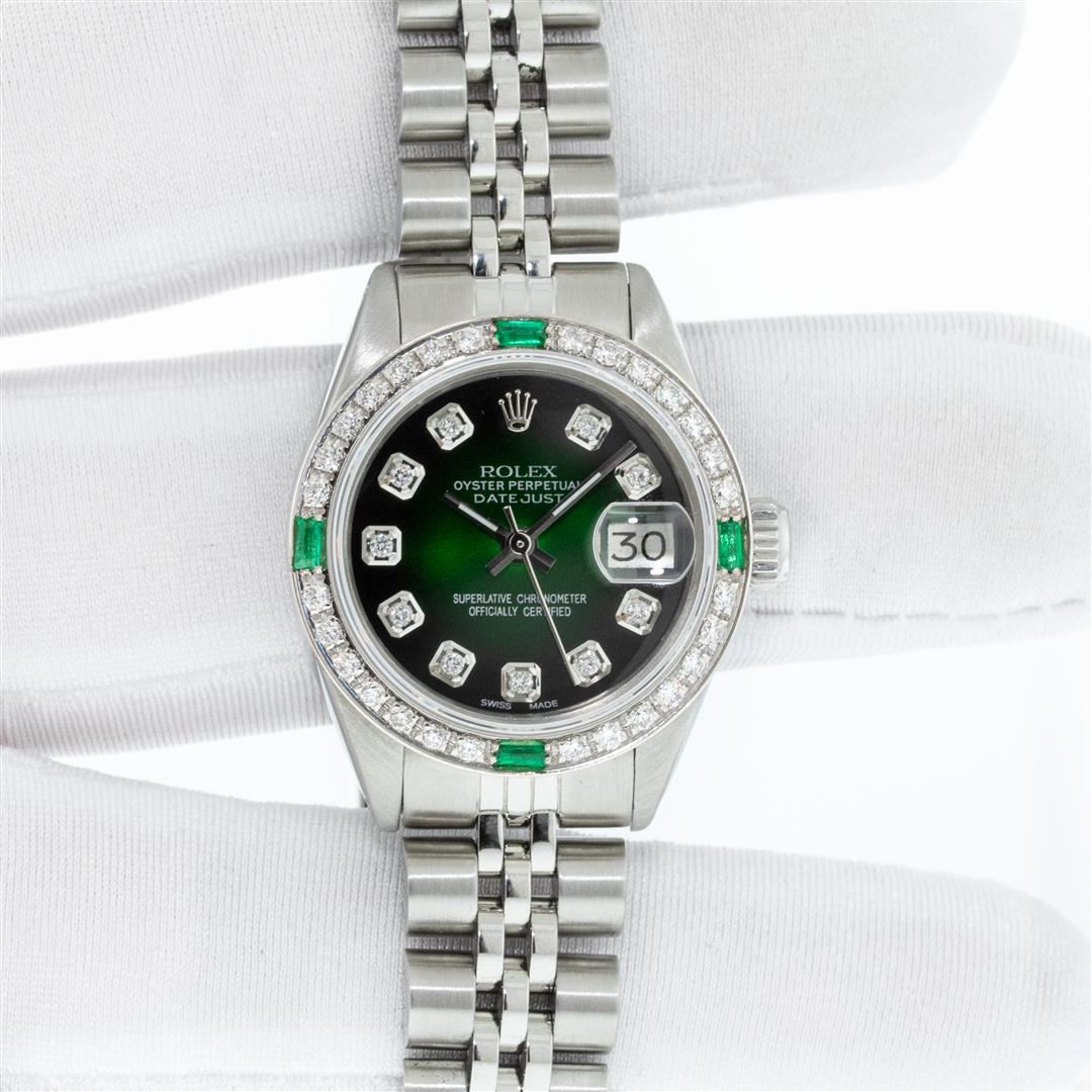 One Ladies Stainless Steel Rolex Datejust Polished Bright with Satin Finish, Serviced & Electronically Tested, Stainless Steel Case: 26mm, Stainless Steel Crown, Custom Bezel: New 18K White Gold Emerald Beadset Diamond Bezel, Diamond + Gem Count: 28 Diamonds + 4 Emeralds Total Weight .70 Carat, Clarity: SI-VS, Color: G to H. Custom Crystal: New Synthetic Sapphire Cyclops Lens. Custom Hands: New Luminescent Hands. Movement: Automatic Winding Movement. Custom Dial: Refinished Green Vignette With Diamond Hour Markers. Diamond Count: 10 Diamonds In Dial, Clarity: SI-VS, Color: G to H. Date Window: 3 O'Clock Position Date Display, Model: Datejust. Condition: G-6 Extra Fine. Bracelet: Stainless Steel Jubilee. Bright Polish & Satin Finish. 6.0 Inch Length, Adjustable. Standard Clasp, With Rolex Logo. This Watch Has Been Serviced Time Tested And Is In Excellent Condition It Is Free Of All Scratches And Dents. This Watch Comes With A Rolex Box.