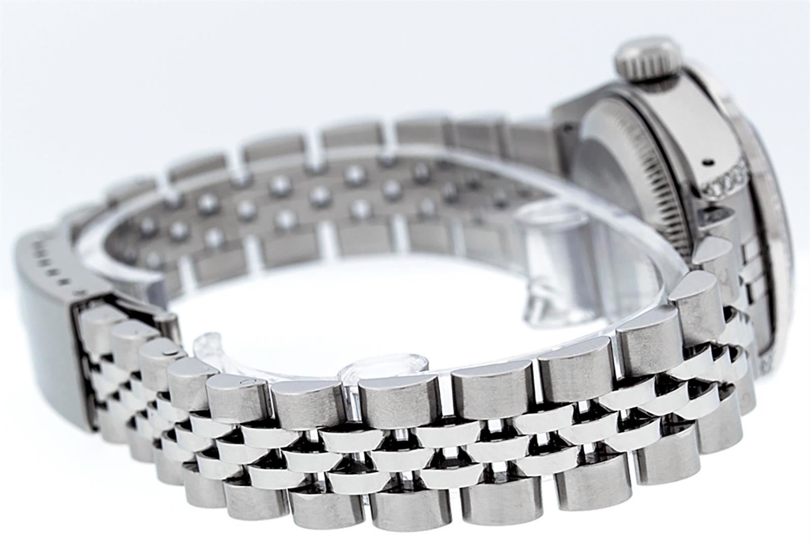 One Ladies Stainless Steel Rolex Datejust Polished Bright with Satin Finish, Serviced & Electronically Tested, Stainless Steel Case: 26mm, Stainless Steel Crown, Diamond Lugs: 24 Diamonds On Lugs, Clarity: SI-VS, Color: G to H. Custom Bezel: New 18K White Gold Diamond Beadset Diamond Bezel, Stone Count: 32 Diamonds, Total Weight .70 Carat, Clarity: SI-VS, Color: G to H. Custom Crystal: New Scratch Resistant Synthetic Sapphire Cyclops Lens. Custom Hands: New Luminescent Hands. Movement: Automatic Winding Movement. Custom Dial: Refinished Mother Of Pearl String Diamond Dial, 43 Diamonds in Dial G To H In Color, Clarity: VS. Date Window: 3 O'Clock Position Date Display, Model: Datejust. Condition: G-6 Extra Fine. Bracelet: Stainless Steel Jubilee Band. Bright Polish & Satin Finish. 6.0 Inch Length, Adjustable. Standard Clasp, With Rolex Logo. This Watch Has Been Serviced Time Tested And Is In Excellent Condition It Is Free Of All Scratches And Dents.