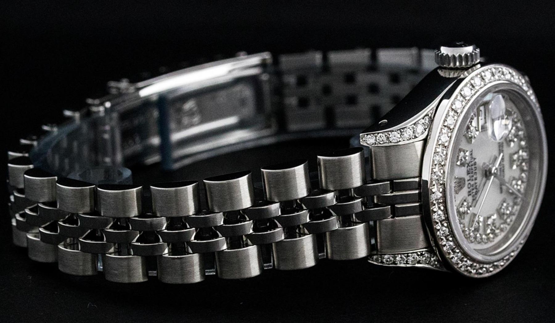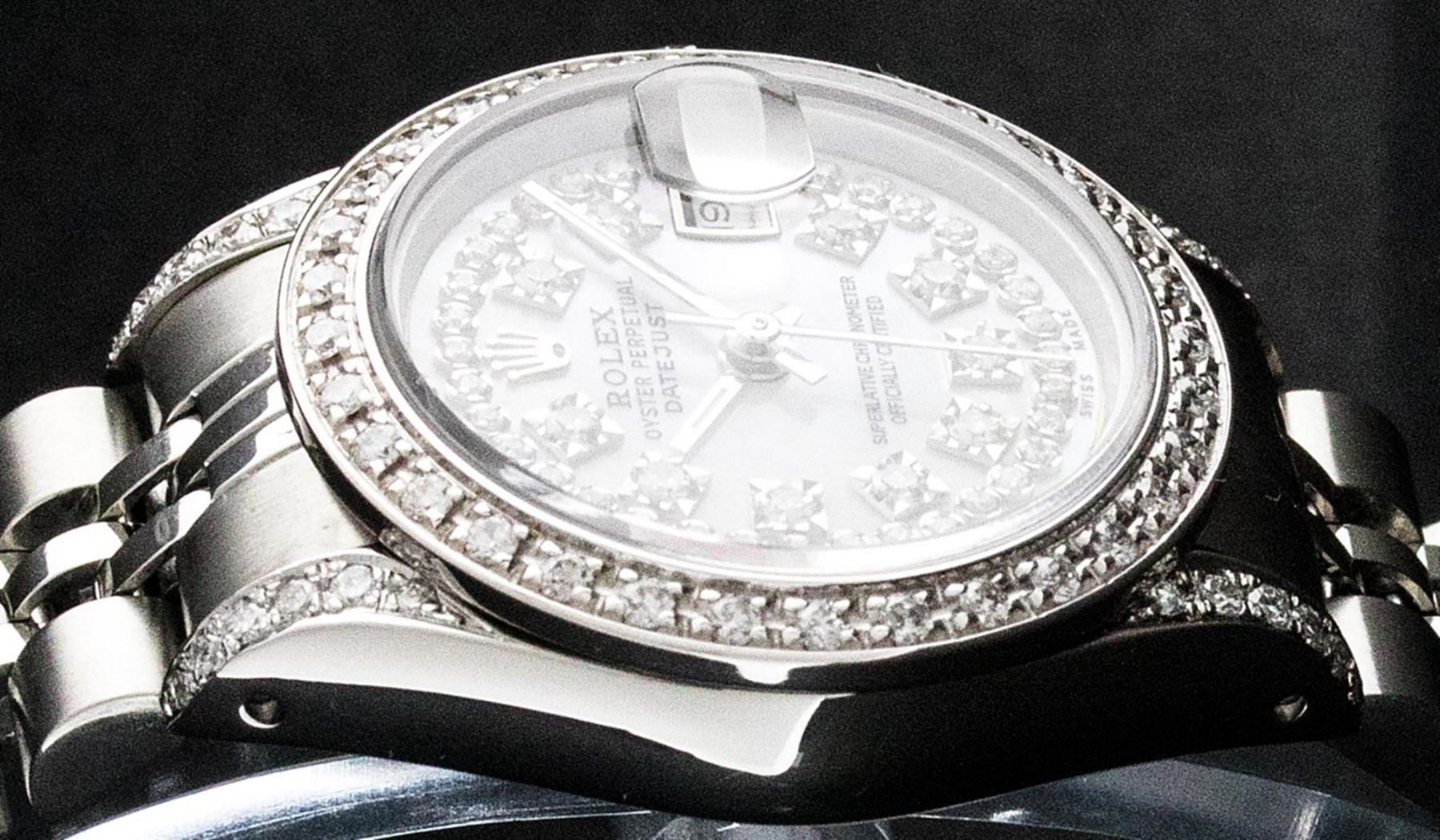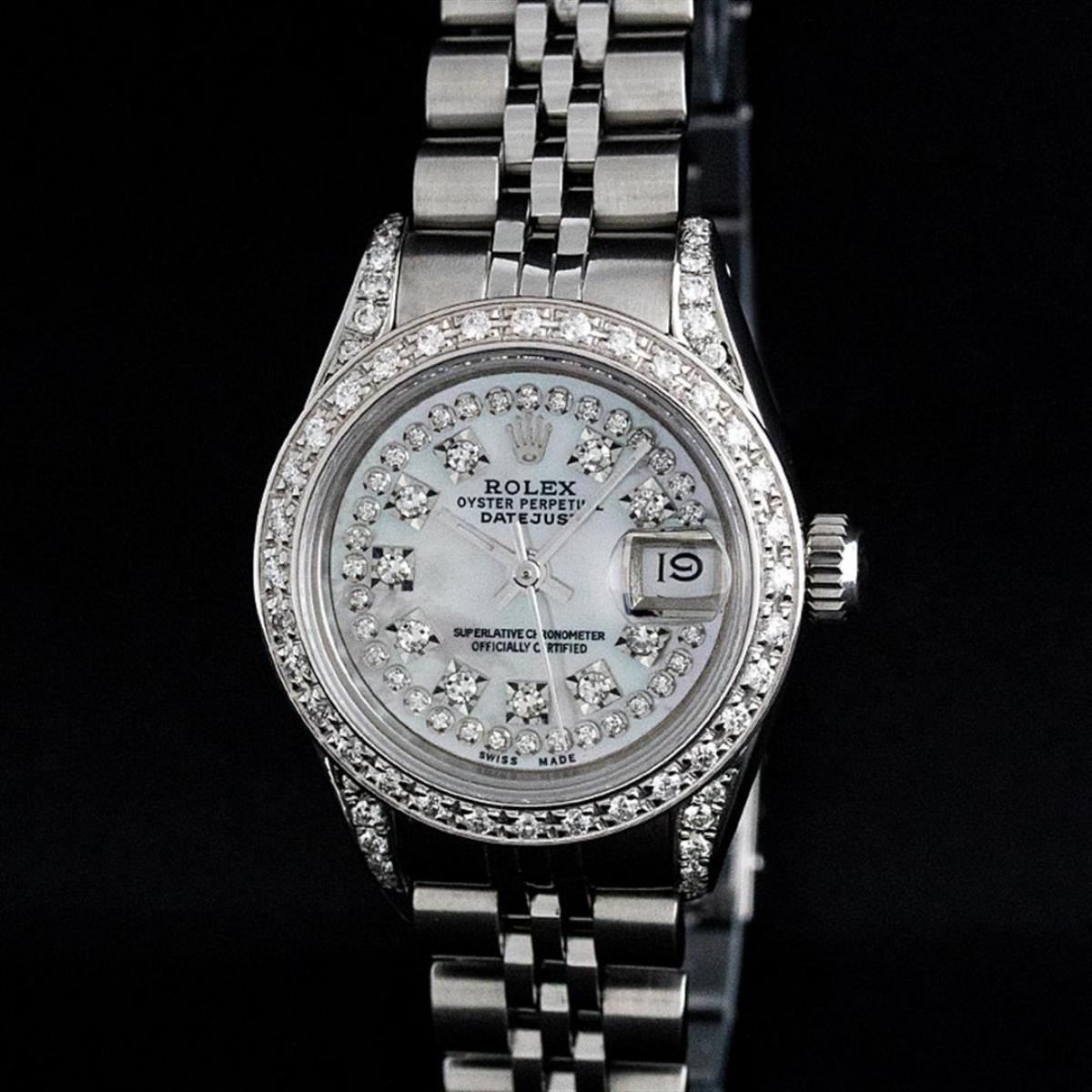 One Ladies Stainless Steel Rolex Datejust Polished Bright with Satin Finish, Serviced & Electronically Tested, Stainless Steel Case: 26mm, Stainless Steel Crown, Diamond Lugs: 24 Diamonds On Lugs, Clarity: SI-VS, Color: G to H. Custom Bezel: New 18K White Gold Diamond Beadset Diamond Bezel, Stone Count: 32 Diamonds, Total Weight .70 Carat, Clarity: SI-VS, Color: G to H. Custom Crystal: New Scratch Resistant Synthetic Sapphire Cyclops Lens. Custom Hands: New Luminescent Hands. Movement: Automatic Winding Movement. Custom Dial: Refinished Mother Of Pearl String Diamond Dial, 43 Diamonds in Dial G To H In Color, Clarity: VS. Date Window: 3 O'Clock Position Date Display, Model: Datejust. Condition: G-6 Extra Fine. Bracelet: Stainless Steel Jubilee Band. Bright Polish & Satin Finish. 6.0 Inch Length, Adjustable. Standard Clasp, With Rolex Logo. This Watch Has Been Serviced Time Tested And Is In Excellent Condition It Is Free Of All Scratches And Dents.