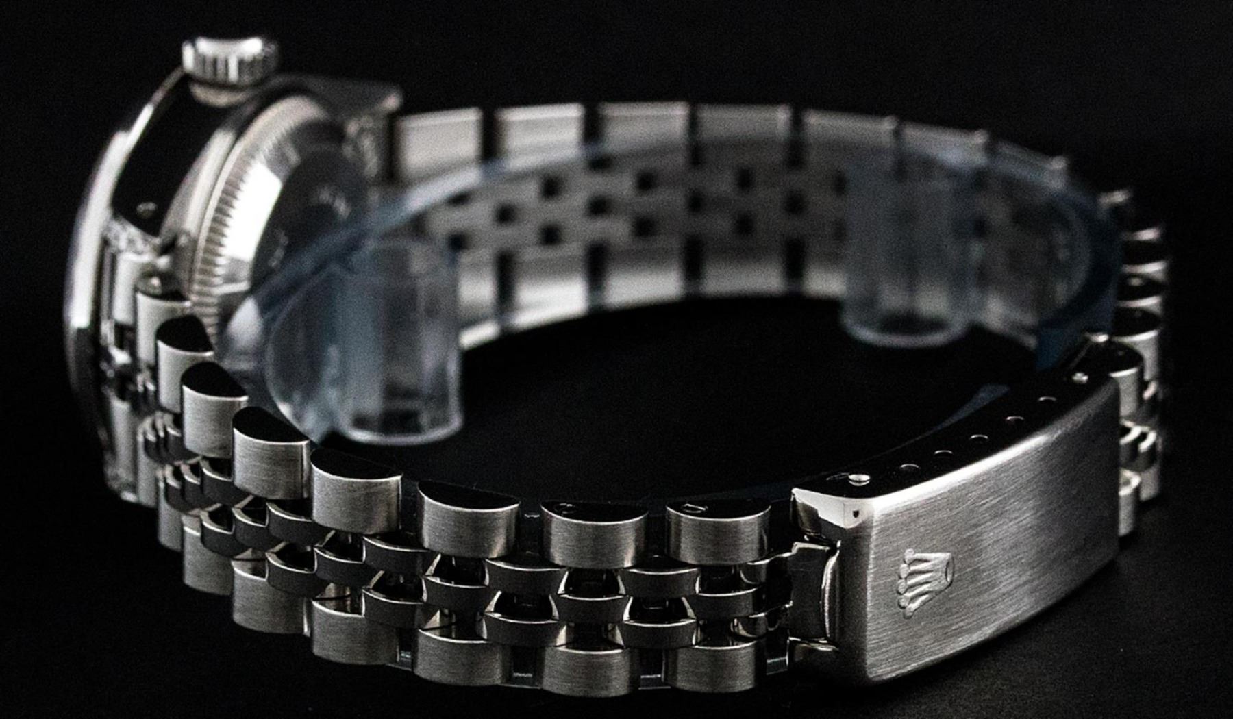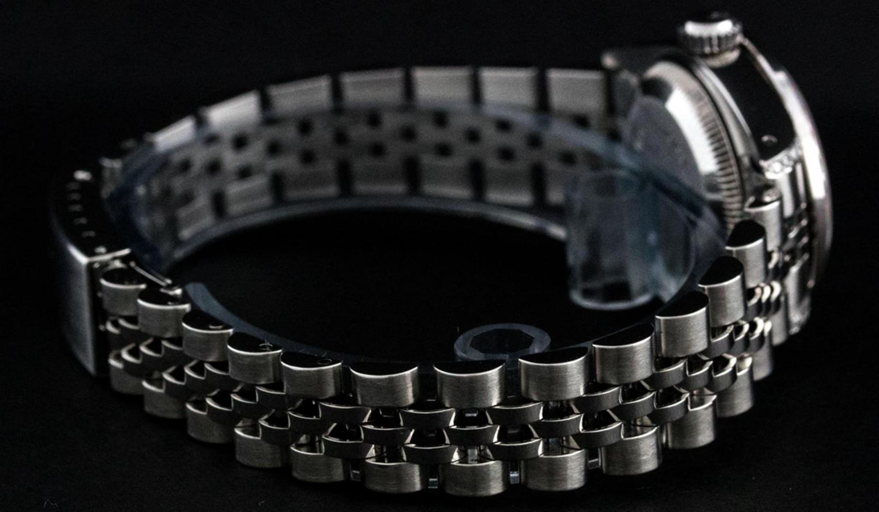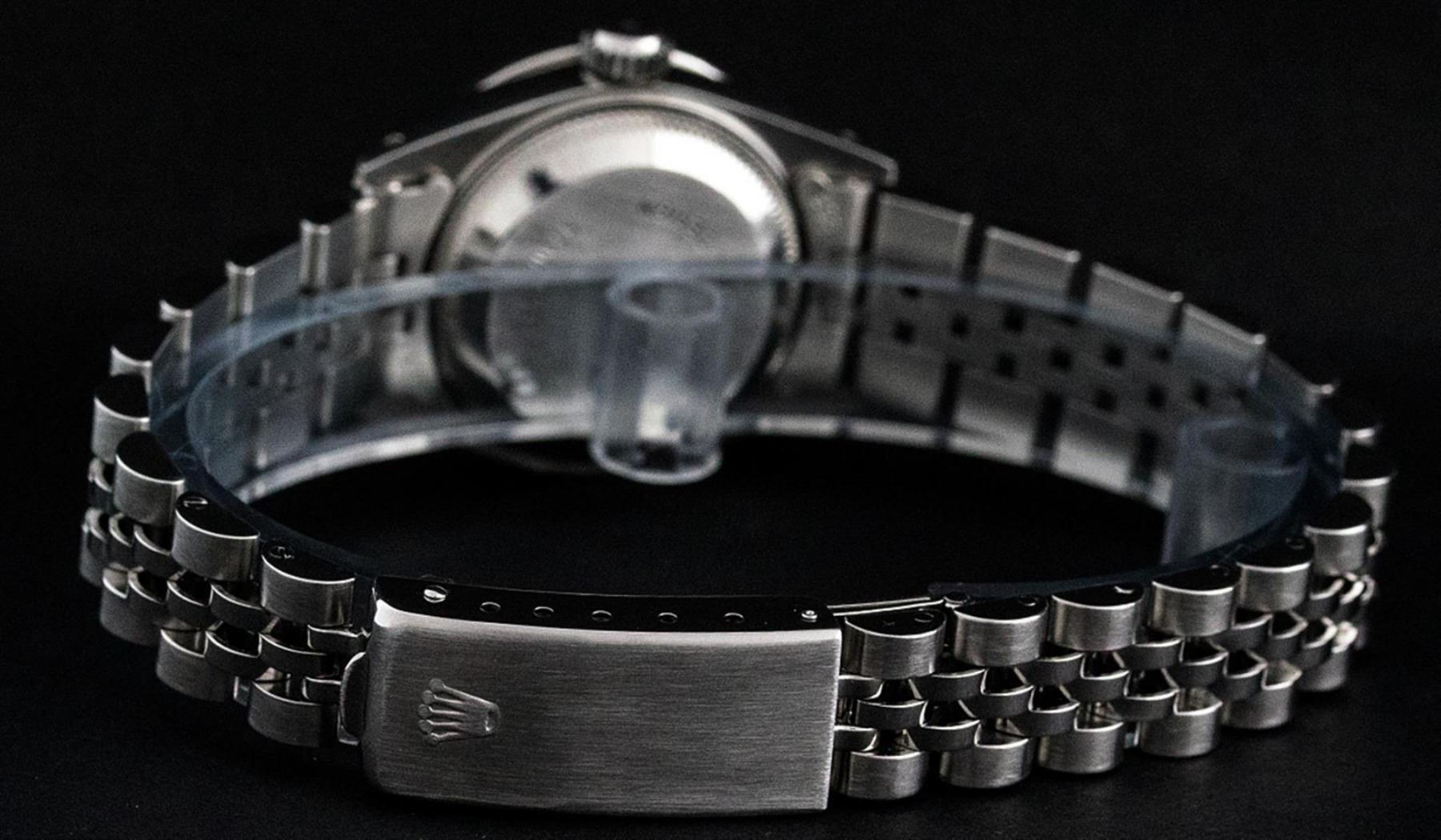 One Ladies Stainless Steel Rolex Datejust Polished Bright with Satin Finish, Serviced & Electronically Tested, Stainless Steel Case: 26mm, Stainless Steel Crown, Diamond Lugs: 24 Diamonds On Lugs, Clarity: SI-VS, Color: G to H. Custom Bezel: New 18K White Gold Diamond Beadset Diamond Bezel, Stone Count: 32 Diamonds, Total Weight .70 Carat, Clarity: SI-VS, Color: G to H. Custom Crystal: New Scratch Resistant Synthetic Sapphire Cyclops Lens. Custom Hands: New Luminescent Hands. Movement: Automatic Winding Movement. Custom Dial: Refinished Mother Of Pearl String Diamond Dial, 43 Diamonds in Dial G To H In Color, Clarity: VS. Date Window: 3 O'Clock Position Date Display, Model: Datejust. Condition: G-6 Extra Fine. Bracelet: Stainless Steel Jubilee Band. Bright Polish & Satin Finish. 6.0 Inch Length, Adjustable. Standard Clasp, With Rolex Logo. This Watch Has Been Serviced Time Tested And Is In Excellent Condition It Is Free Of All Scratches And Dents.