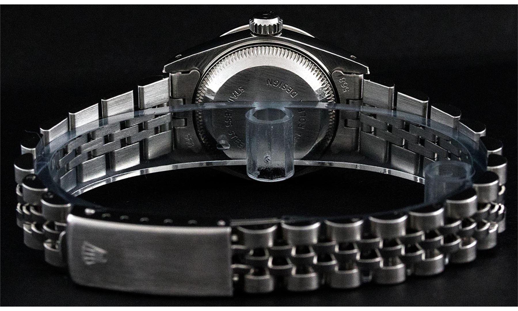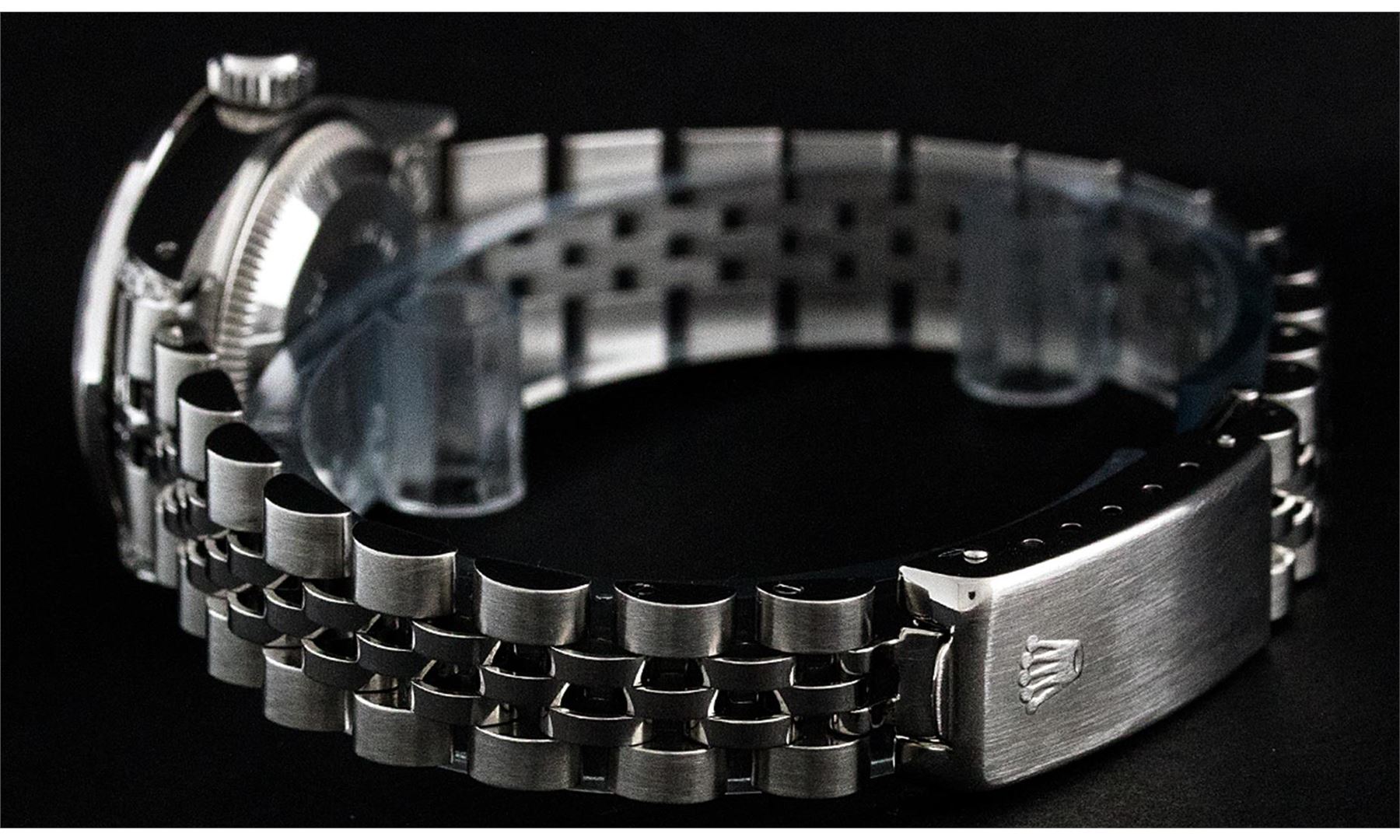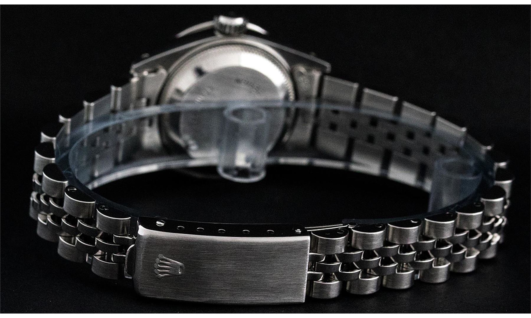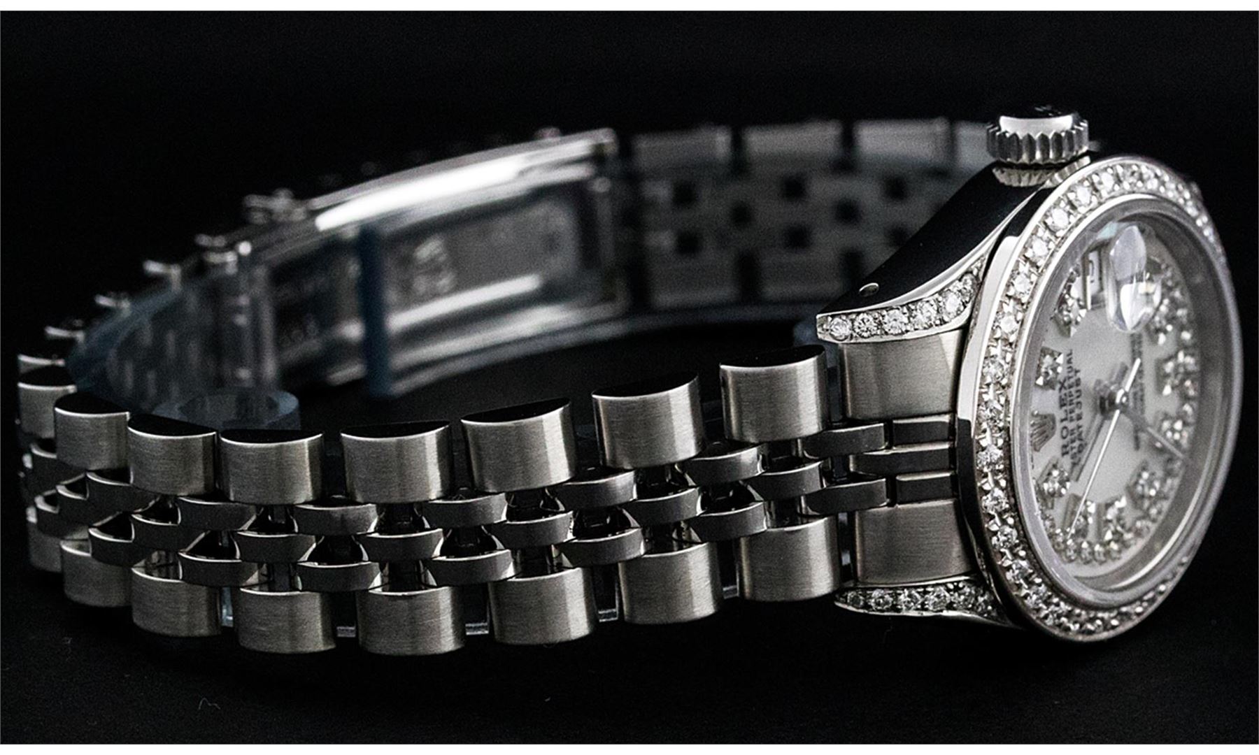 One Ladies Stainless Steel Rolex Datejust Polished Bright with Satin Finish, Serviced & Electronically Tested, Stainless Steel Case: 26mm, Stainless Steel Crown, Diamond Lugs: 24 Diamonds On Lugs, Clarity: SI-VS, Color: G to H. Custom Bezel: New 18K White Gold Diamond Beadset Diamond Bezel, Stone Count: 32 Diamonds, Total Weight .70 Carat, Clarity: SI-VS, Color: G to H. Custom Crystal: New Scratch Resistant Synthetic Sapphire Cyclops Lens. Custom Hands: New Luminescent Hands. Movement: Automatic Winding Movement. Custom Dial: Refinished Mother Of Pearl String Diamond Dial, 43 Diamonds in Dial G To H In Color, Clarity: VS. Date Window: 3 O'Clock Position Date Display, Model: Datejust. Condition: G-6 Extra Fine. Bracelet: Stainless Steel Jubilee Band. Bright Polish & Satin Finish. 6.0 Inch Length, Adjustable. Standard Clasp, With Rolex Logo. This Watch Has Been Serviced Time Tested And Is In Excellent Condition It Is Free Of All Scratches And Dents.