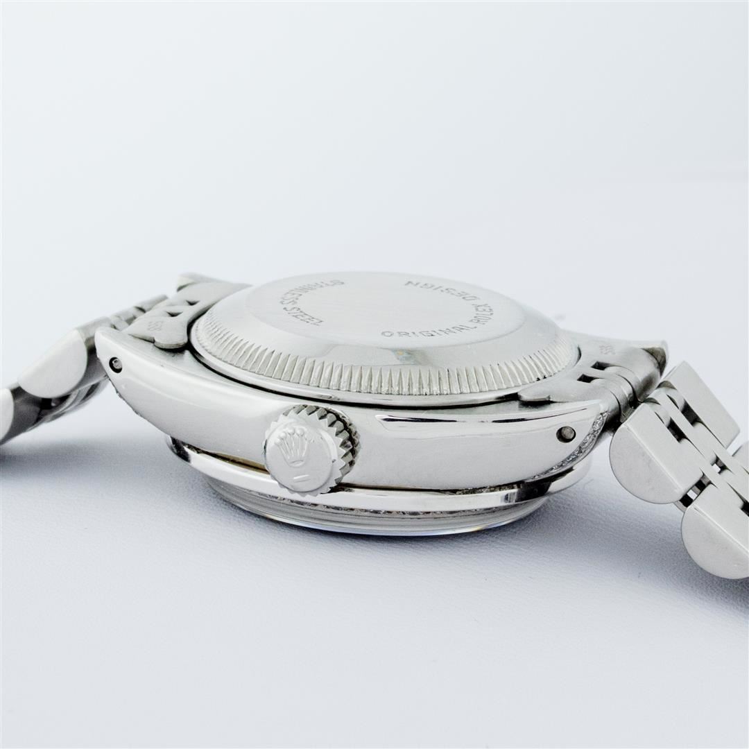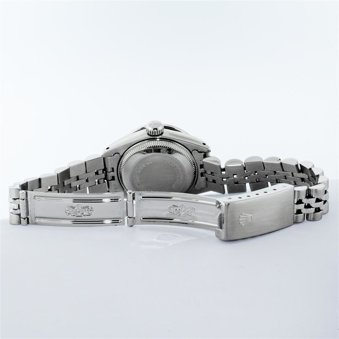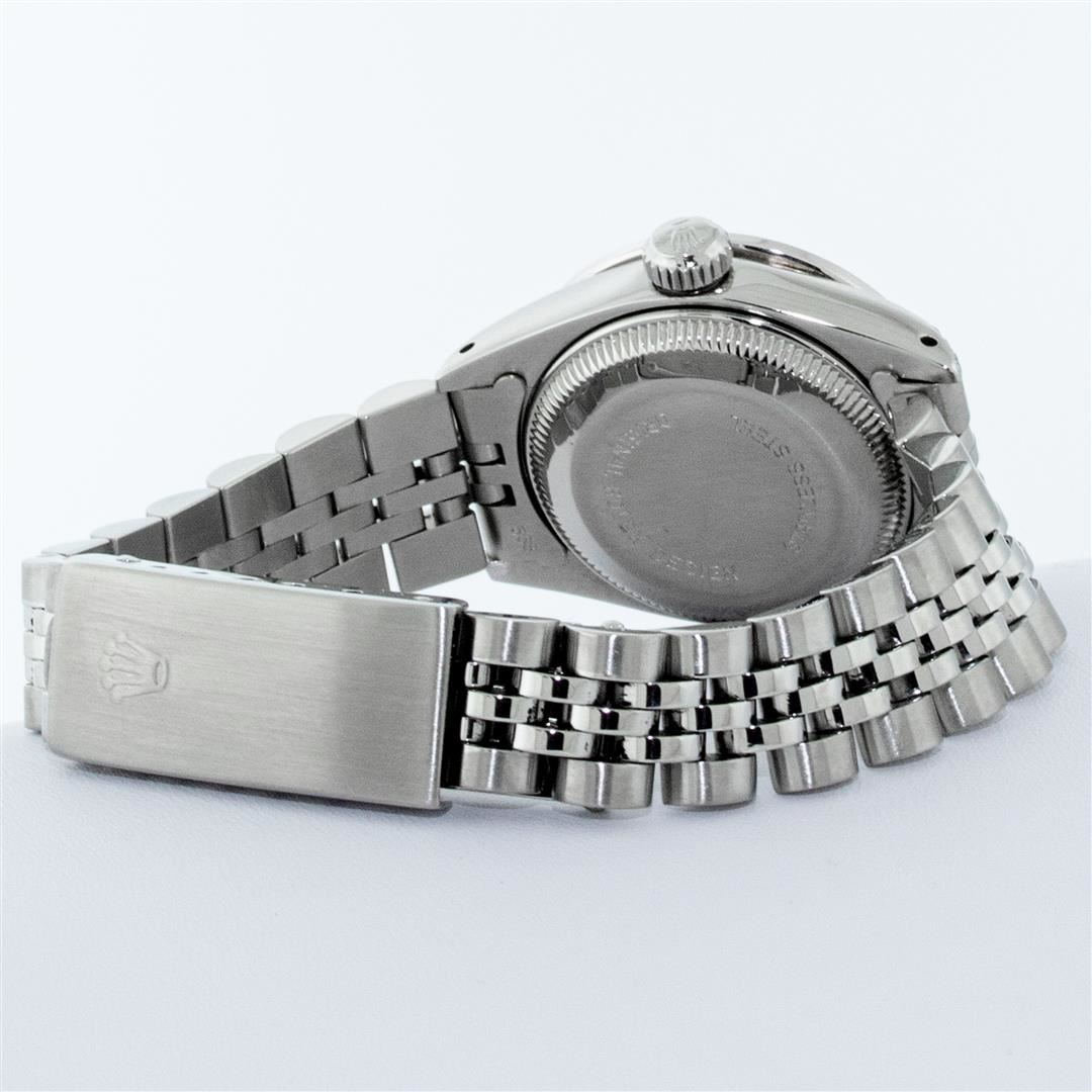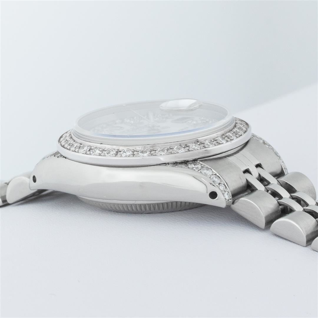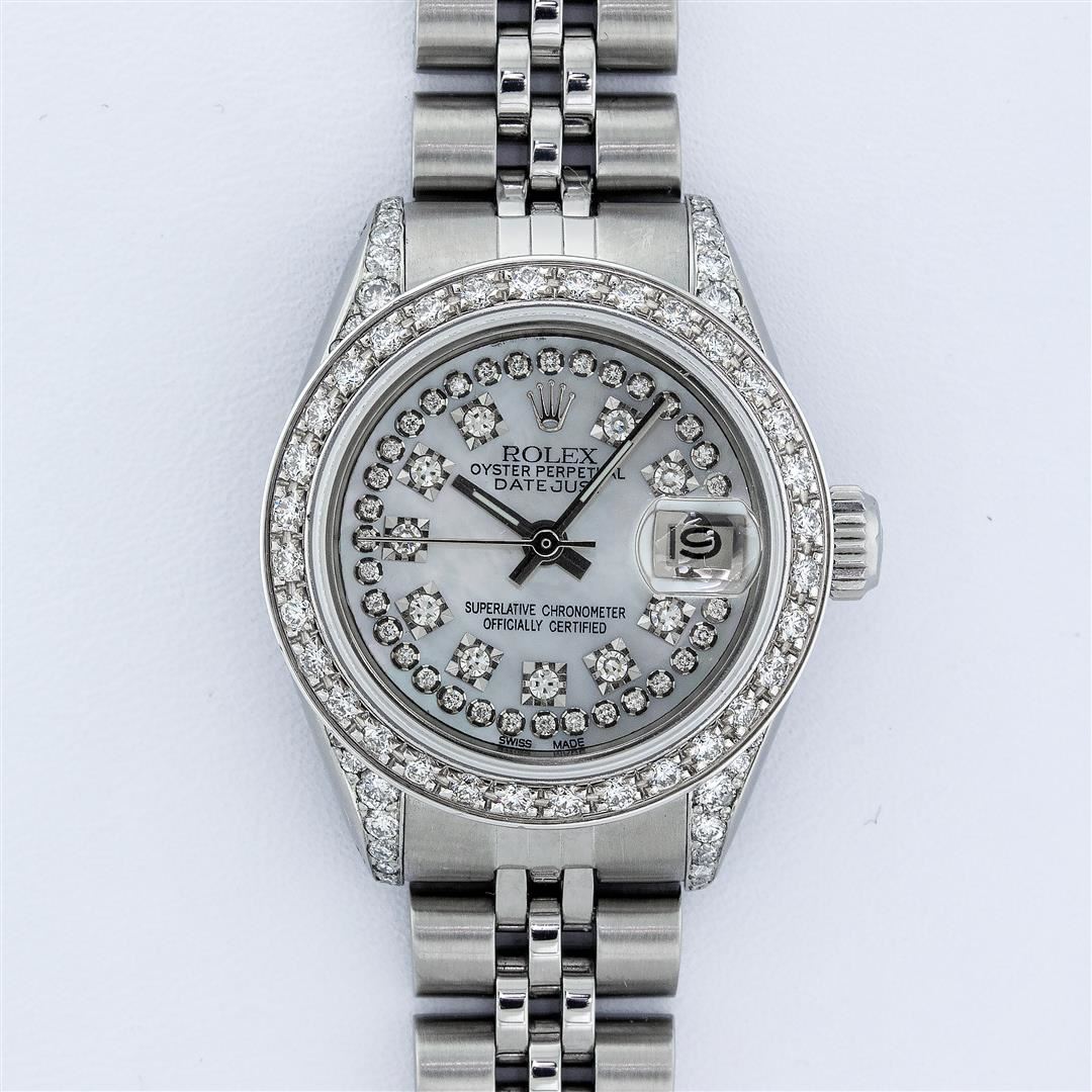 One Ladies Stainless Steel Rolex Datejust Polished Bright with Satin Finish, Serviced & Electronically Tested, Stainless Steel Case: 26mm, Stainless Steel Crown, Diamond Lugs: 24 Diamonds On Lugs, Clarity: SI-VS, Color: G to H. Custom Bezel: New 18K White Gold Diamond Beadset Diamond Bezel, Stone Count: 32 Diamonds, Total Weight .70 Carat, Clarity: SI-VS, Color: G to H. Custom Crystal: New Scratch Resistant Synthetic Sapphire Cyclops Lens. Custom Hands: New Luminescent Hands. Movement: Automatic Winding Movement. Custom Dial: Refinished Mother Of Pearl String Diamond Dial, 43 Diamonds in Dial G To H In Color, Clarity: VS. Date Window: 3 O'Clock Position Date Display, Model: Datejust. Condition: G-6 Extra Fine. Bracelet: Stainless Steel Jubilee Band. Bright Polish & Satin Finish. 6.0 Inch Length, Adjustable. Standard Clasp, With Rolex Logo. This Watch Has Been Serviced Time Tested And Is In Excellent Condition It Is Free Of All Scratches And Dents.