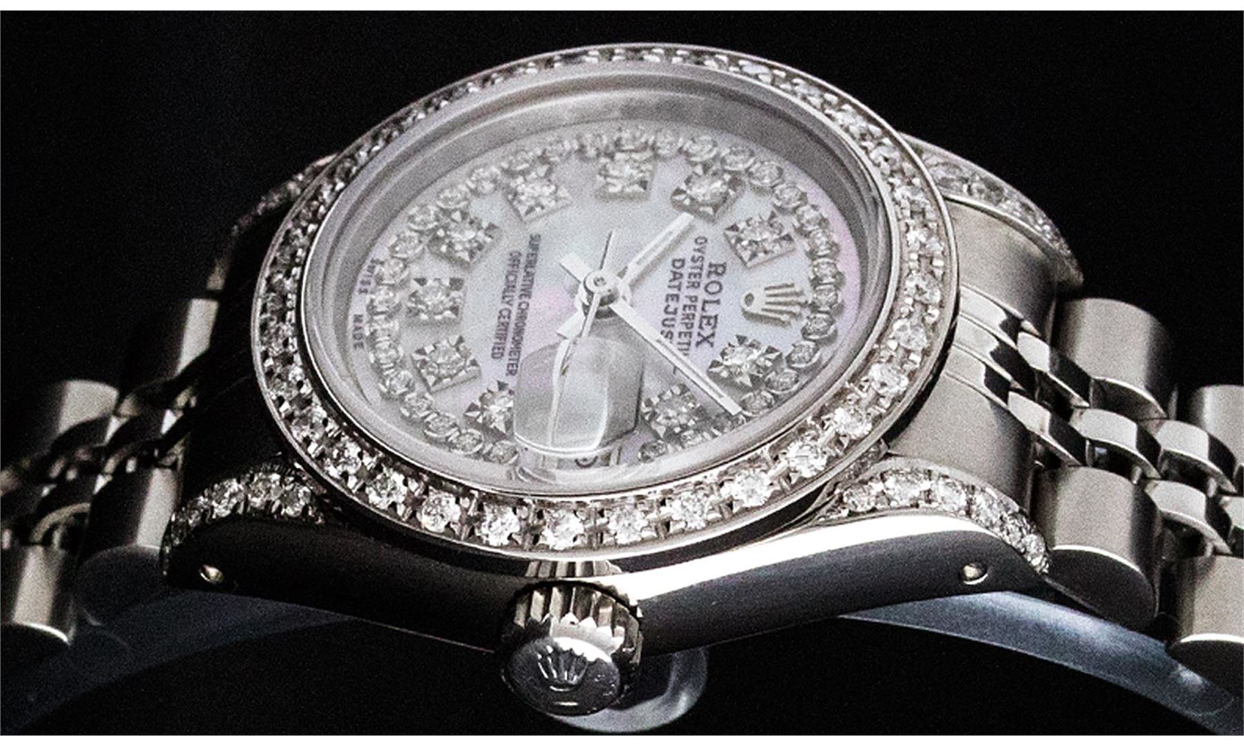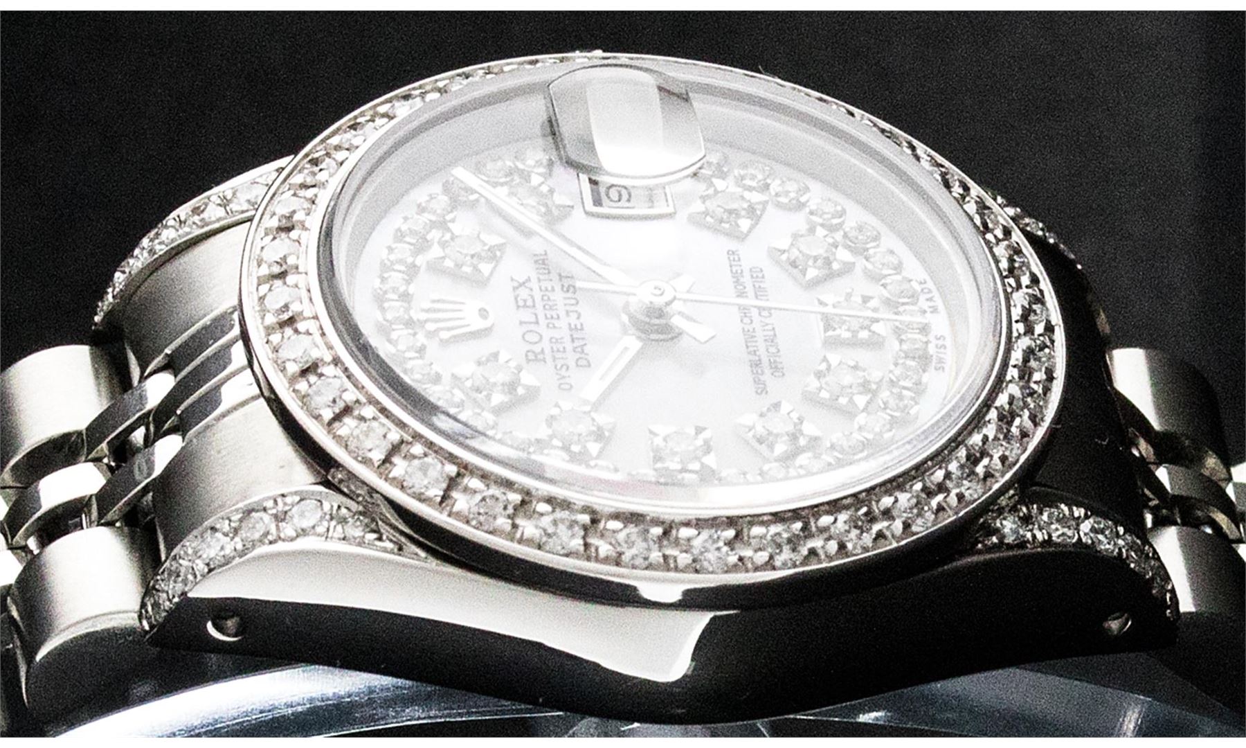 One Ladies Stainless Steel Rolex Datejust Polished Bright with Satin Finish, Serviced & Electronically Tested, Stainless Steel Case: 26mm, Stainless Steel Crown, Diamond Lugs: 24 Diamonds On Lugs, Clarity: SI-VS, Color: G to H. Custom Bezel: New 18K White Gold Diamond Beadset Diamond Bezel, Stone Count: 32 Diamonds, Total Weight .70 Carat, Clarity: SI-VS, Color: G to H. Custom Crystal: New Scratch Resistant Synthetic Sapphire Cyclops Lens. Custom Hands: New Luminescent Hands. Movement: Automatic Winding Movement. Custom Dial: Refinished Mother Of Pearl String Diamond Dial, 43 Diamonds in Dial G To H In Color, Clarity: VS. Date Window: 3 O'Clock Position Date Display, Model: Datejust. Condition: G-6 Extra Fine. Bracelet: Stainless Steel Jubilee Band. Bright Polish & Satin Finish. 6.0 Inch Length, Adjustable. Standard Clasp, With Rolex Logo. This Watch Has Been Serviced Time Tested And Is In Excellent Condition It Is Free Of All Scratches And Dents.