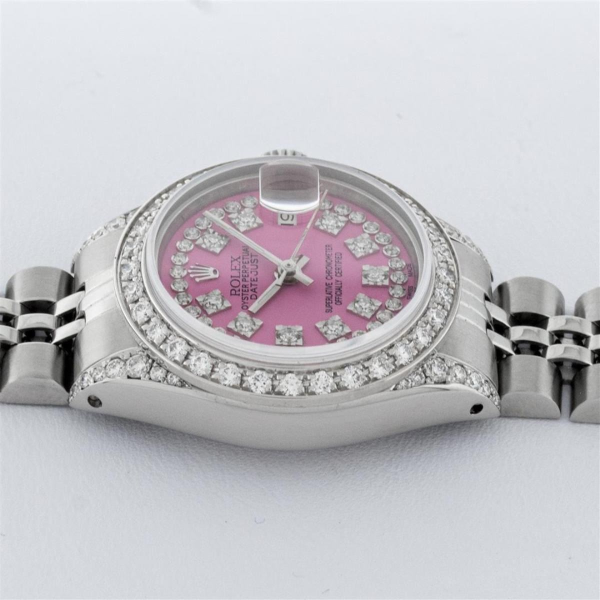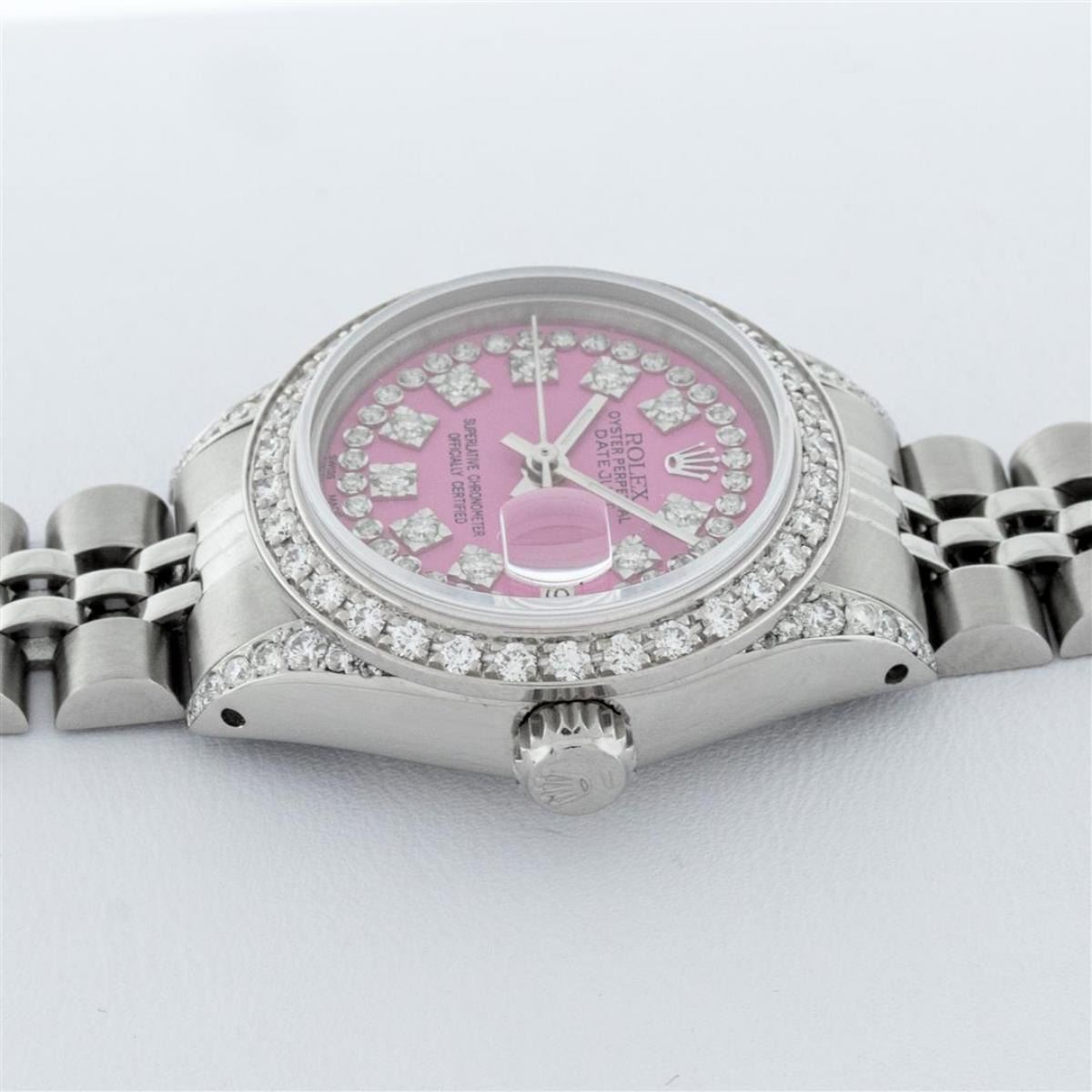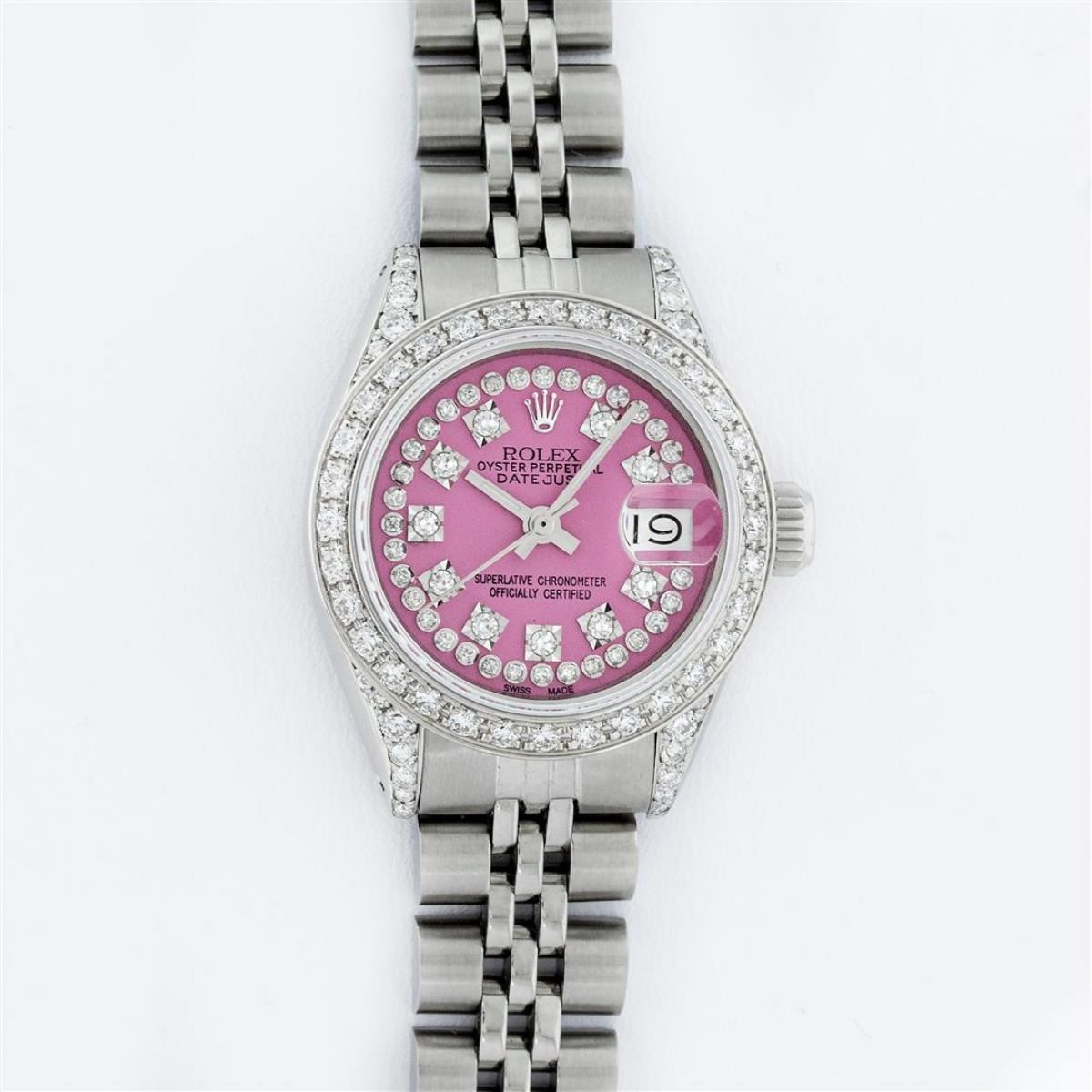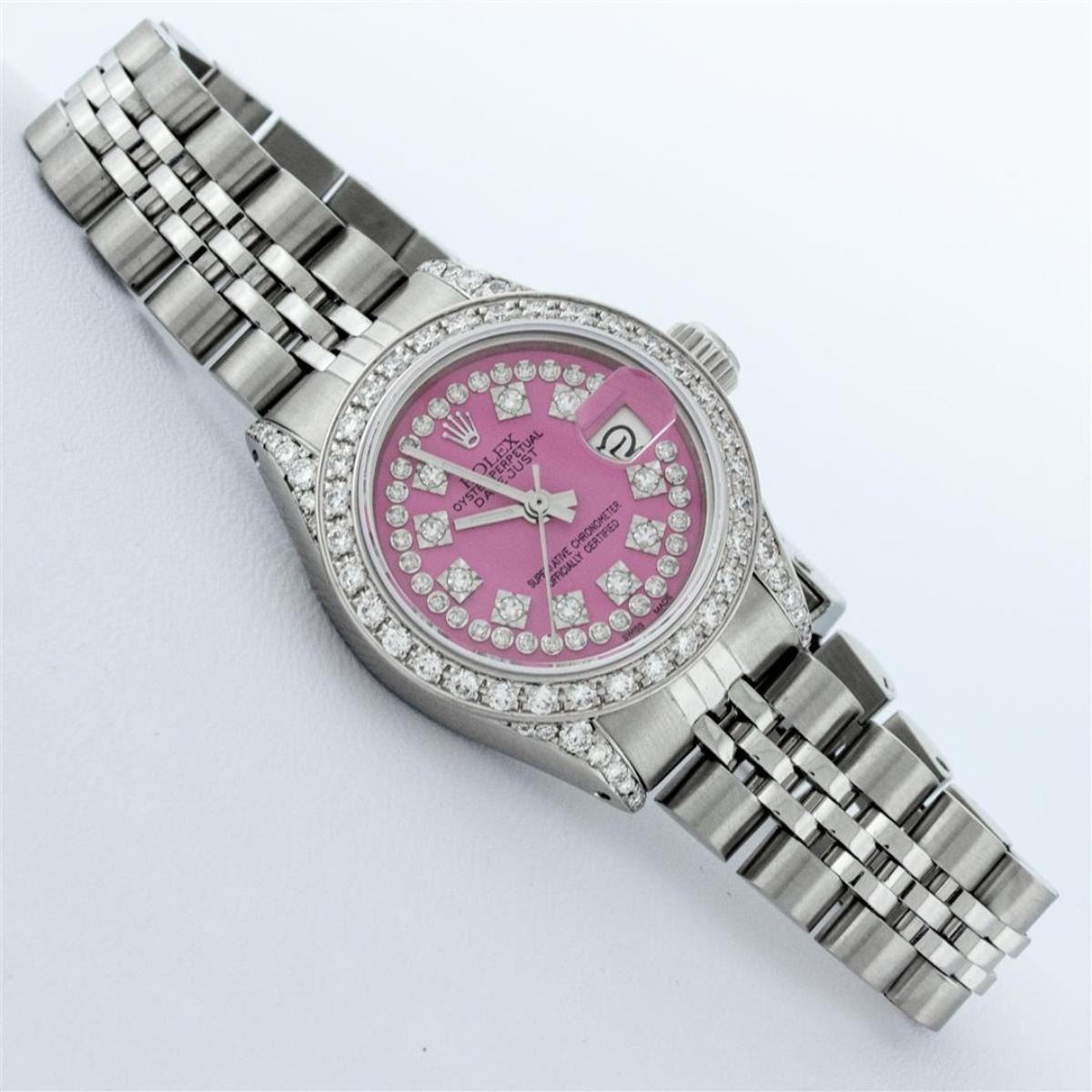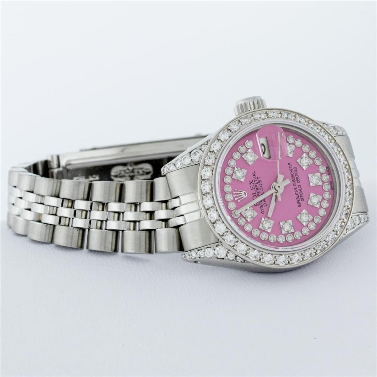 One Ladies Stainless Steel Rolex Datejust Polished Bright with Satin Finish, Serviced & Electronically Tested, Stainless Steel Case: 26mm, Stainless Steel Crown, Custom Diamond Lugs: 24 Diamonds On Lugs, Clarity: SI-VS, Color: G to H. Custom Bezel: New 18K White Gold Beadset Diamond Bezel, Stone Count: 32 Diamonds, Total Weight .70 Carat, Clarity: SI-VS, Color: G to H. Custom Crystal: New Scratch Resistant Synthetic Sapphire Cyclops Lens. Custom Hands: New Luminescent Hands. Movement: Automatic Winding Movement. Custom Dial: Refinished Pink String Diamond Dial, 43 Diamonds in Dial G To H In Color, Clarity: VS. Date Window: 3 O'Clock Position Date Display, Model: Datejust. Condition: G-6 Extra Fine. Bracelet: Stainless Steel Jubilee Band. Bright Polish & Satin Finish. 6.0 Inch Length, Adjustable. Standard Clasp, With Rolex Logo. This Watch Has Been Serviced Time Tested And Is In Excellent Condition It Is Free Of All Scratches And Dents.